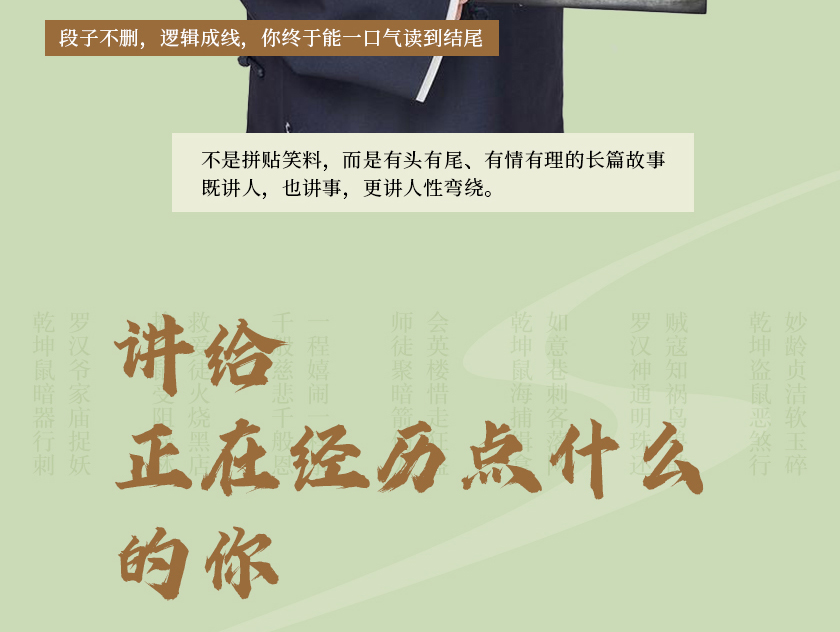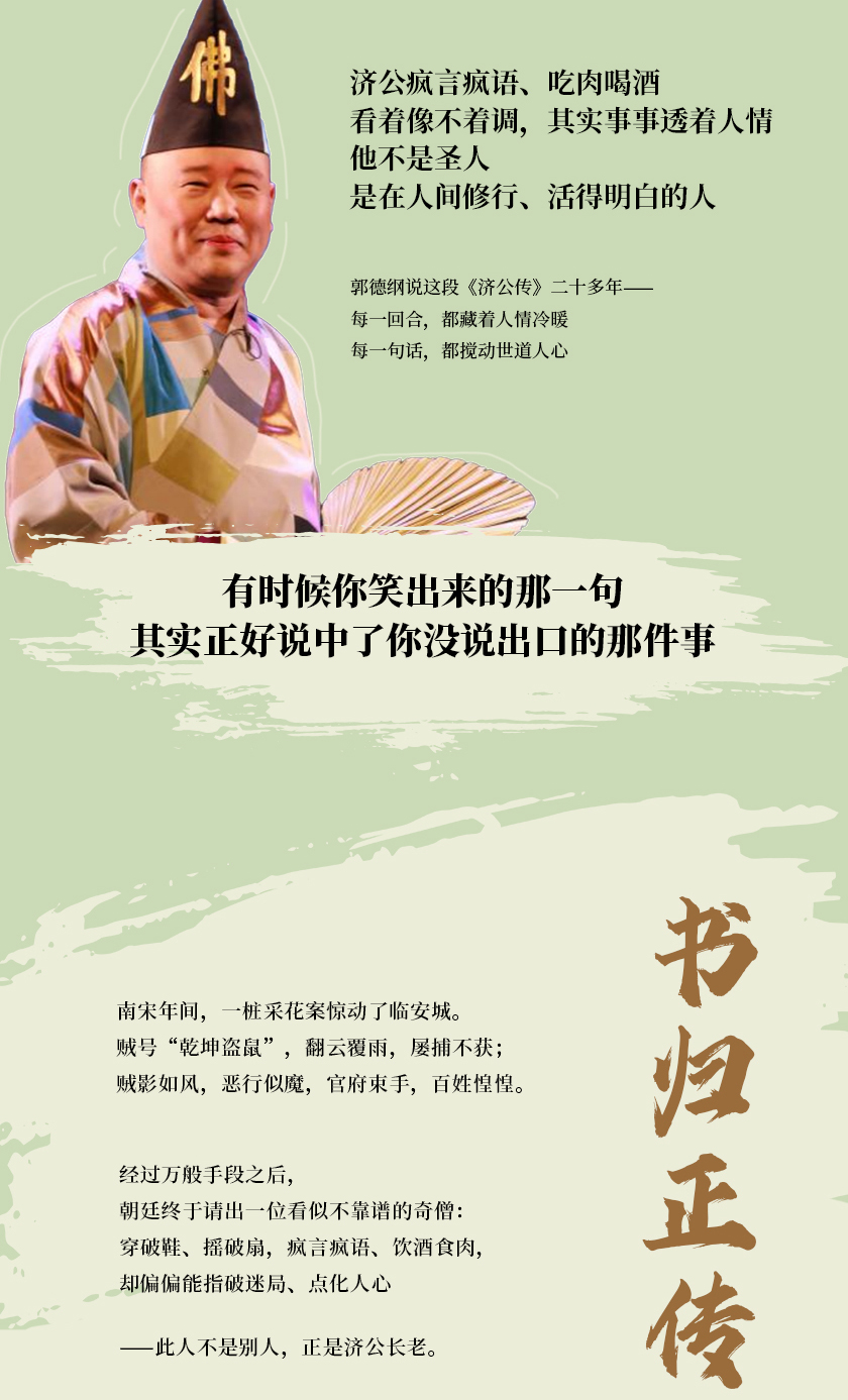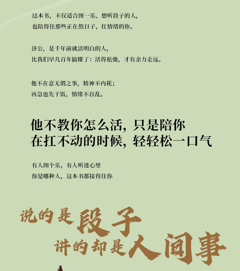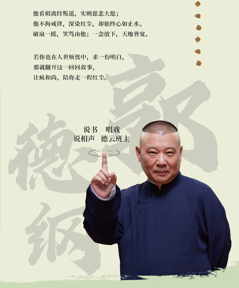 来一段儿:郭德纲说济公听郭德纲的单口,得听《济公传》;看郭德纲的作品,这本不能落下。说的是段子,讲的是人间事;若你正烦、正累、正扛着生活的重,那就翻开这一回回故事,让这本书,陪你走一程红尘