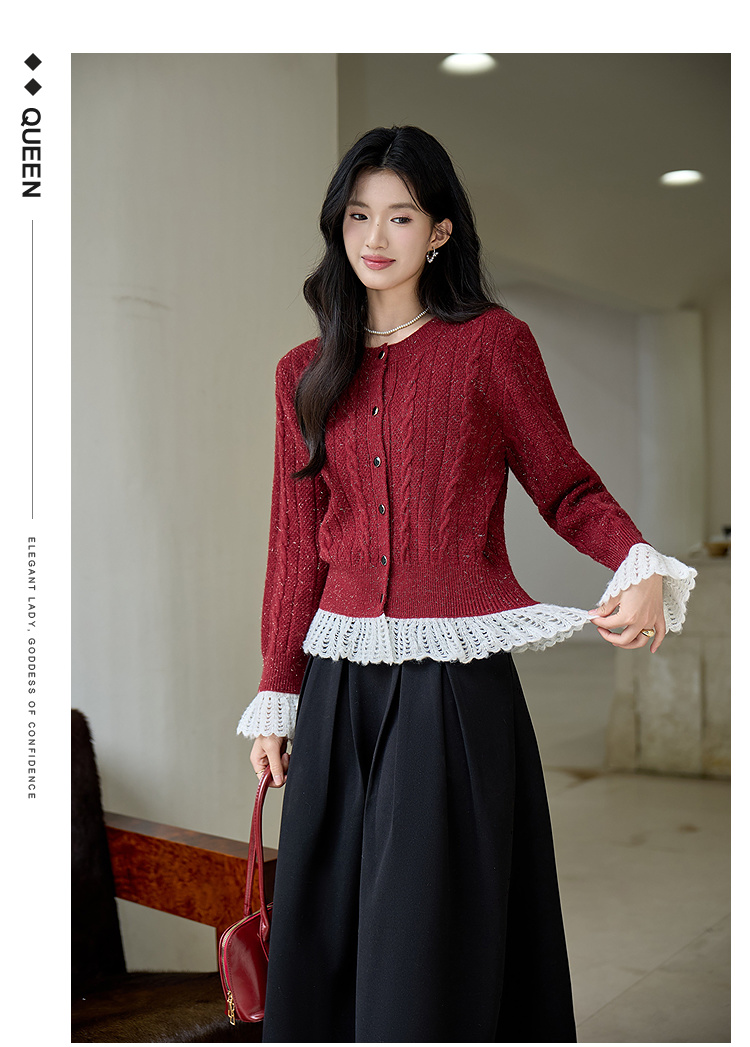 奢姿大码女装2025冬季时尚蕾丝撞色针织开衫胖妹妹气质减龄上衣9554670565