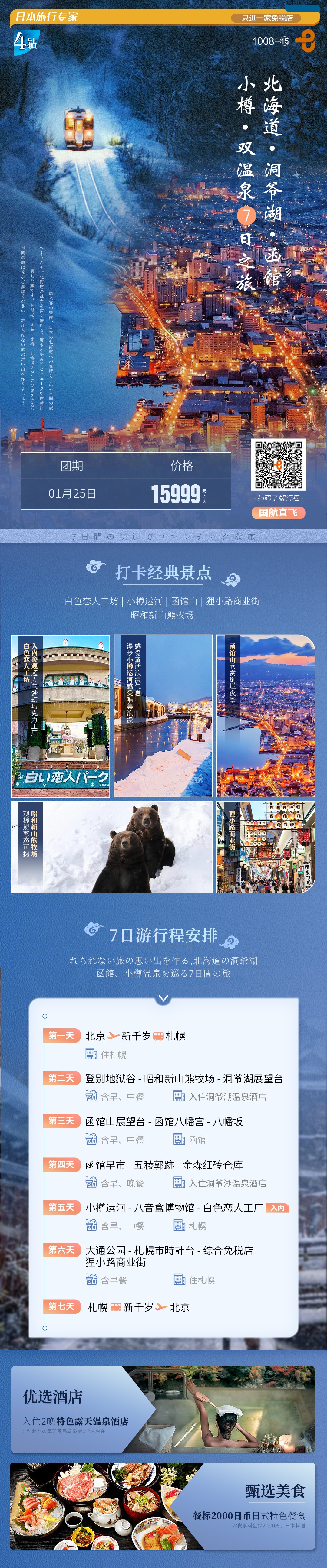 【北京出发】冬景如画7日 雪季限定 直飞6晚7天 北京国航直飞札幌航线当地4星住宿,2晚温泉酒店