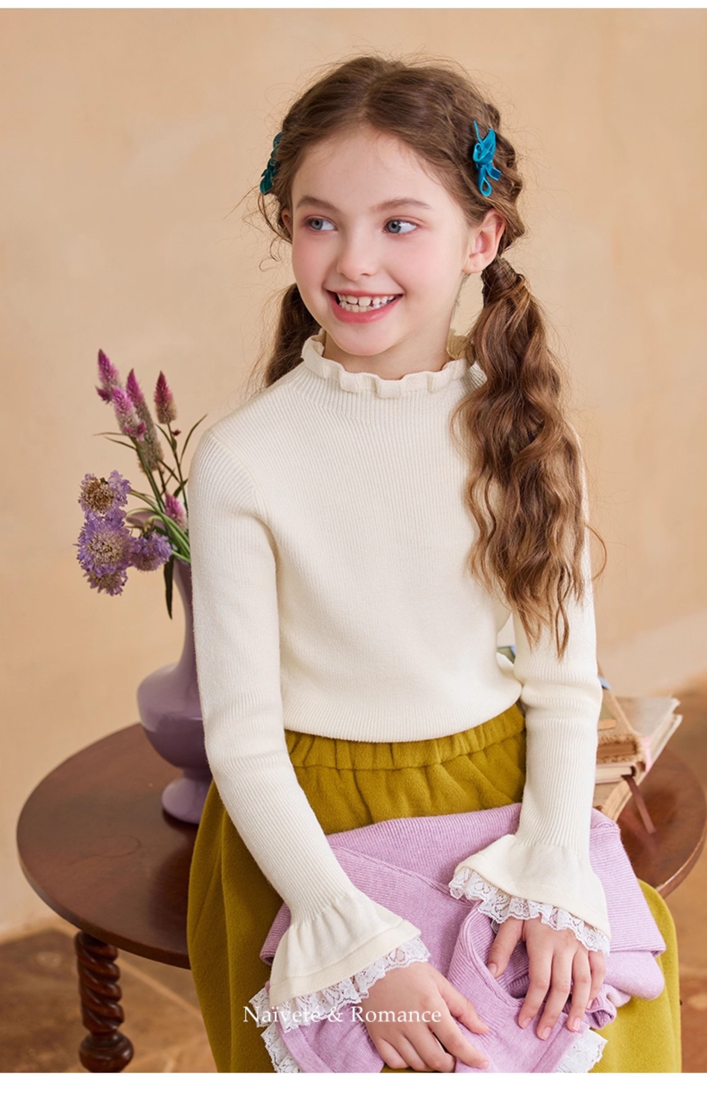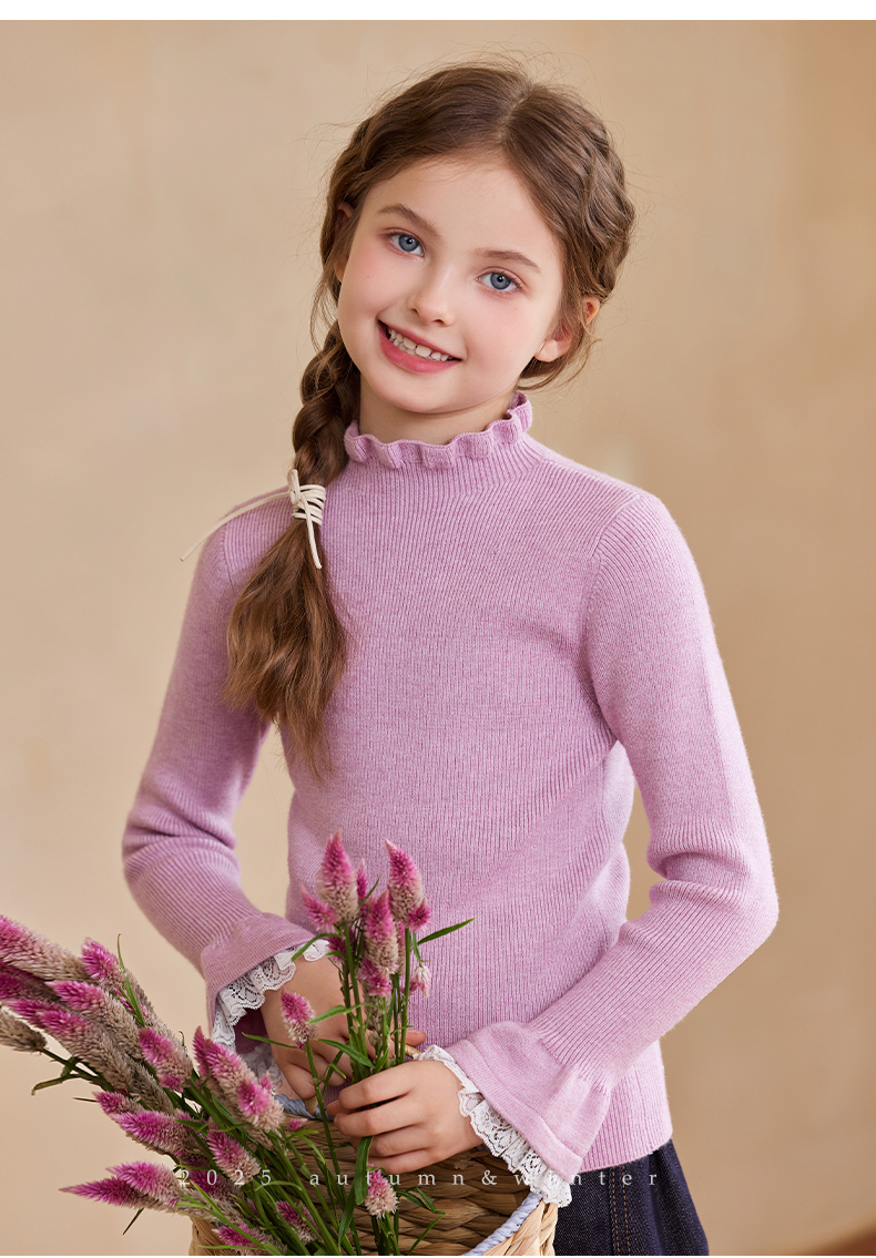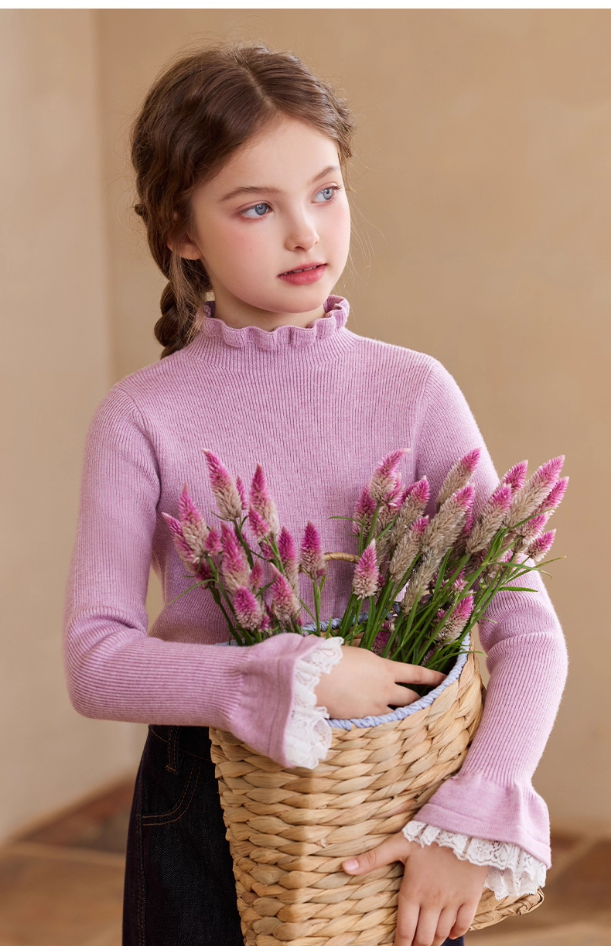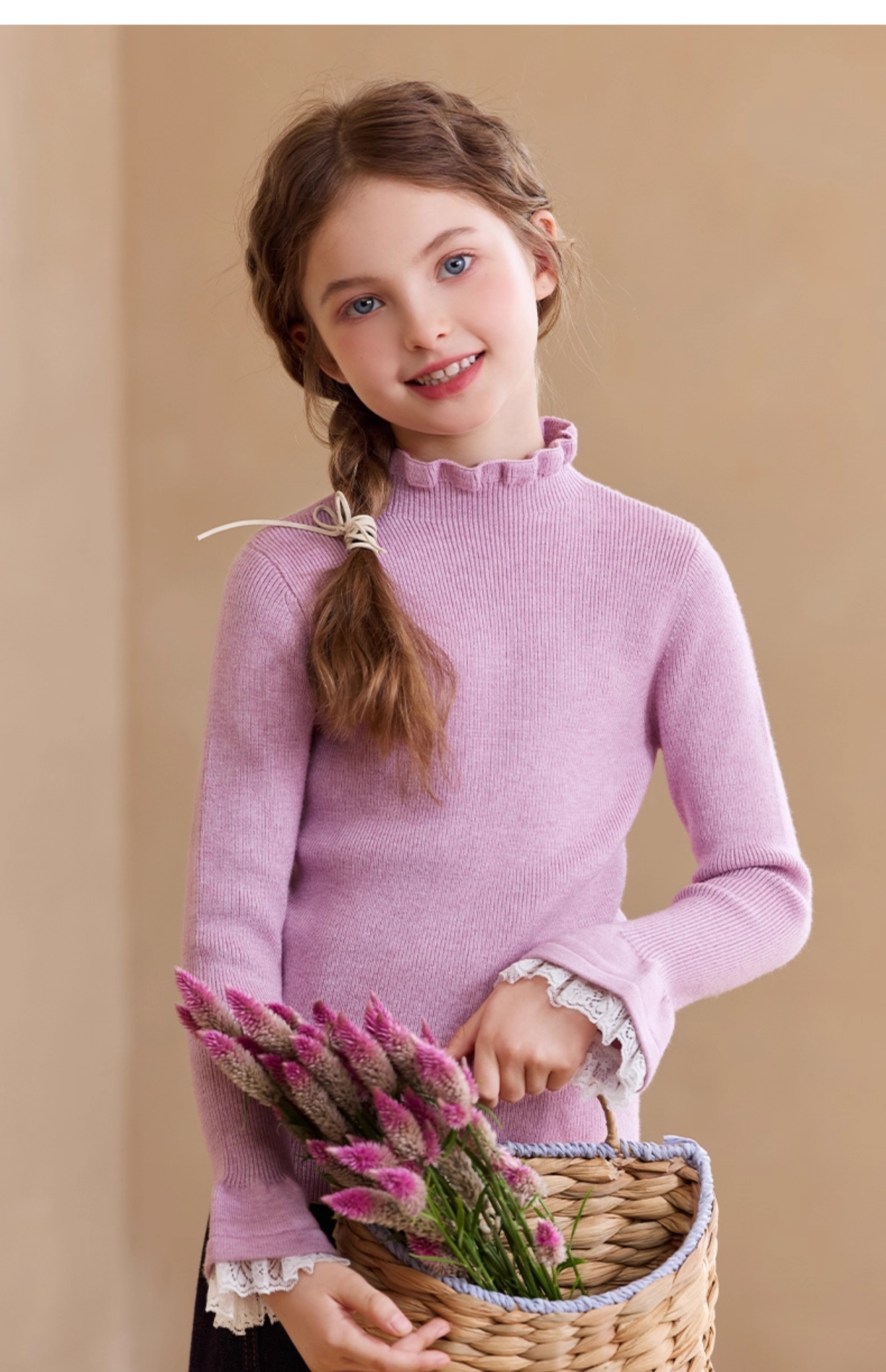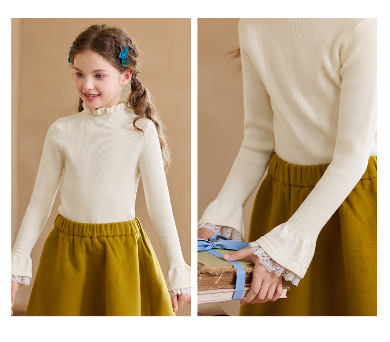 【云优选】Little Naive女童针织衫秋季半高领荷叶边甜美打底上衣儿童打底衫