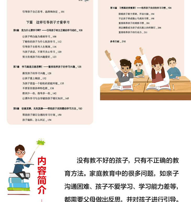 没有教不好的孩子,只有不正确的教育方法。家庭教育中的很多问题,如亲子沟通困难、孩子不爱学习、学习能力差等,都需要父母做出反思,并对孩子进行引导。
