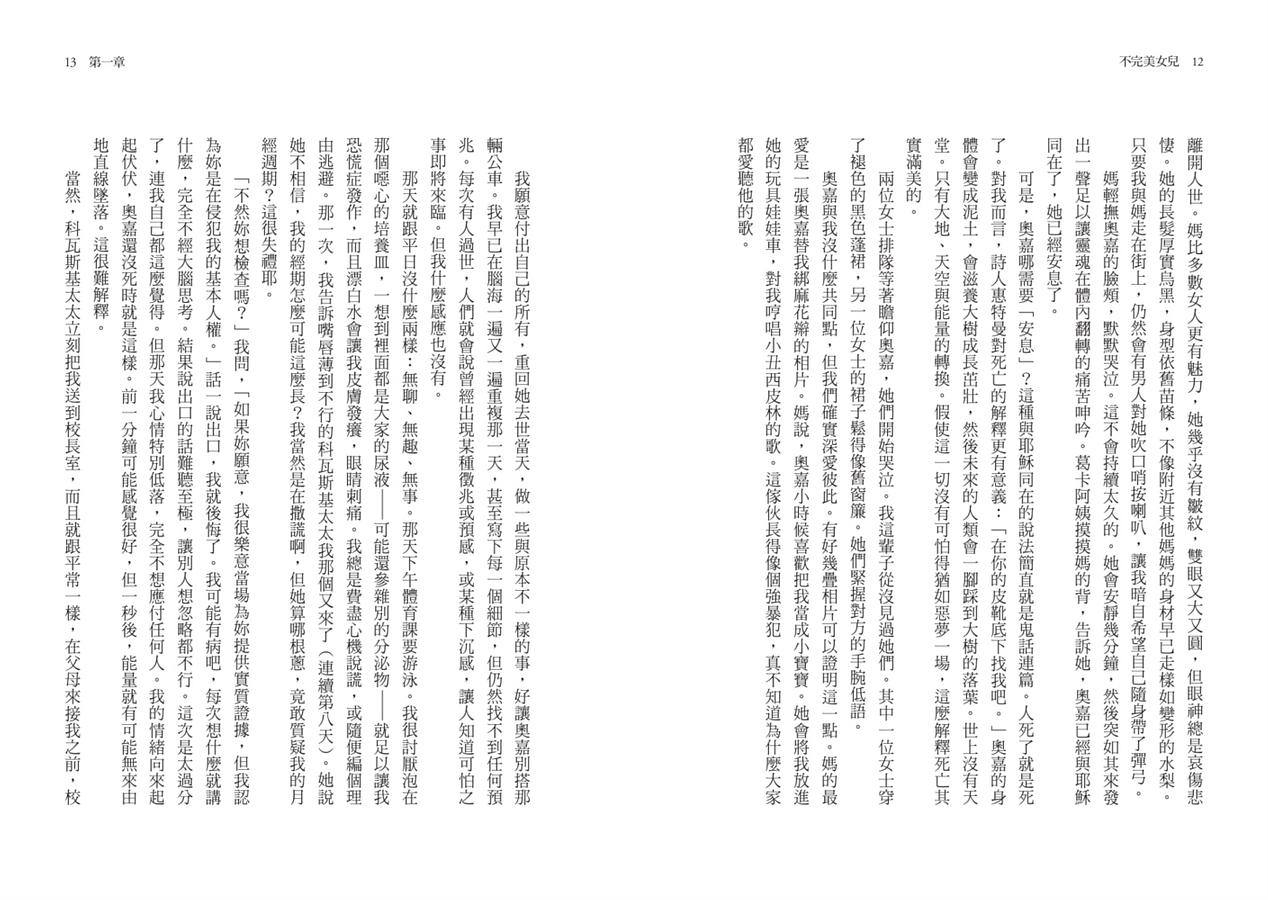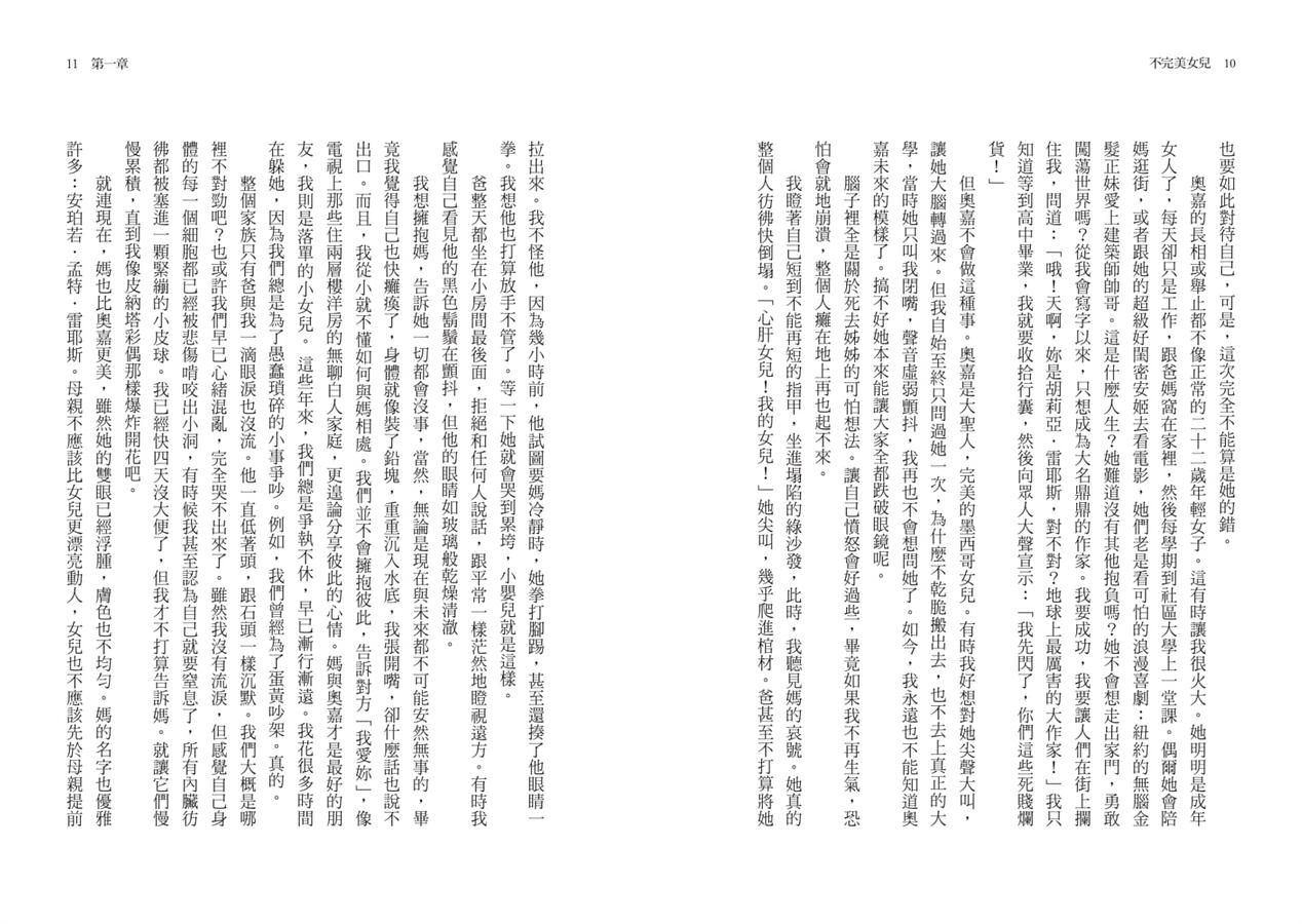 胡莉亞覺得自己完全搞不懂姊姊。她為什麼可以忍受呆板的工作、一成不變的生活,而且,總是不打扮?對情緒敏感又熱愛文藝的胡莉亞來說,只要有機會,一定要逃離無聊的家鄉,實現自己的寫作夢想。偏偏母親總是拿她們姊妹作比較,比起胡莉亞的我行我素,姊姊才是大家心中完美的女兒──務實貼心,很聽家人的話。然而,這樣的姊姊卻不在了。