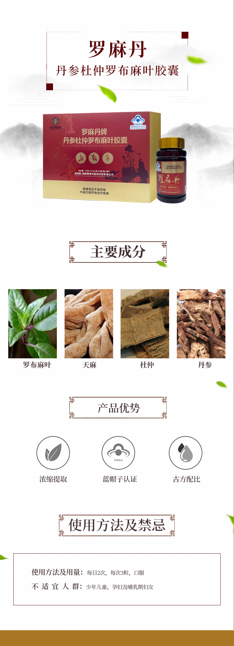 组件:罗麻丹降压胶囊0.4g/粒*45粒/瓶*2瓶/盒。共3盒