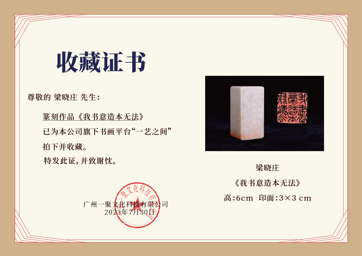 梁晓庄篆刻印章2.8x2.9x6CM丨我书意造本无法(取法秦诏汉金之间晓庄治石) 手工巴林石篆刻作品[原作编号:ZK002]