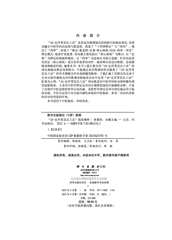 “动-定序贯范氏八法”是范冠杰教授提出的创新中医临床理论,该理论融合中医学的动态观与象思维,借鉴了“十四纲辨证”与“药对”,提出了“药串”,形成了“脉证-象思维-证素-核心病机-治法-药串一体化”辨证模式,临床疗效显著。其内涵主要包括以“核心病机”为靶点,以“证素”为辨证的基础和规范,以“药串”动态组合为组方思路,针对动态变化的证(核心病机)进行有序连贯的治疗。编者师从范冠杰教授,总结跟随老师临床经验,编著本书。本书上篇主要介绍“动-定序贯范氏八法”的理论基础及辨证用药特点,中篇通过知识图谱的形式梳理了“动-定序贯范氏八法”的学术渊源及学术思想嬗变脉络,下篇汇编了范师及其众弟子在内分泌代谢病及内科疑难杂病临床诊治中运用“动-定序贯范氏八法”医案及心得。“动-定序贯范氏八法”理论既是对中医学的恒动观和整体观的创新继承,又是对中医学辨证论治内在规律更深层次地精准诠释,丰富了近现代中医思维的哲学认知内涵,是把哲学理论具体可视化地运用于临床实践,不仅可运用于内分泌代谢性疾病的中医临床,更对一些内科杂病的诊治有明显的疗效。