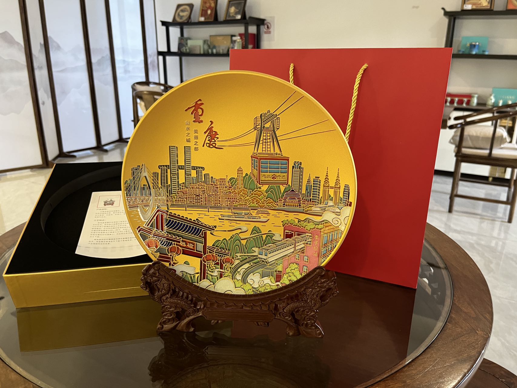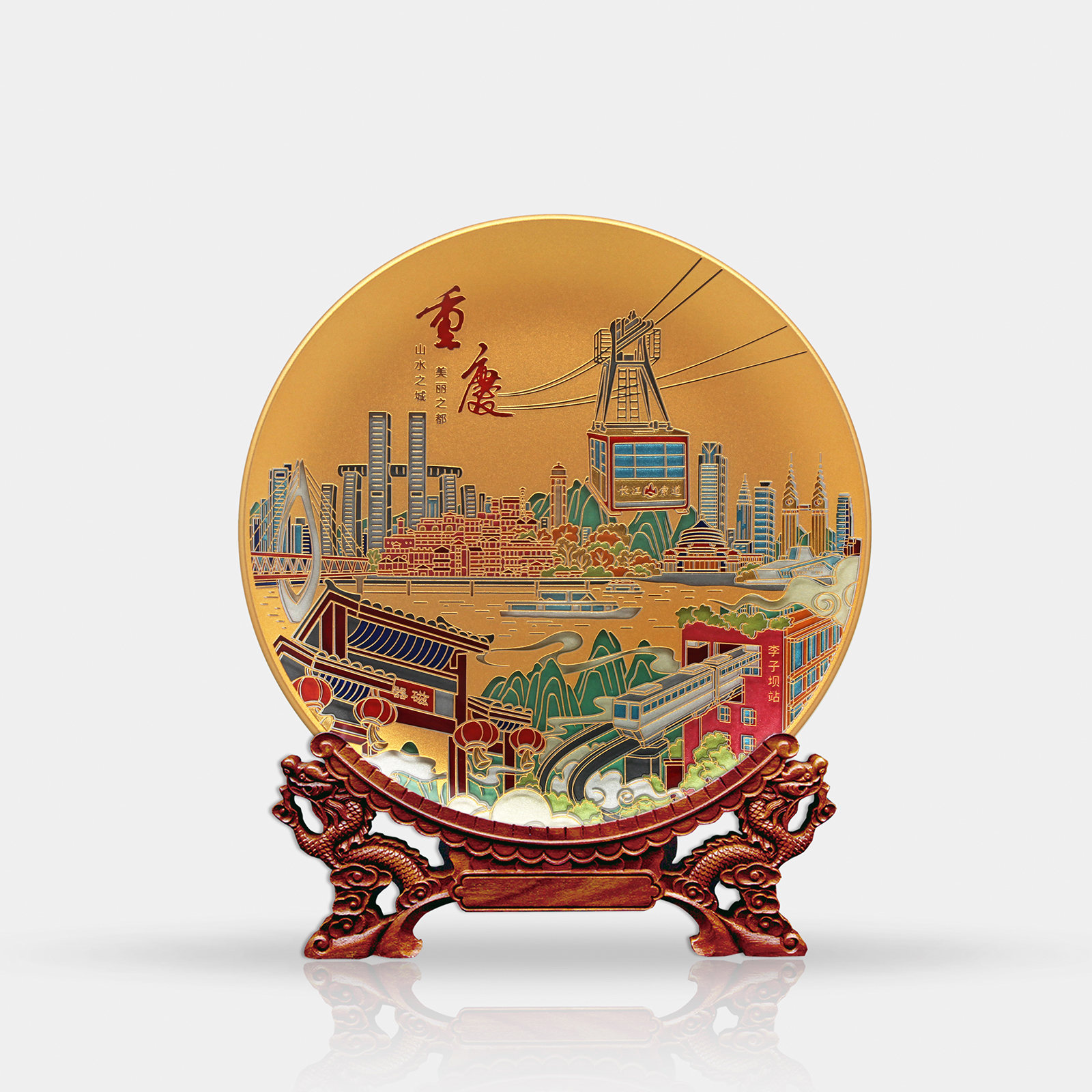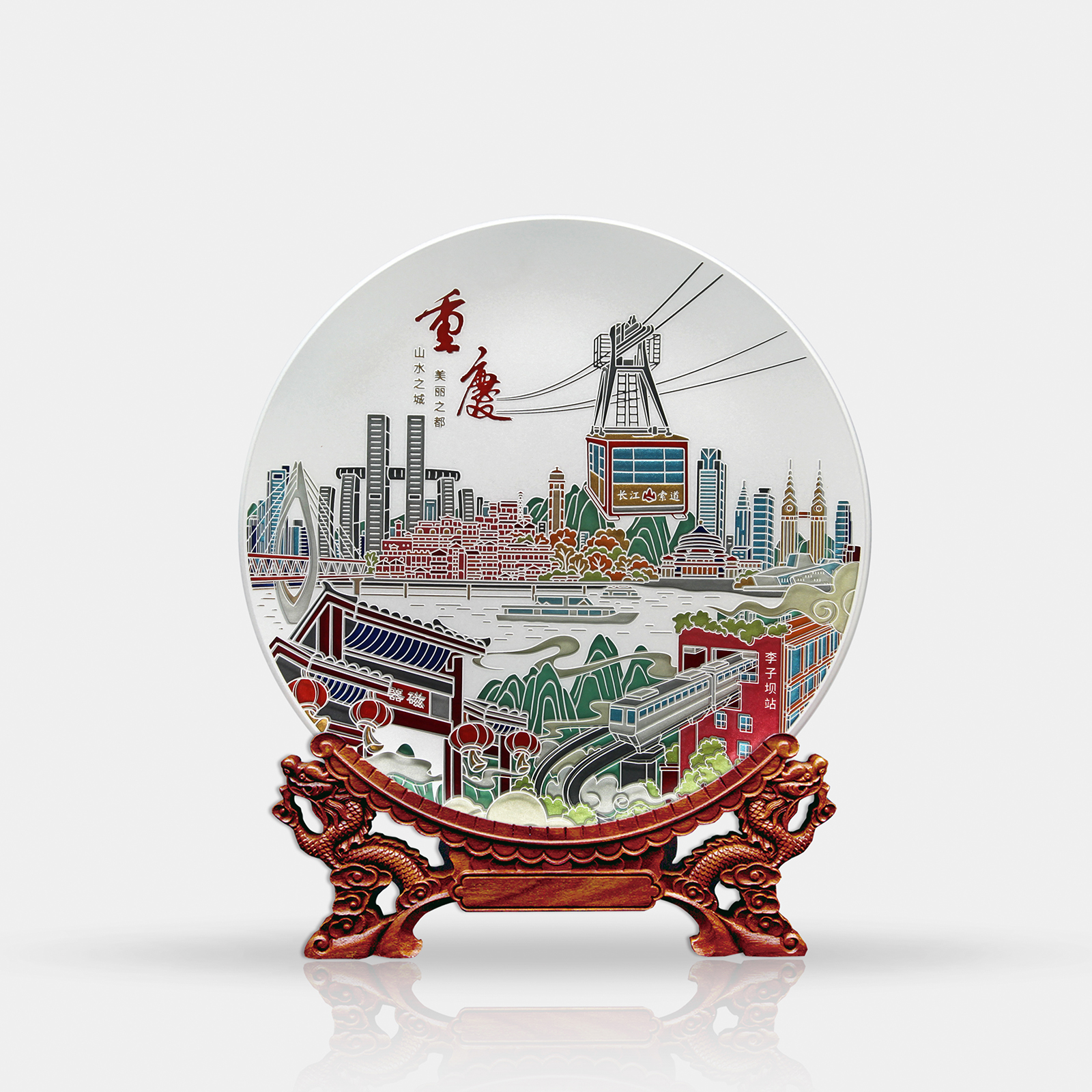 以雅琅晶的双面雕刻,手工彩绘制作工艺,着重突出山城重庆地标性的建筑风景,重庆城市风采融为一体,包含了磁器口、李子坝、长江索道、洪崖洞、来福士、解放碑、大礼堂等。一盘包罗万象,尽显城市风光。