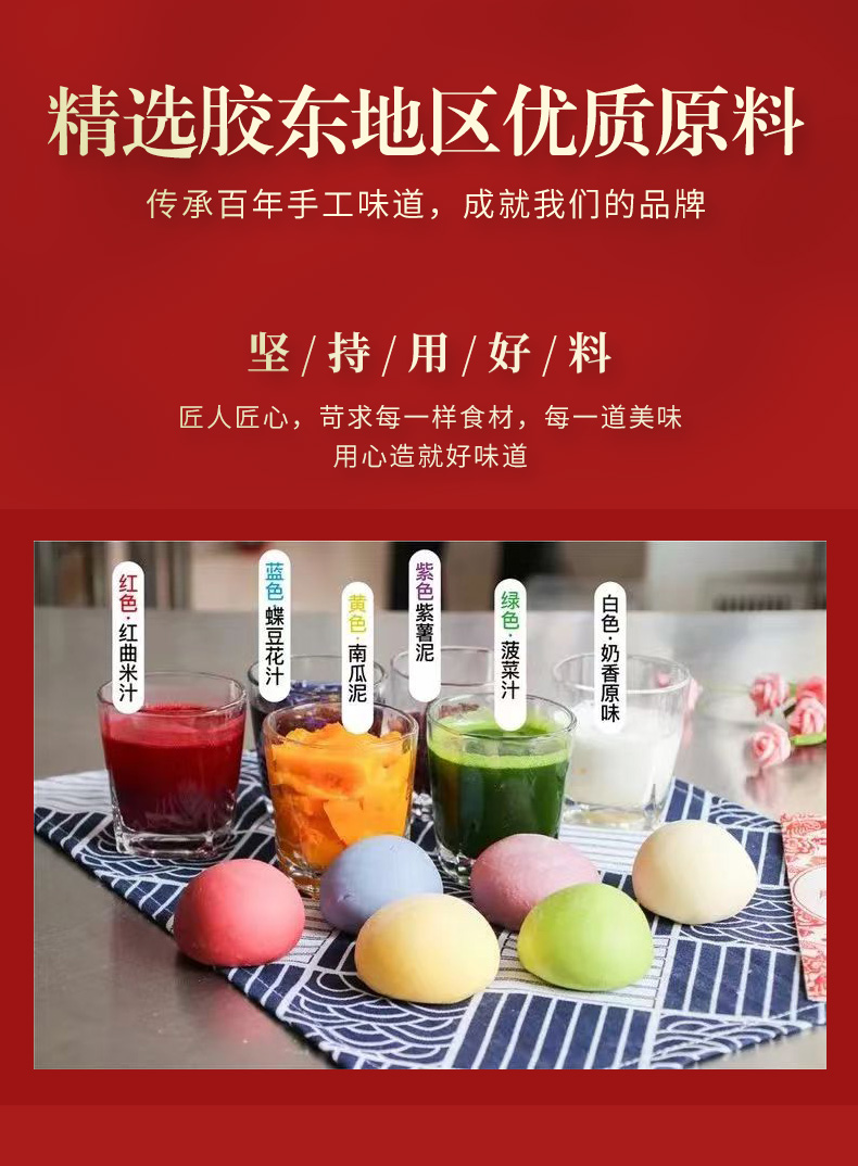 【颜色】红色-红曲米汁、绿色-菠菜汁、黄色-南瓜泥、蓝色-蝶豆花汁、紫色-紫薯泥、白色-奶香原味
