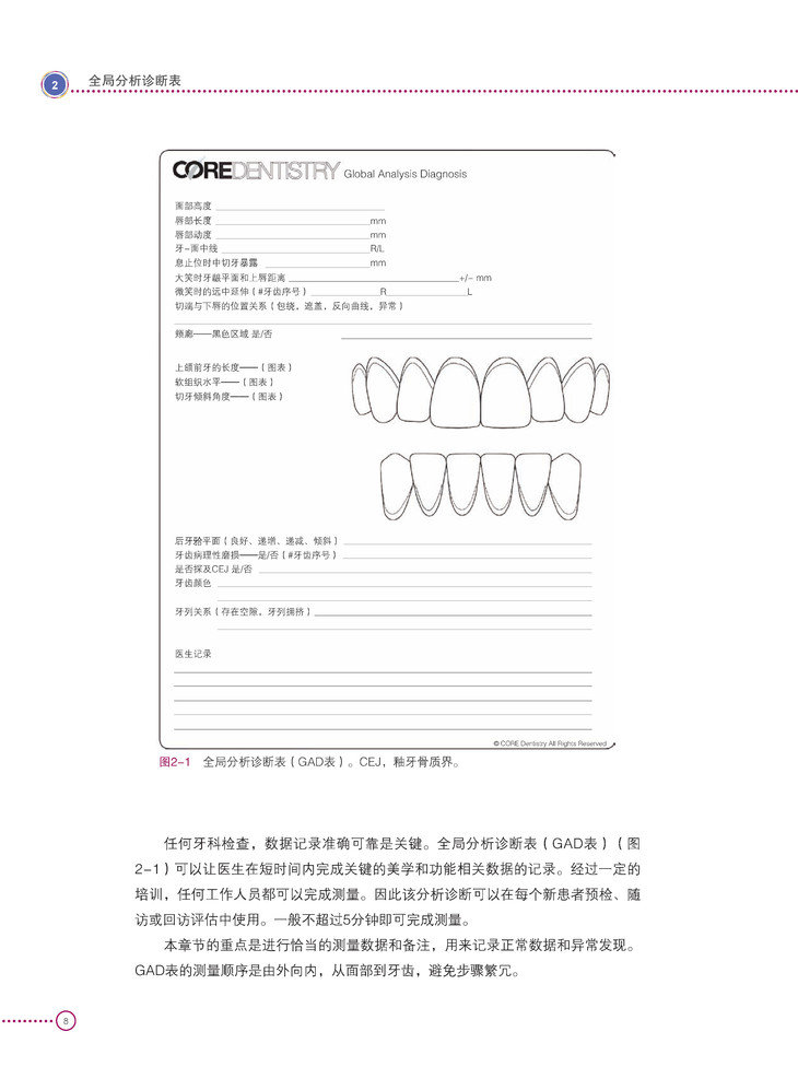 以往治疗时,我们的美学审美体系里往往强调上颌中切牙切缘的位置须与唇关系协调,但最终治疗的结果是,虽然切缘的位置完美,但由于忽视牙龈平面异常这一问题,疗效往往存有遗憾。因此,本书《全局诊断——牙科诊断和治疗计划的新视角》中的新视角就是CORE问题出发,确定牙龈位置异常的病因。一旦病因确定,那么就可以选择有限的治疗方法来纠正这一异常。全书围绕的5个CORE问题分别为:1. 面部比例和骨骼关系如何?2. 上唇长度和动度是多少?3. 牙龈平面和水平面之间的关系如何?4. 上颌中切牙的临床牙冠长度是多少?5. 在龈沟内能否探及釉牙骨质界? 全书共13章,以全局地视角CORE问题提问的方式,主要介绍了口腔常规诊断,以及不同诊断所对应的治疗方法,包括美学牙冠延长术、组织移植、成人牙列的牙槽骨压低治疗、牵引助萌术、正颌手术、牙颌面整形等。第12章介绍了CORE问题PPT模板,以及如何使用13张照片完成模板,其内容都在本书附带的光盘中收录。此PPT模板可用于牙科研究时制作演示文稿,也可以用于患者相关信息的追踪。最后一章,为5个经典病例的展示。书中还介绍了依靠微整形手段帮助口腔治疗达到更好的治疗效果。