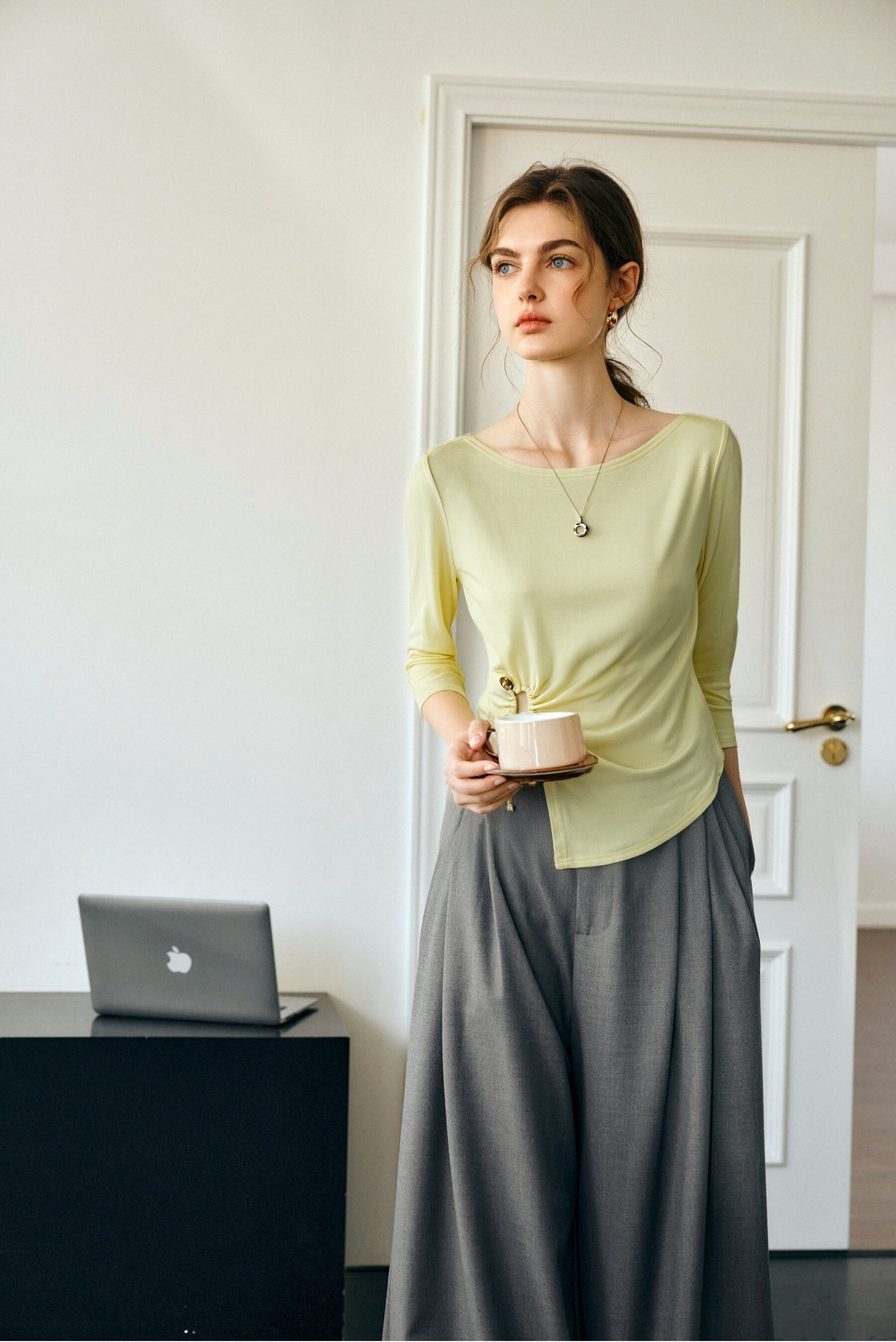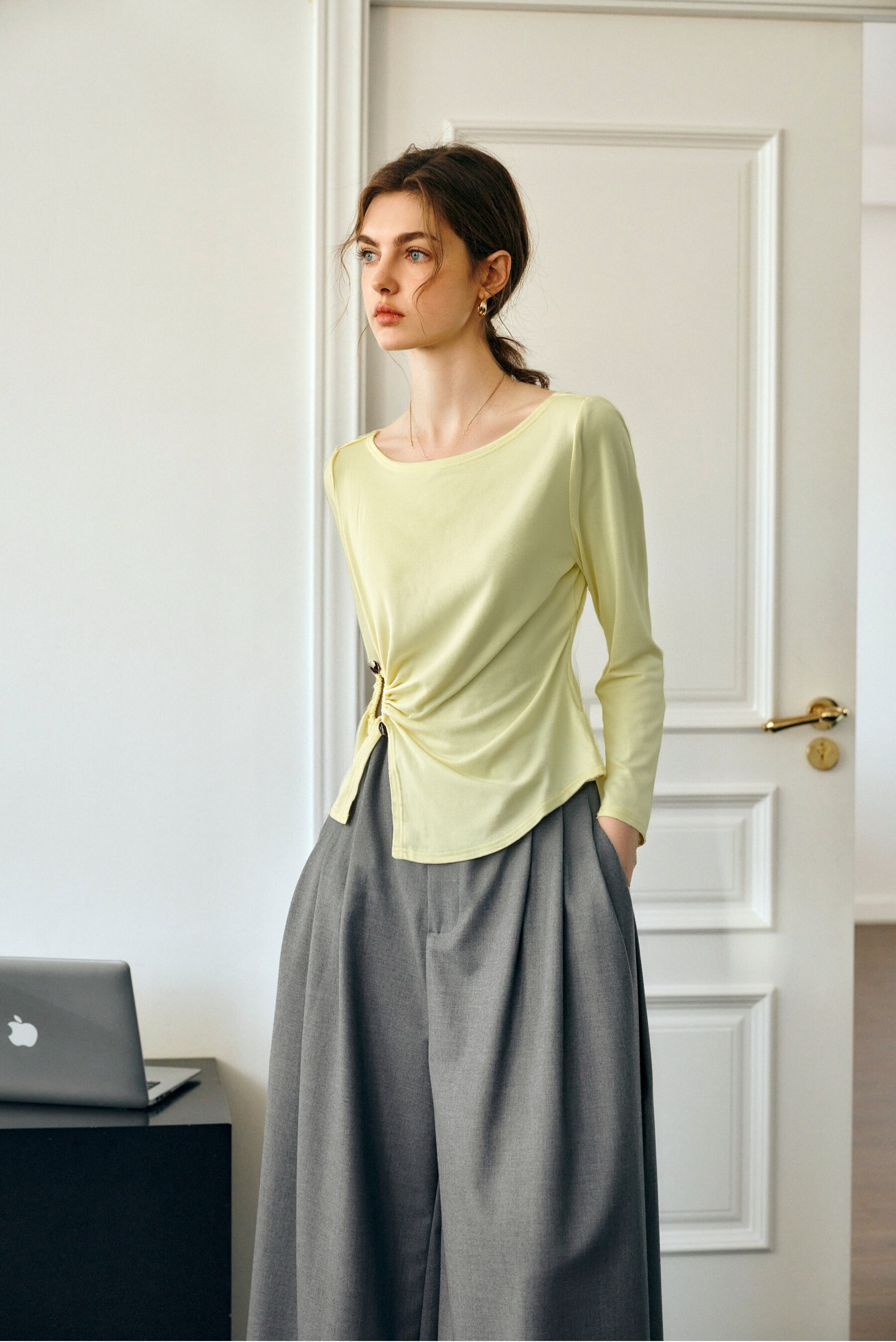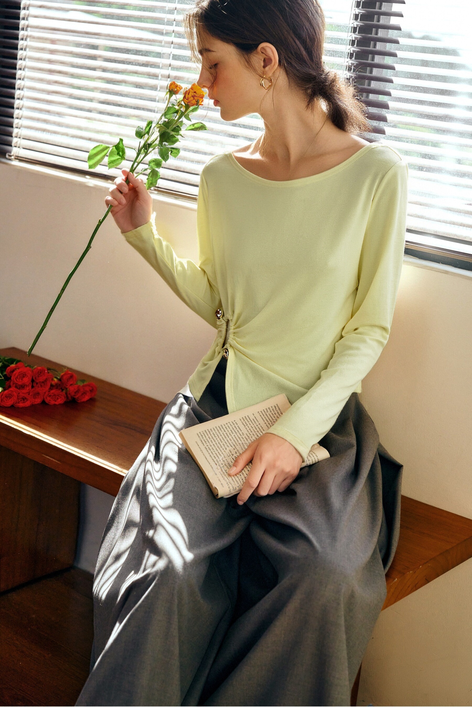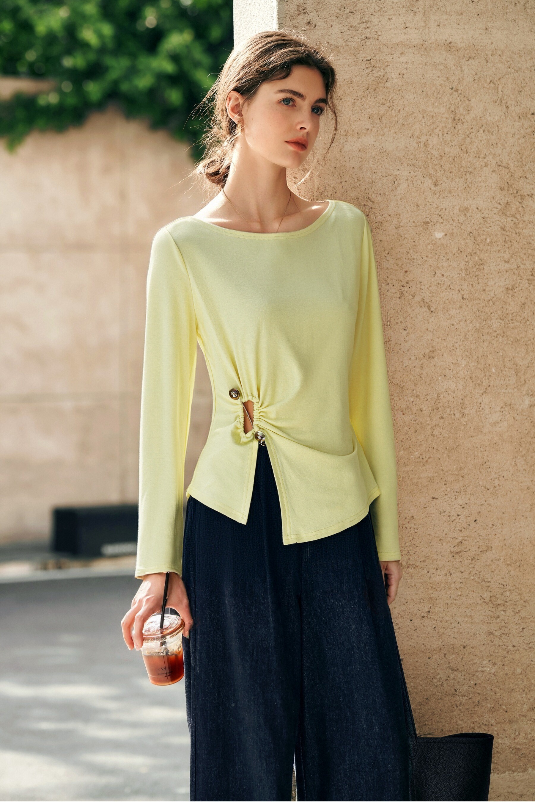 欧芮儿2025新款冬季针织修身长袖T恤浅黄色百搭女