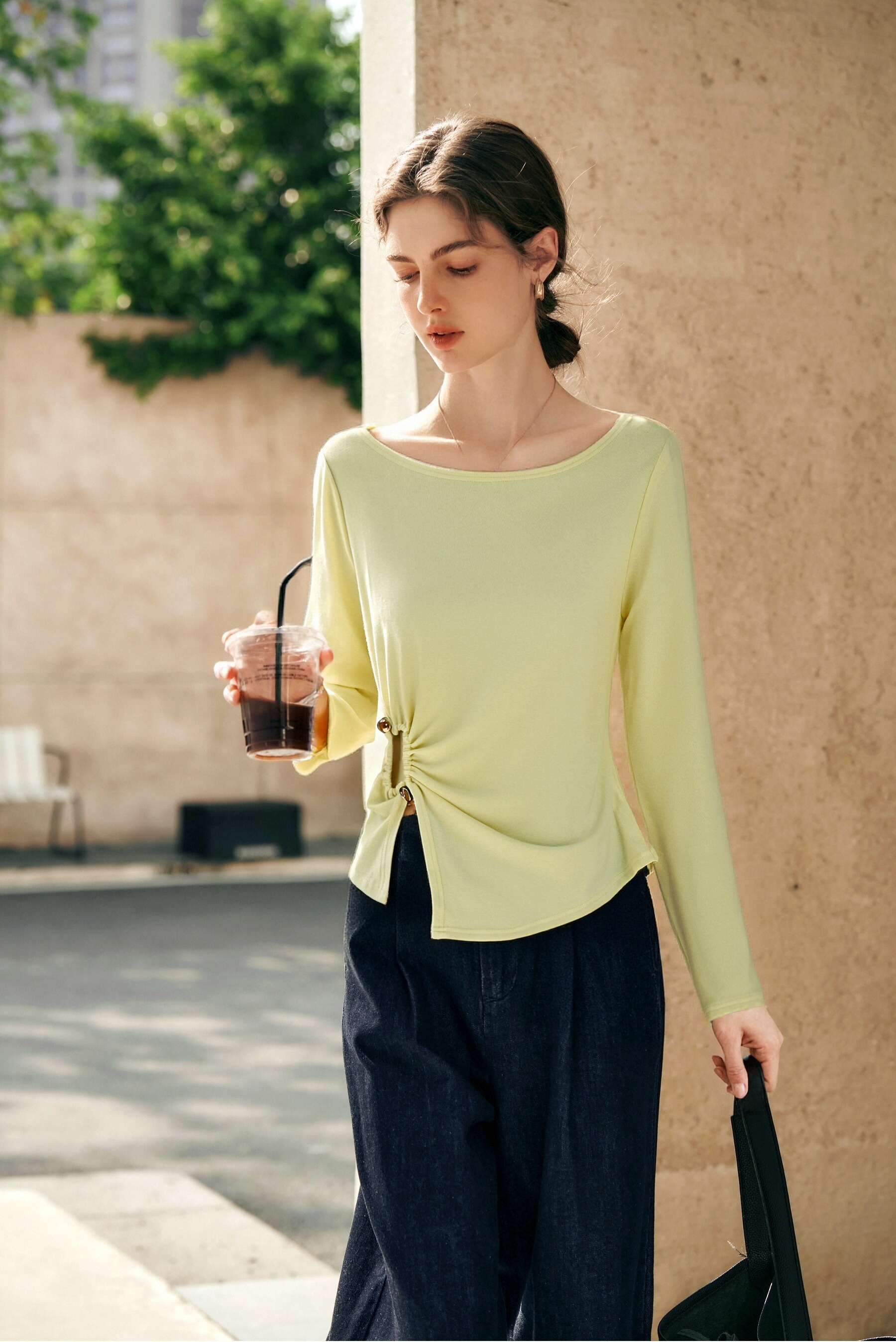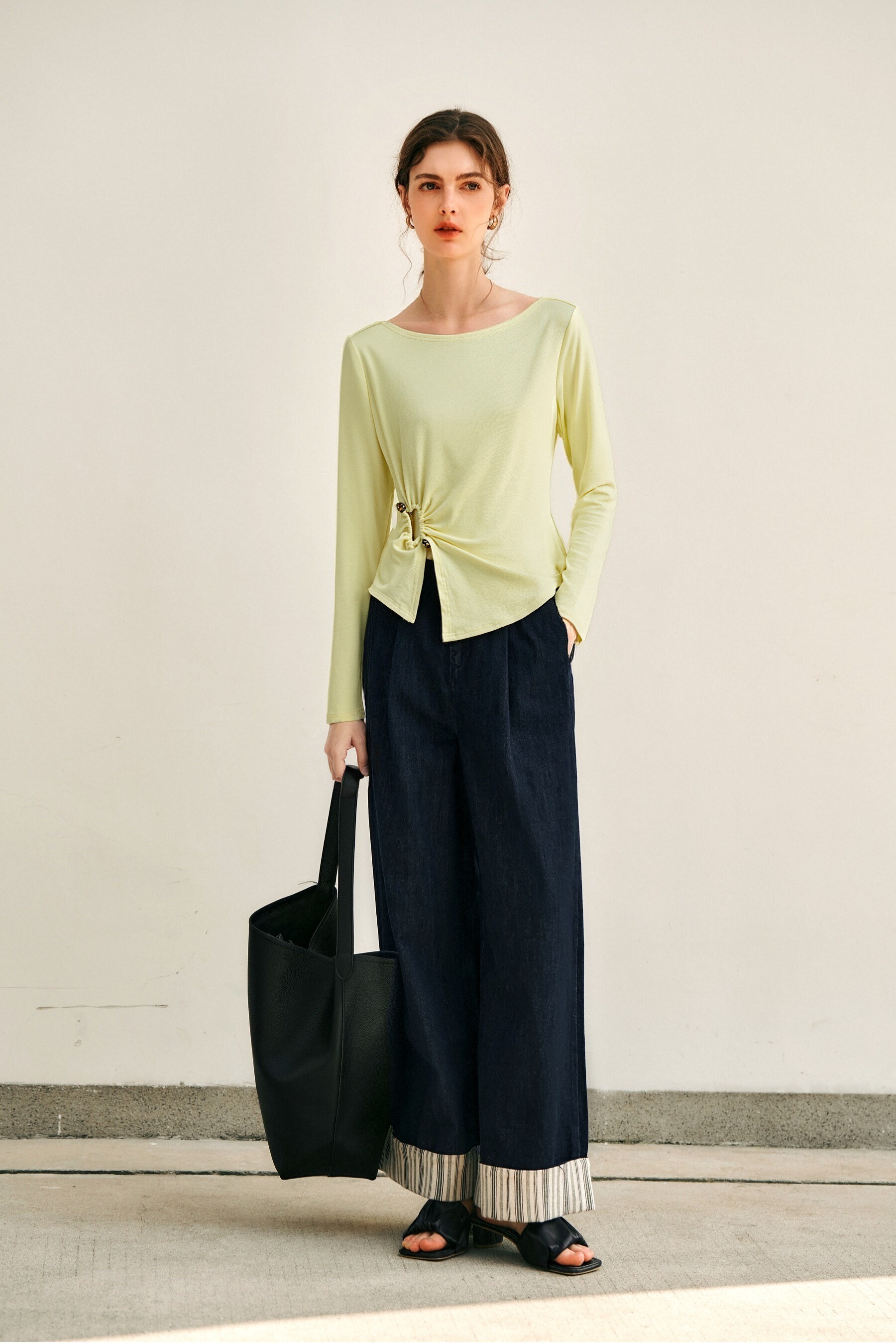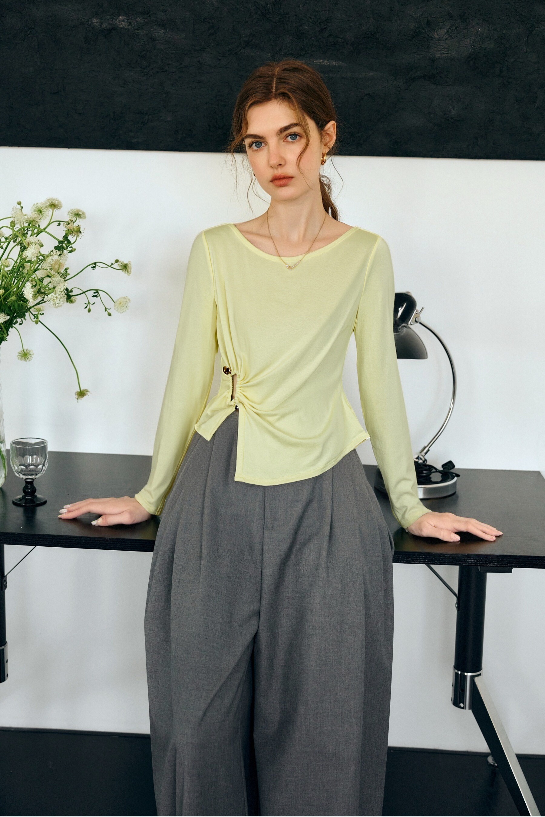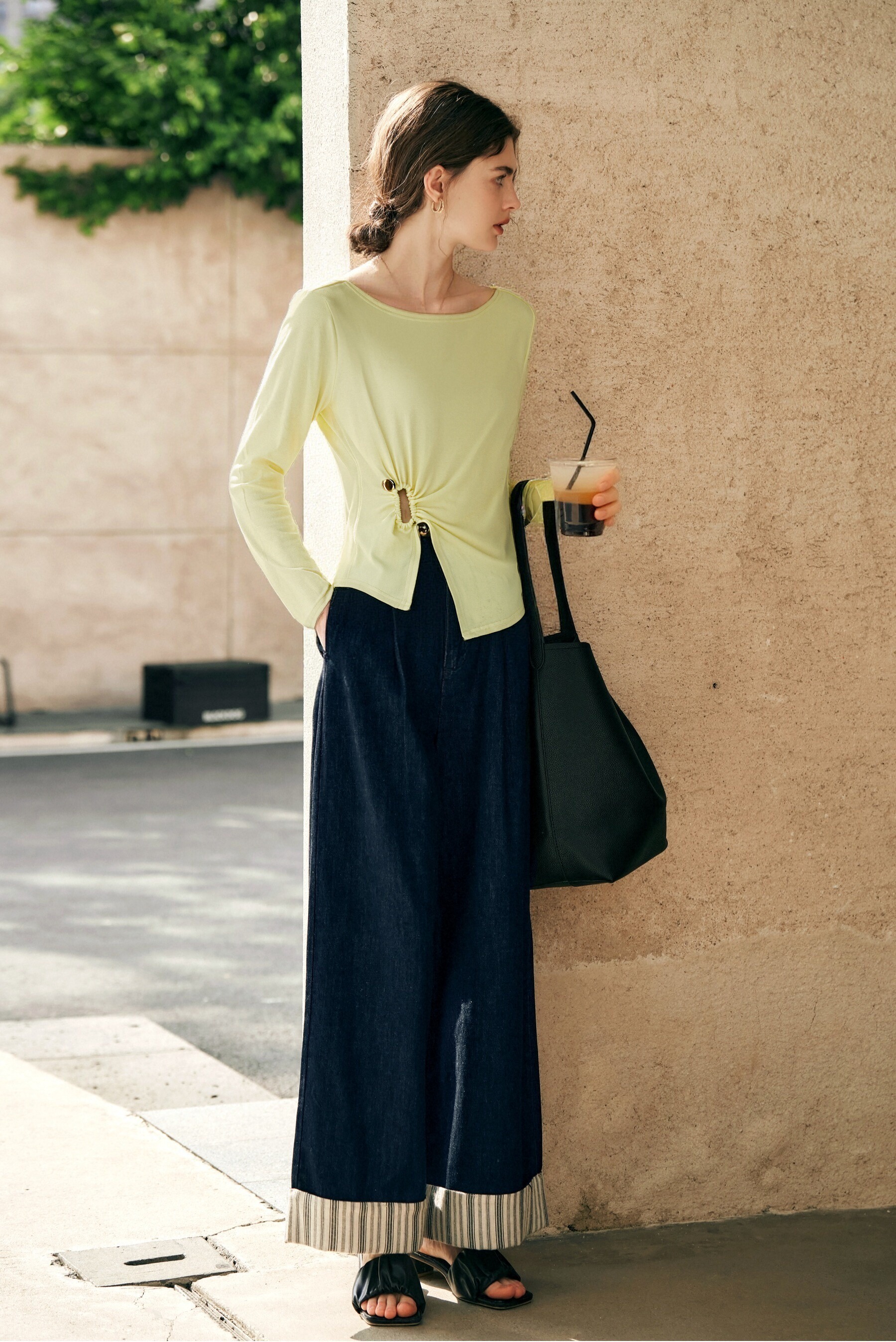 欧芮儿2025新款冬季针织修身长袖T恤浅黄色百搭女