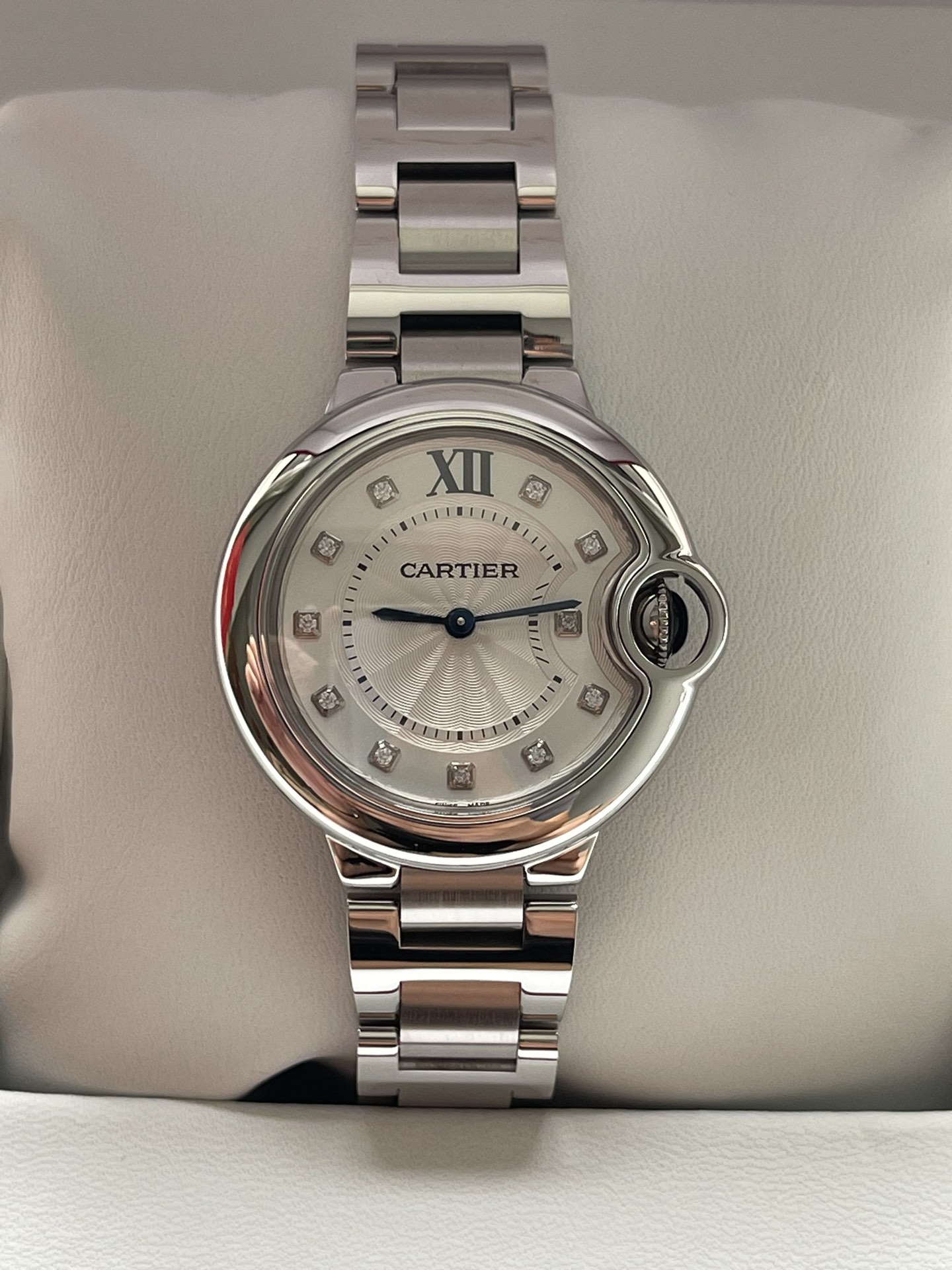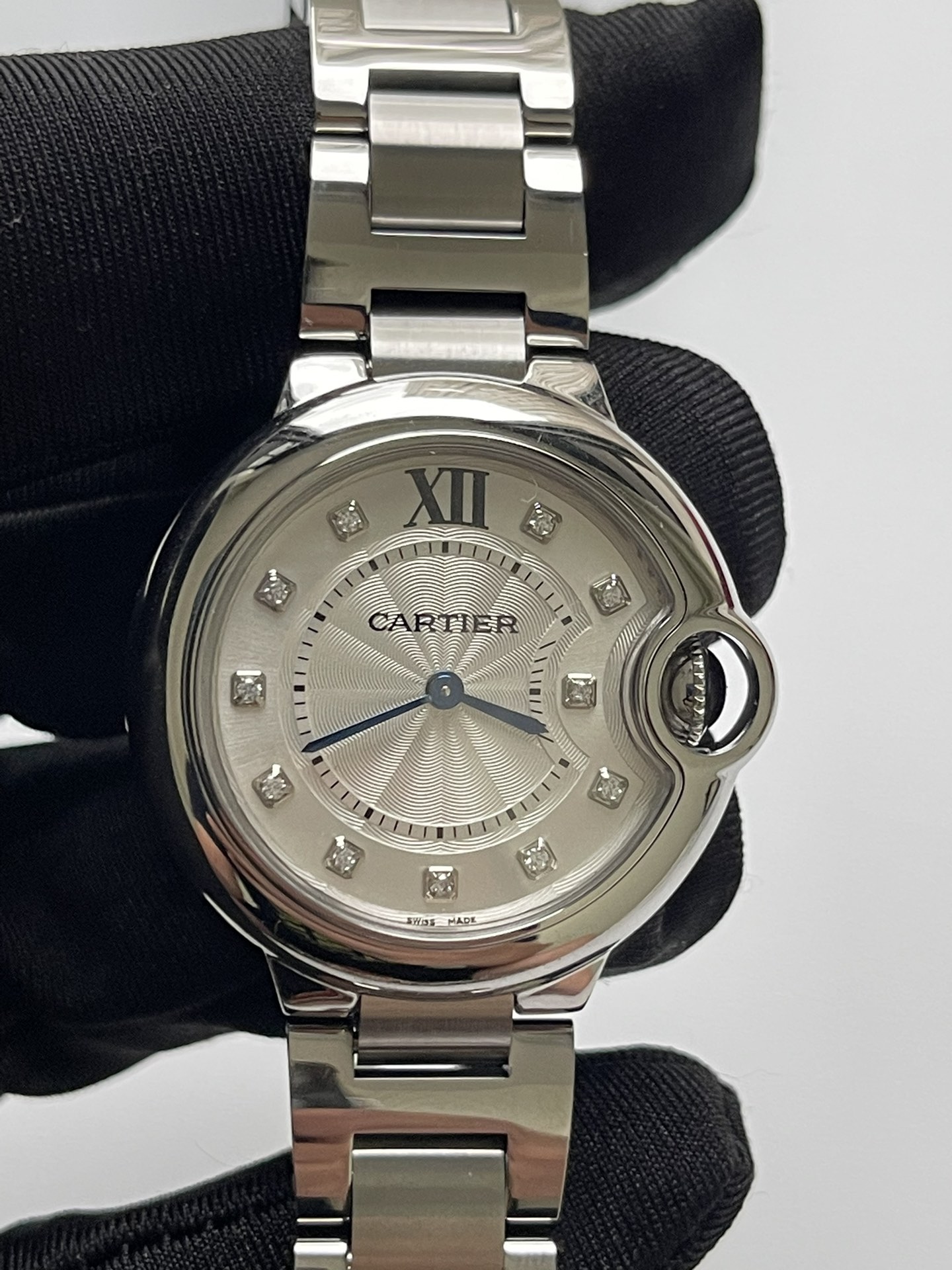 型号W4BB0022,卵石般圆润的造型为袖口平添一份优雅魅力风范经典姿态赋予闪耀自信,适合各种场合,经典的33mm表径,蓝宝石水晶玻璃镜面,镀银珠光扭索雕纹表盘,镀银漆面阳光射线纹饰,镶钻表盘,11颗明亮式切割圆钻,如夜空中的璀璨明星,指引时间的脚步,抓镶工艺完美,无毛刺变形,烤蓝剑形指针干净利落无毛刺 ,剑形蓝钢指针光照下呈现蓝色金属光泽经典设计,演绎优雅,凹槽式表冠,镶嵌1颗凸圆形合成尖晶石,蓝色宝石饱满渗透蓝光,见证永恒的幻想不渝的浪漫,蓝宝石水晶玻璃镜面,瑞士机芯,30米防水,精钢表带,特殊材质表扣及加工工艺保障触碰摘取不留手指印迹,,配全套盒子,手提袋。