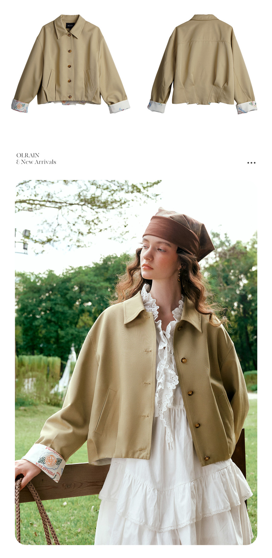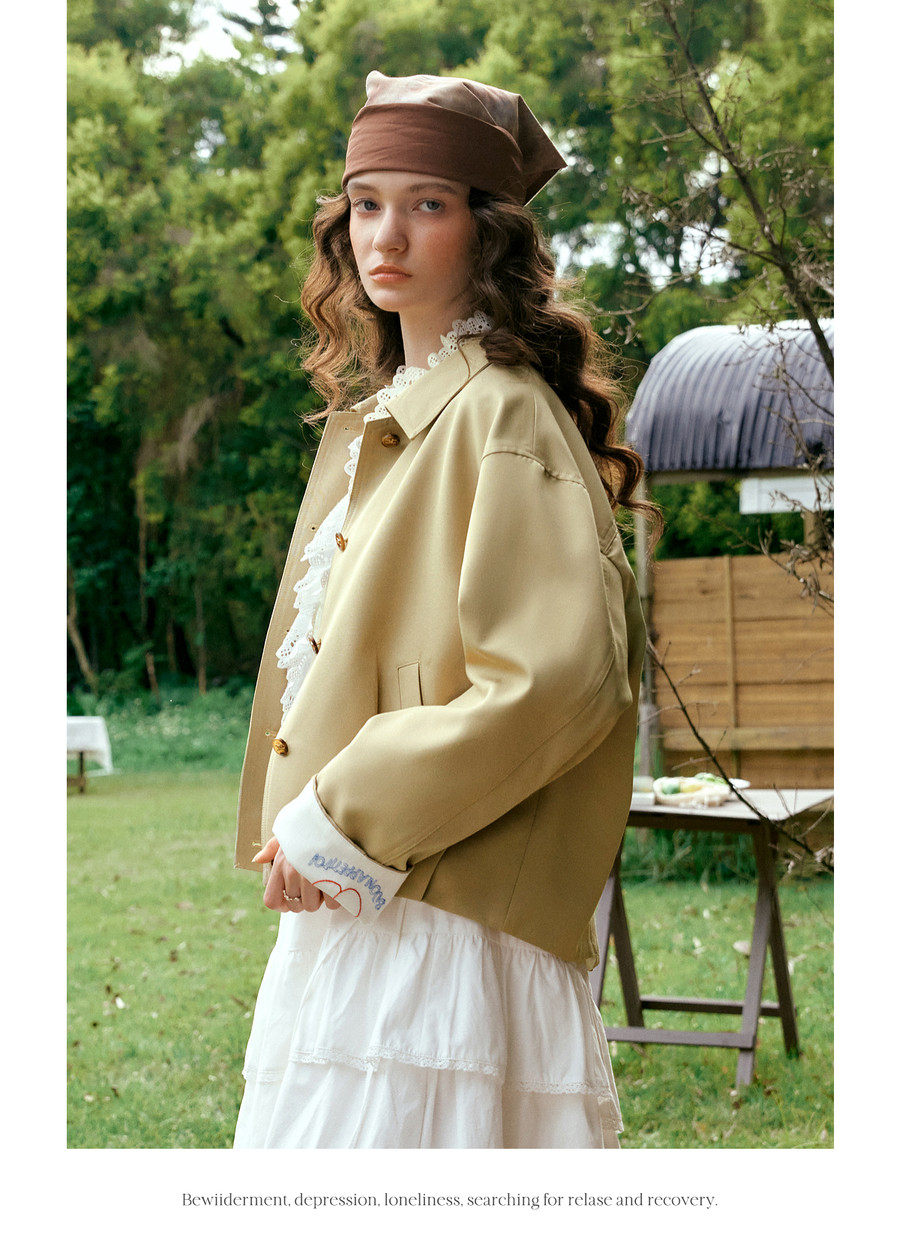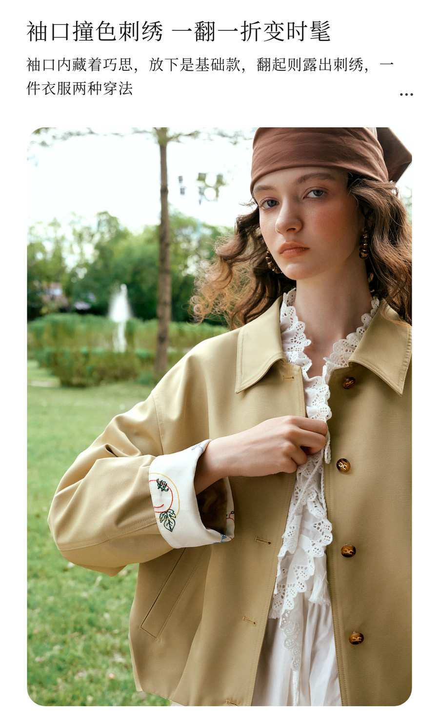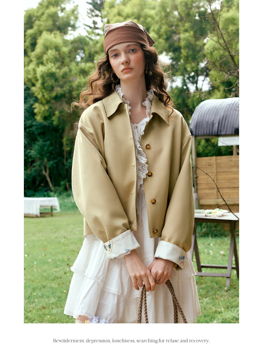 卡其色翻边袖口撞色刺绣短款开衫外套女春季文艺复古宽松夹克上衣