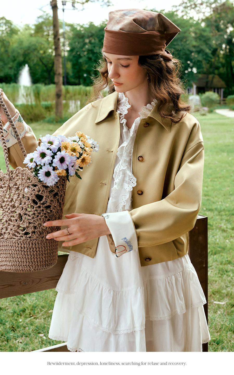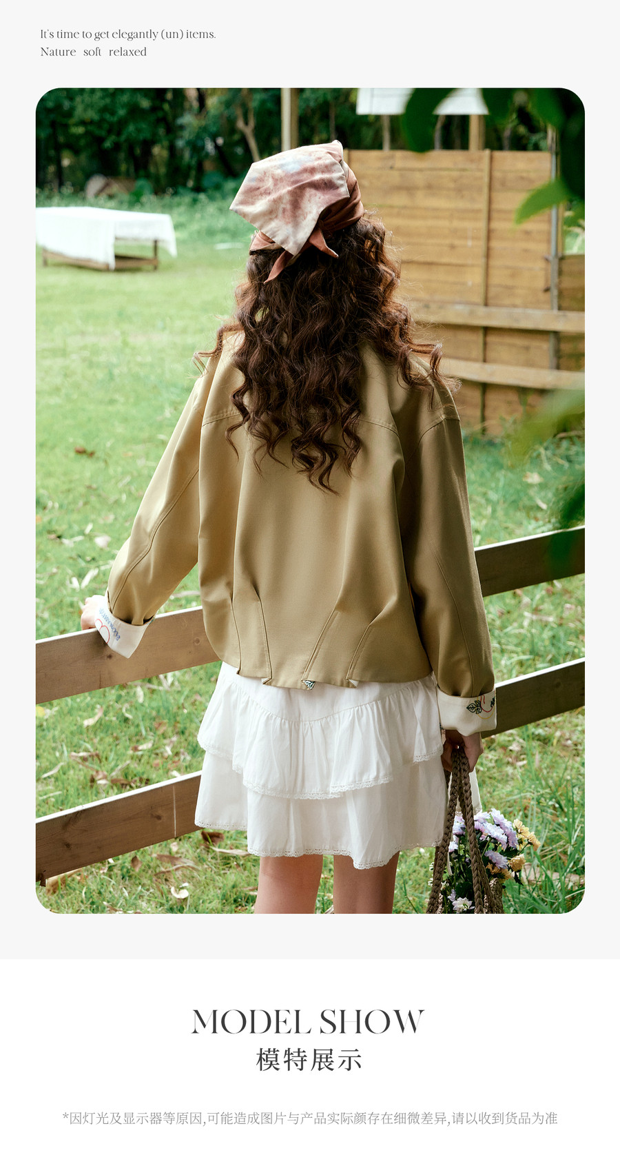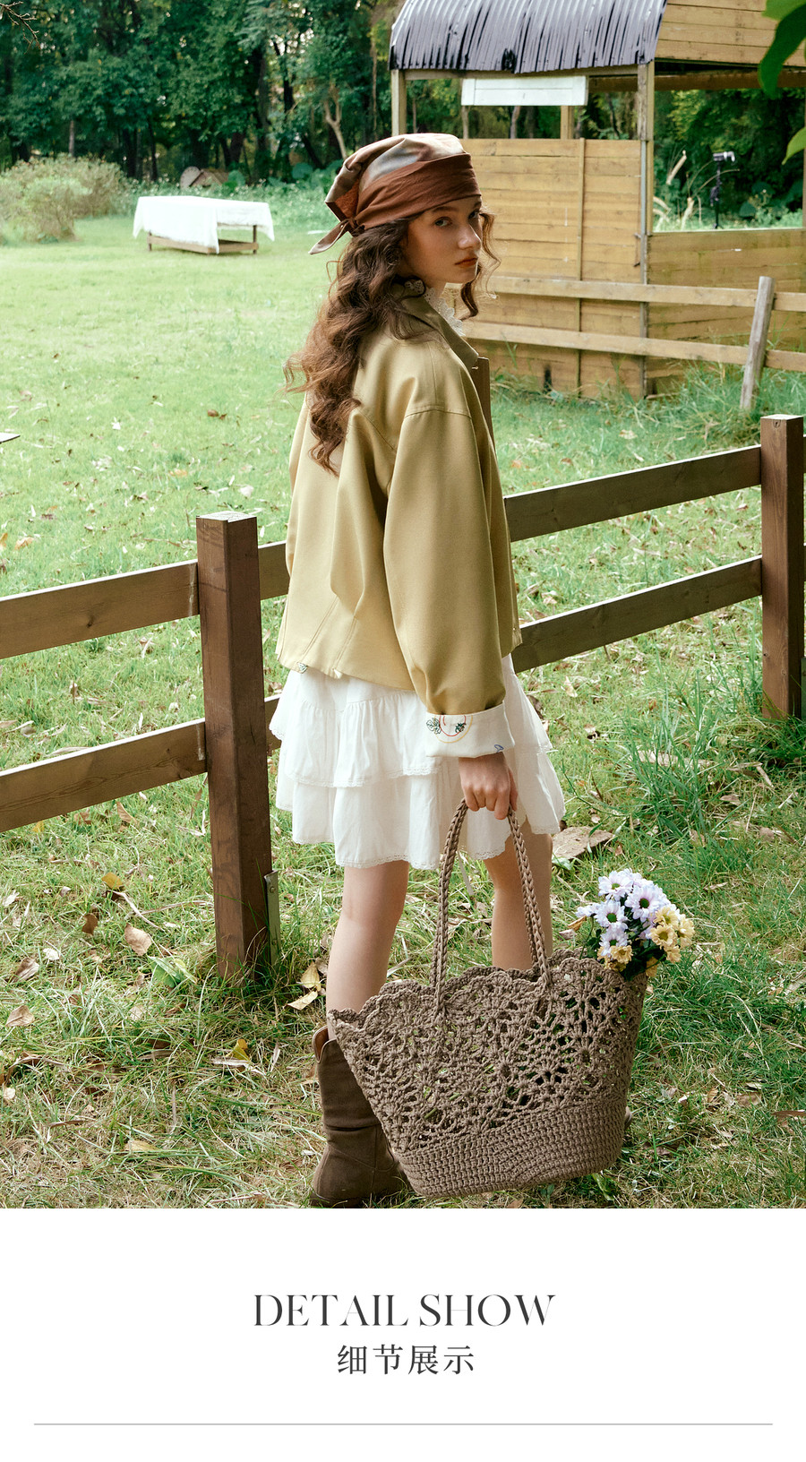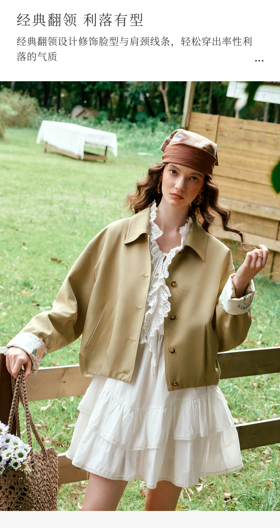 卡其色翻边袖口撞色刺绣短款开衫外套女春季文艺复古宽松夹克上衣