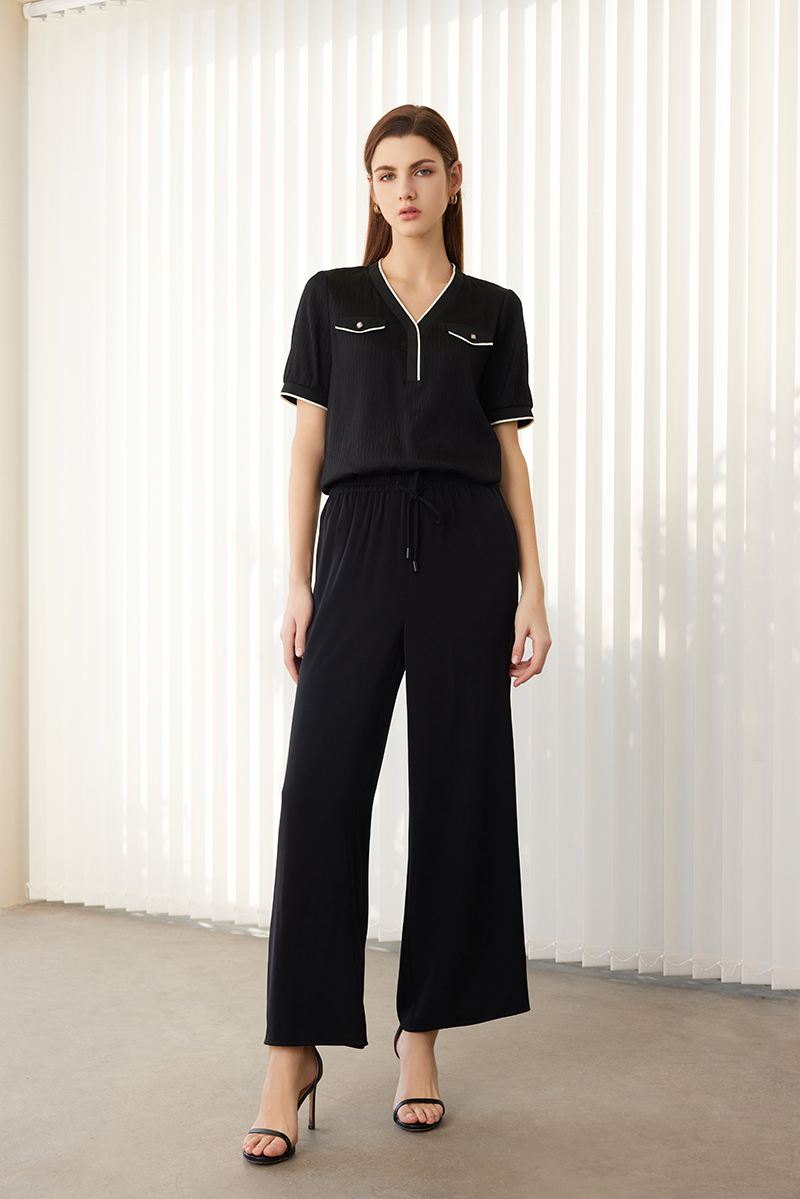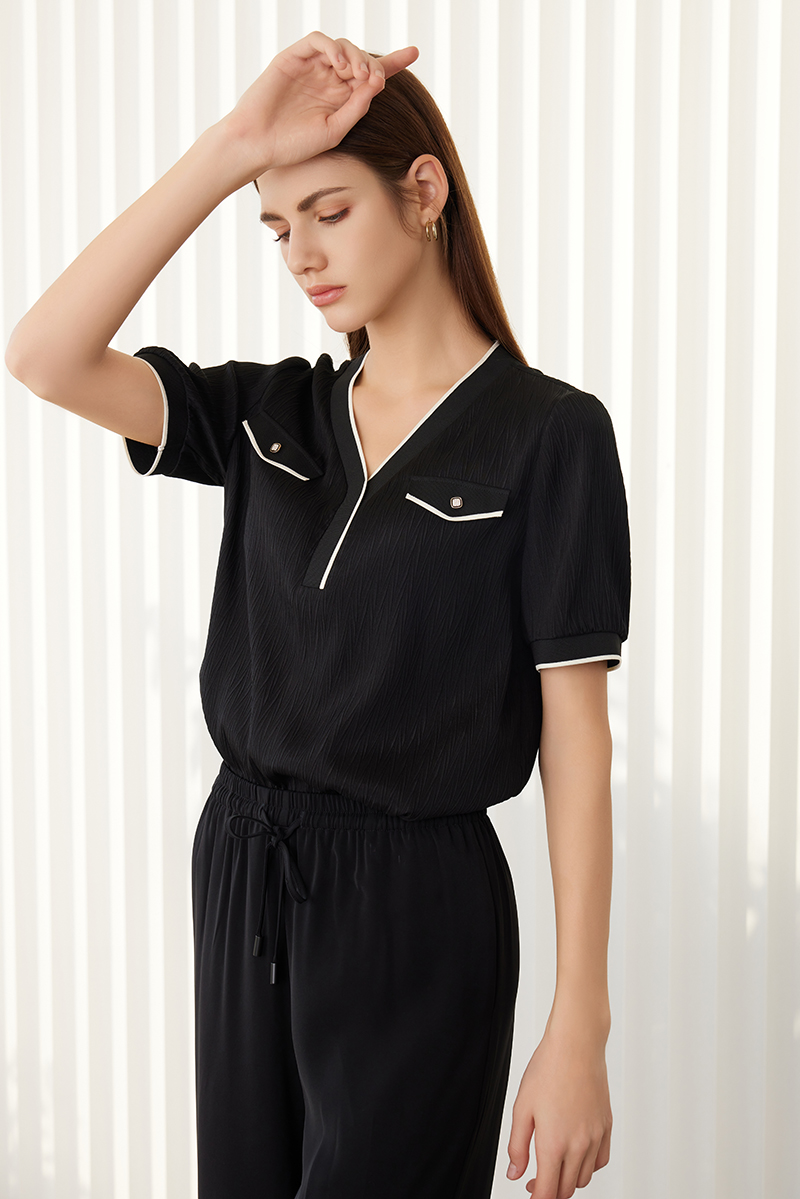 【V领条纹撞色真丝上衣】24年春夏新品女士桑蚕丝上衣时尚暗纹短袖薄款上衣
