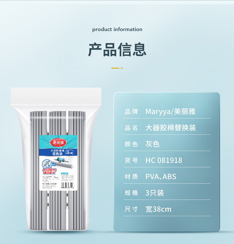 【大器胶棉拖替换装】美丽雅大时代胶棉拖把备件海绵头3只装38cm