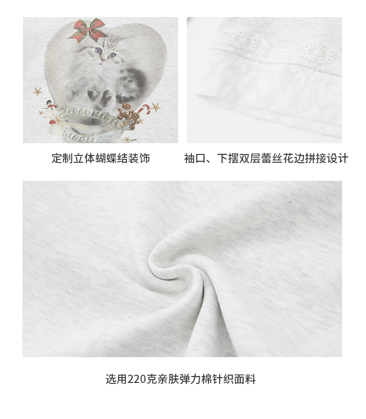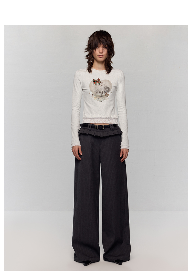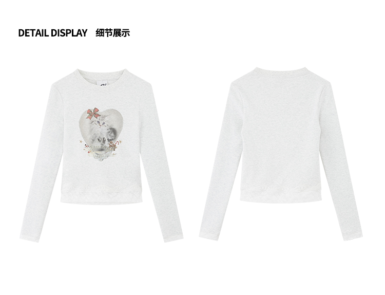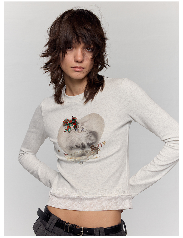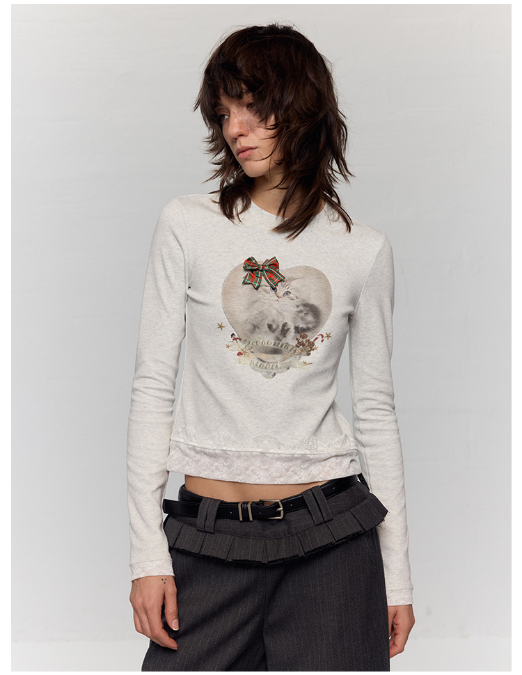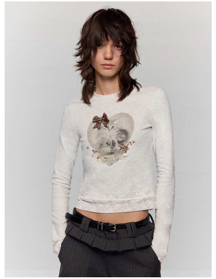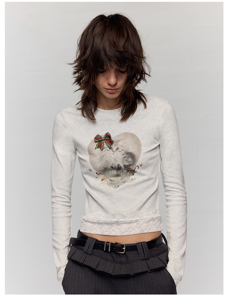出逃赤岗西/24AWT117/立体蝴蝶结猫咪印花拼接蕾丝花边修身内搭长袖T恤