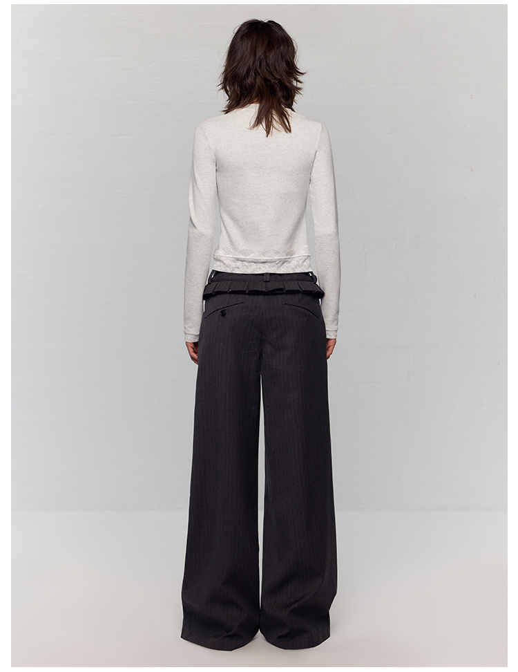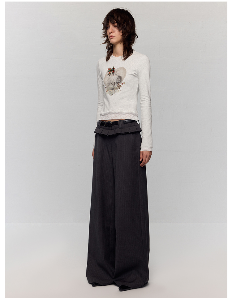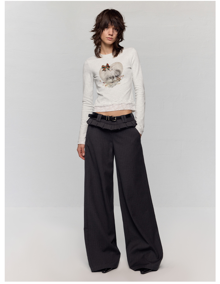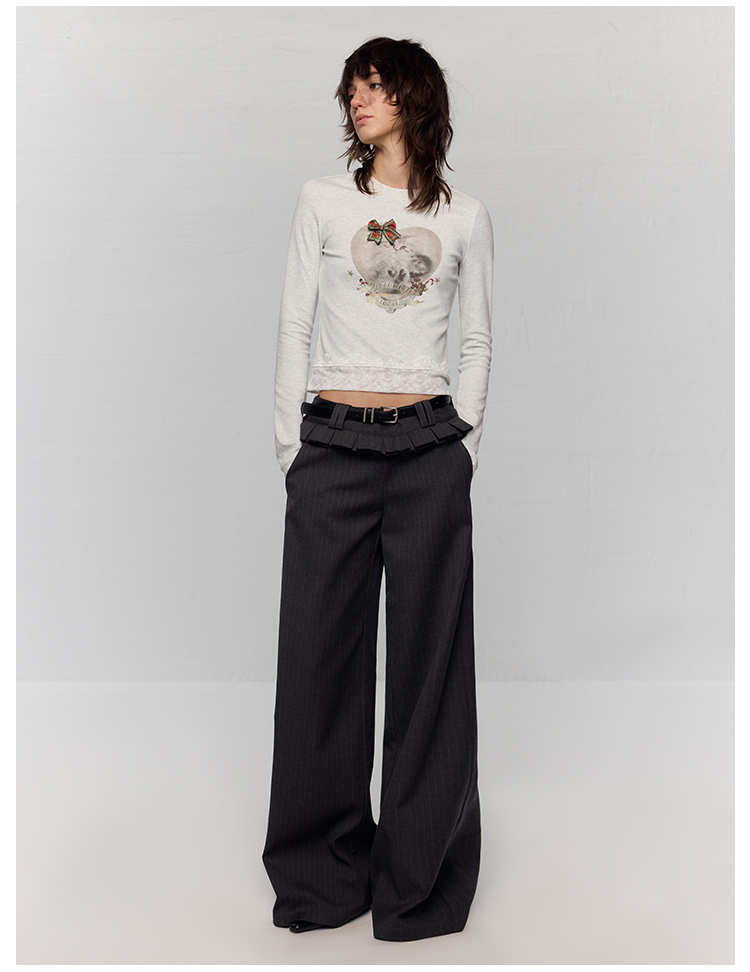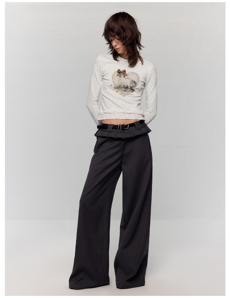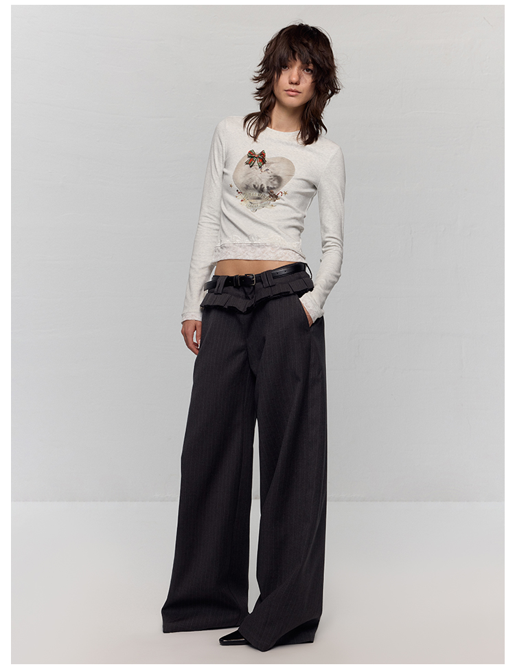 出逃赤岗西/24AWT117/立体蝴蝶结猫咪印花拼接蕾丝花边修身内搭长袖T恤