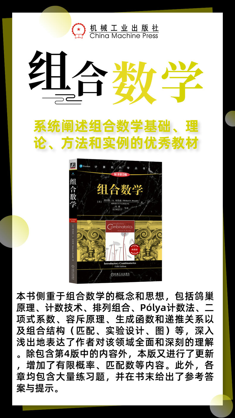 本书是系统阐述组合数学基础、理论、方法和实例的优秀教材,出版30多年来多次改版,被MIT、哥伦比亚大学、UIUC、威斯康星大学等众多国外高校采用,对国内外组合数学教学产生了较大影响,也是相关学科的主要参考文献之一。