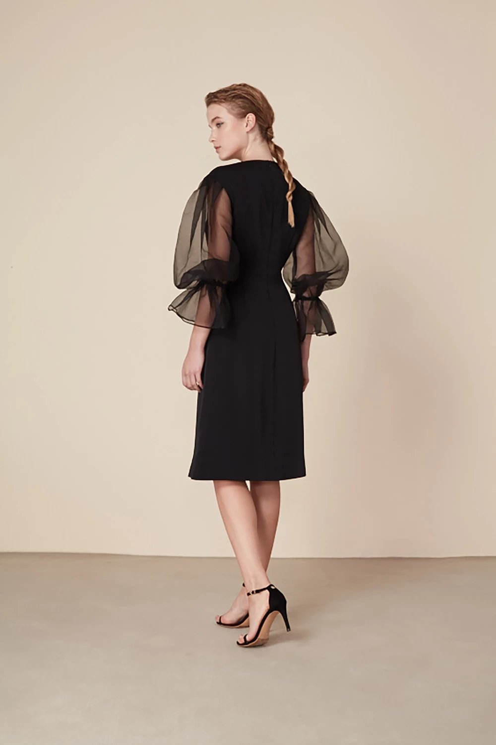 黑色欧根纱蓬袖连身裙以个性的廓形设计脱颖而出,裙身和衣袖采用不同材质拼接,为内敛的黑色增添含蓄的层次感。蓬袖选用极轻盈的欧根纱打造出浪漫飘逸的流畅廓型,袖口特别做了收紧设计,凸显身形的线条美感,共塑典雅干练的气质。