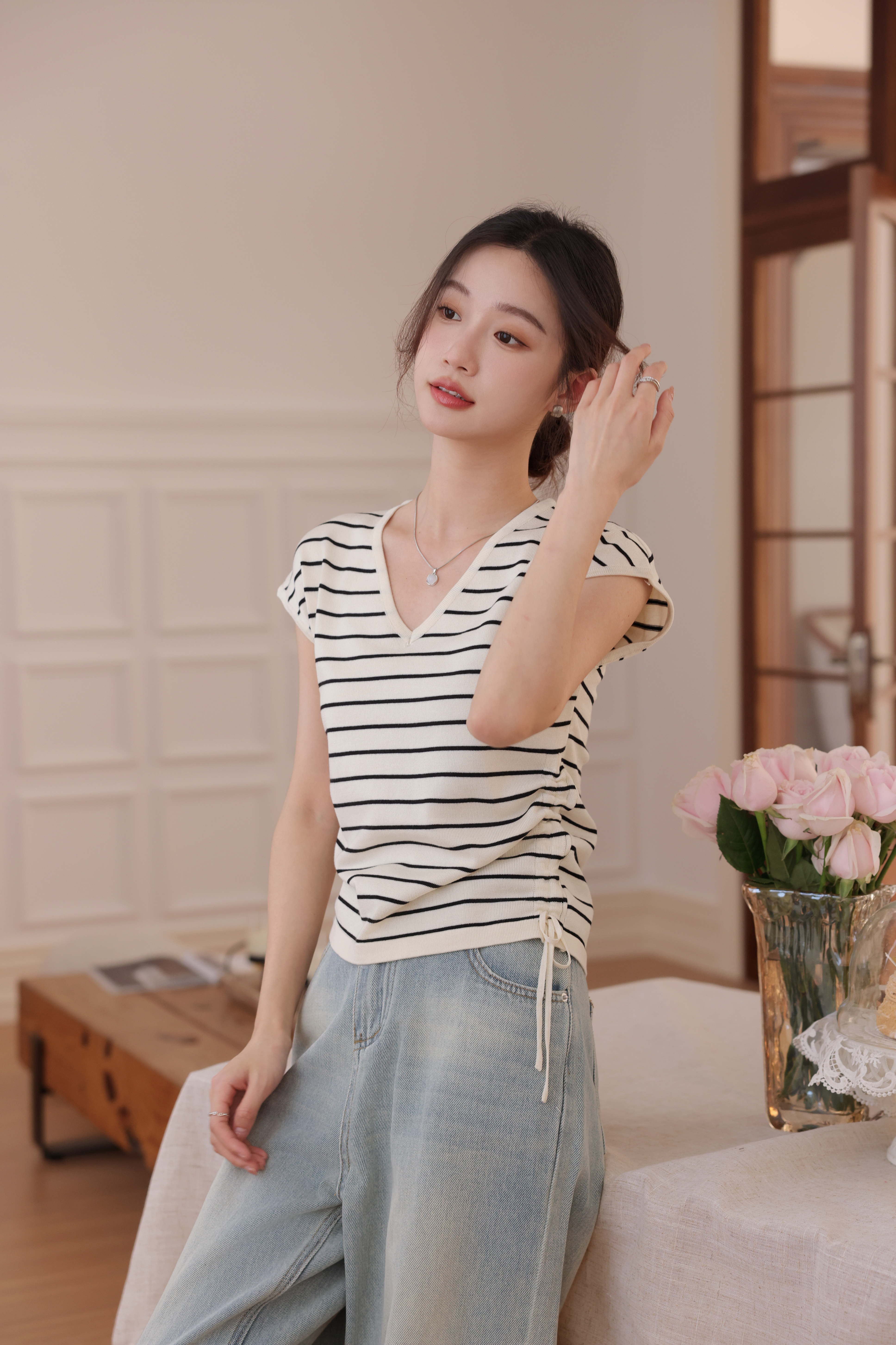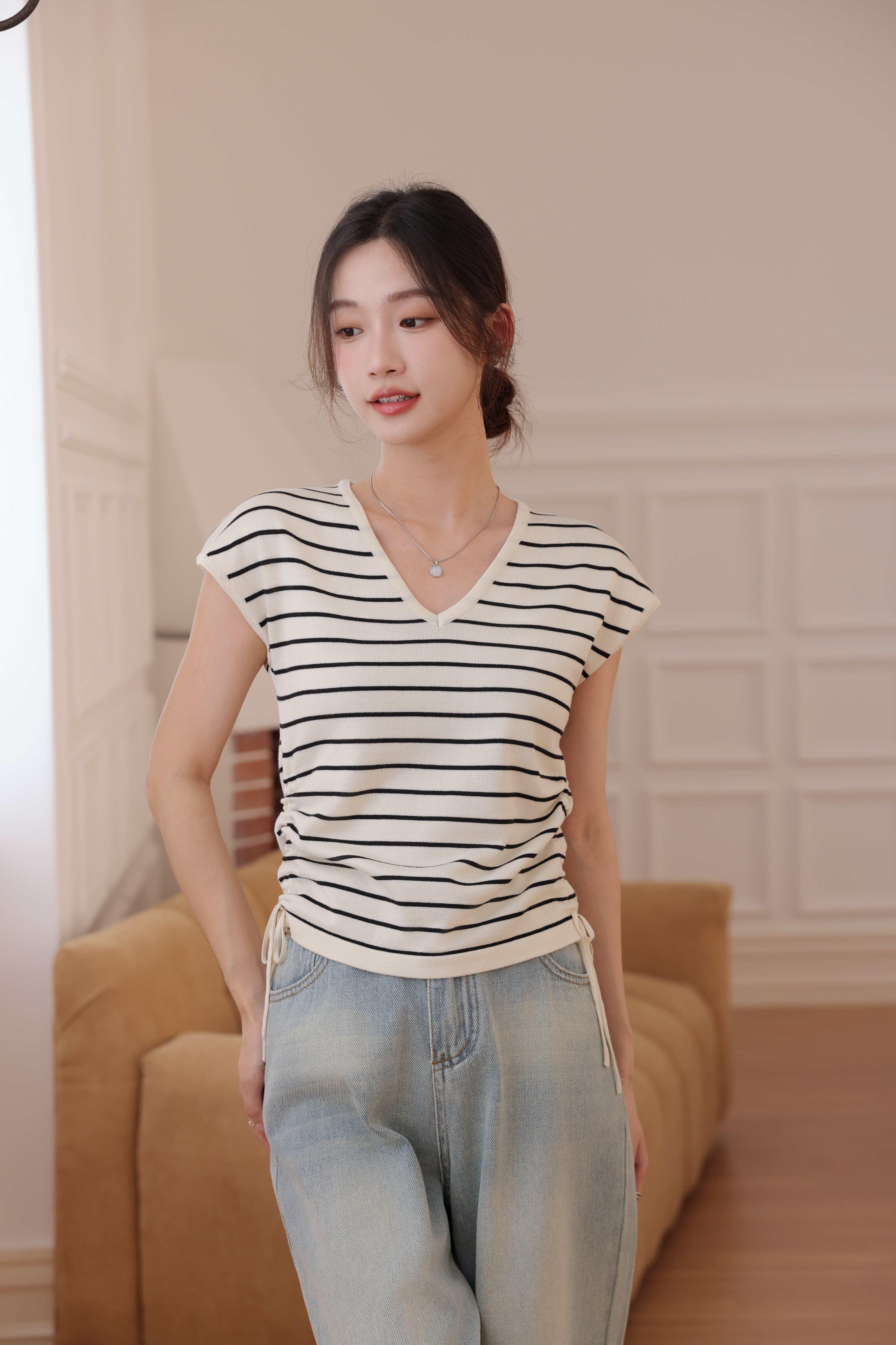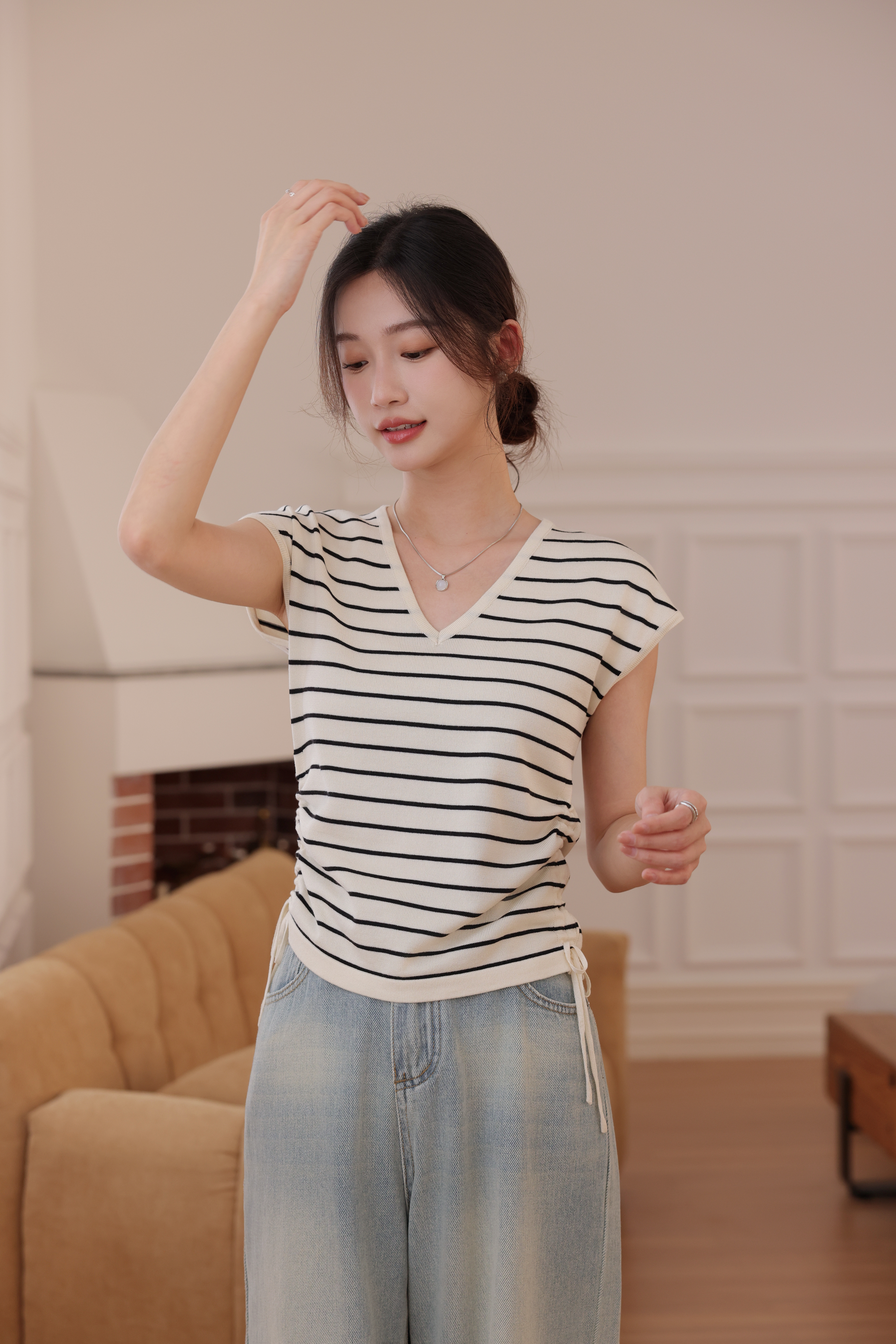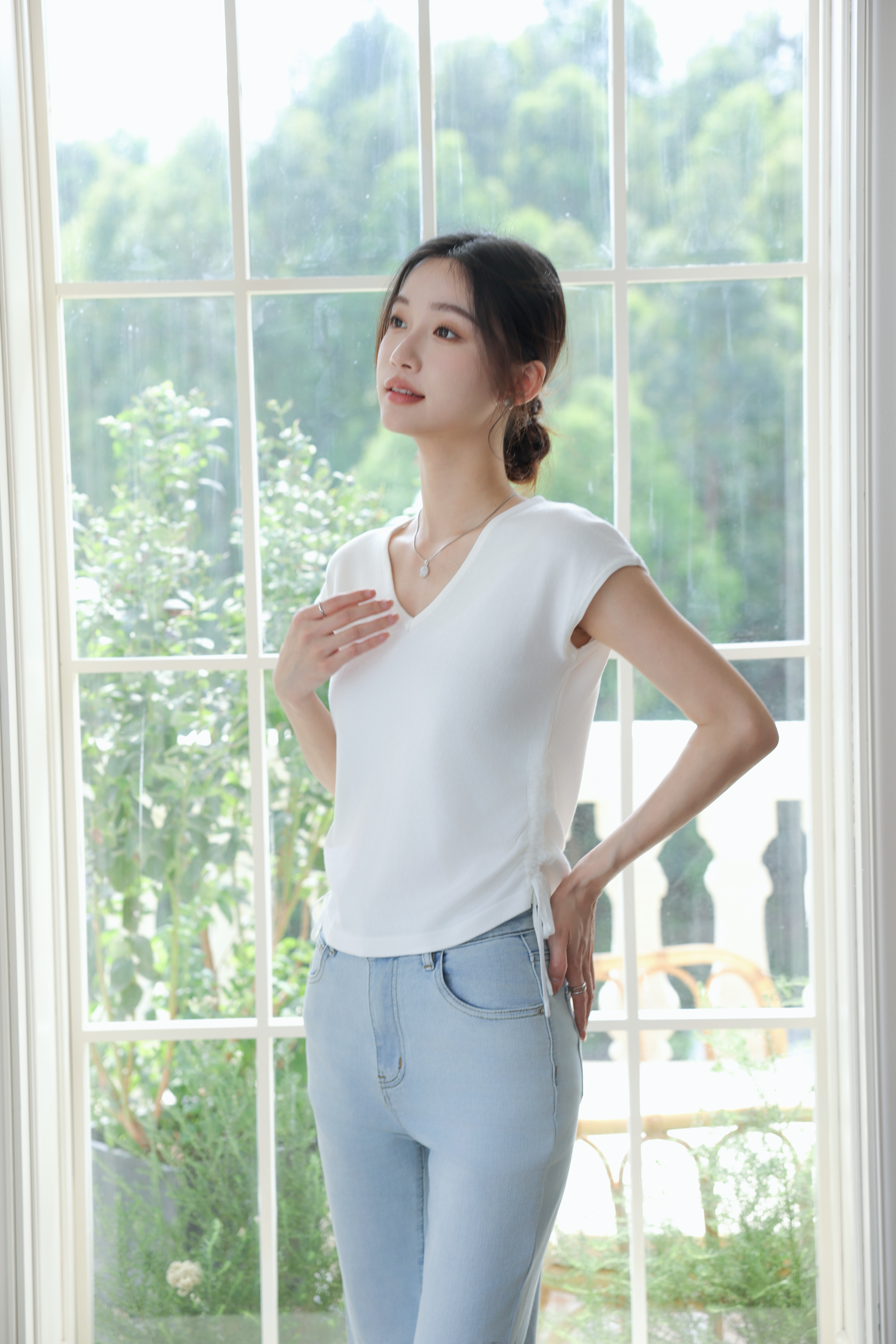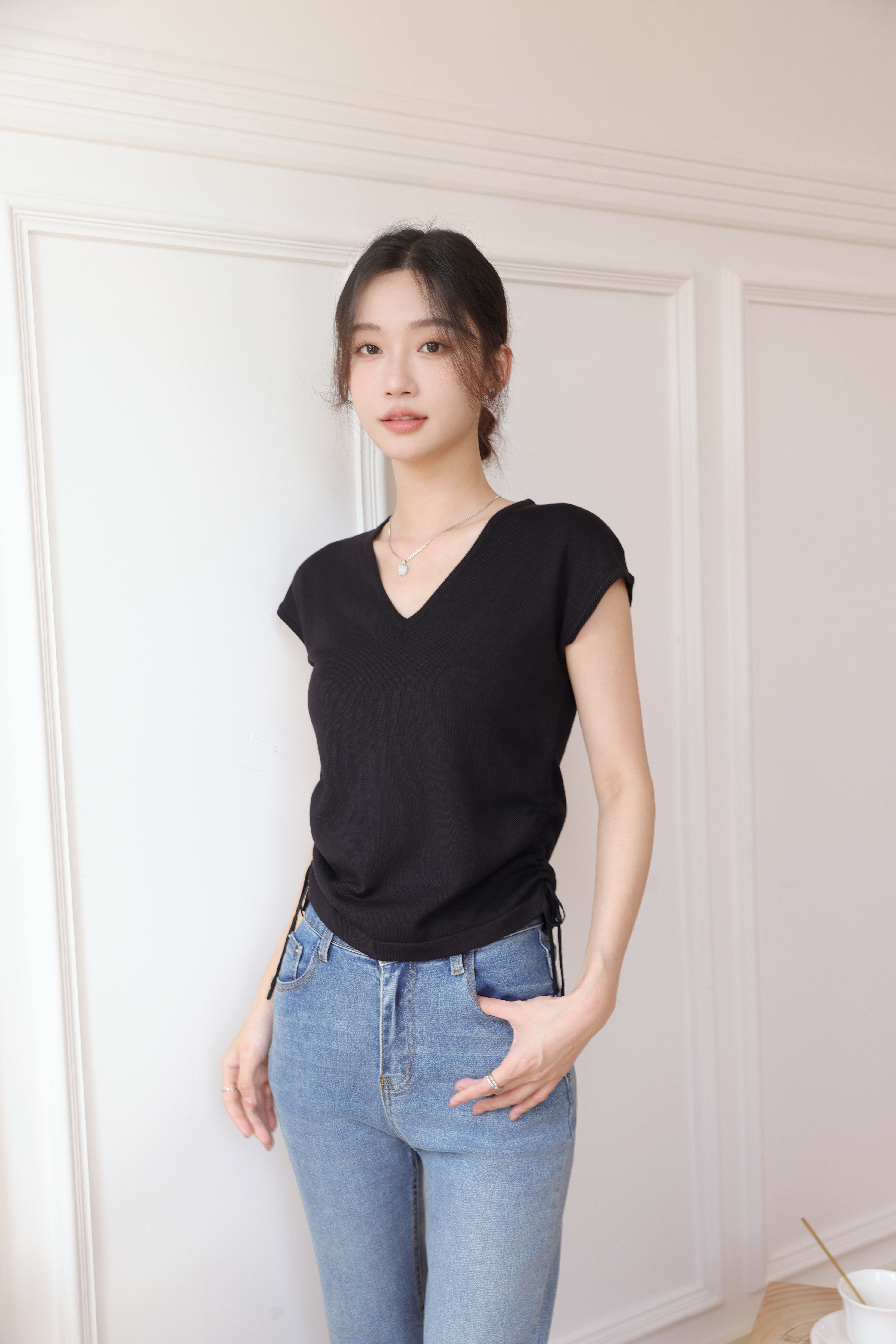 【L MVIG赫本冰丝T恤】2024夏季流行百搭款❗V领抽绳,遮肚子拉长腰线~~穿出天鹅颈!凉感冰丝面料🍃🍃这个夏天再也不热了!!!