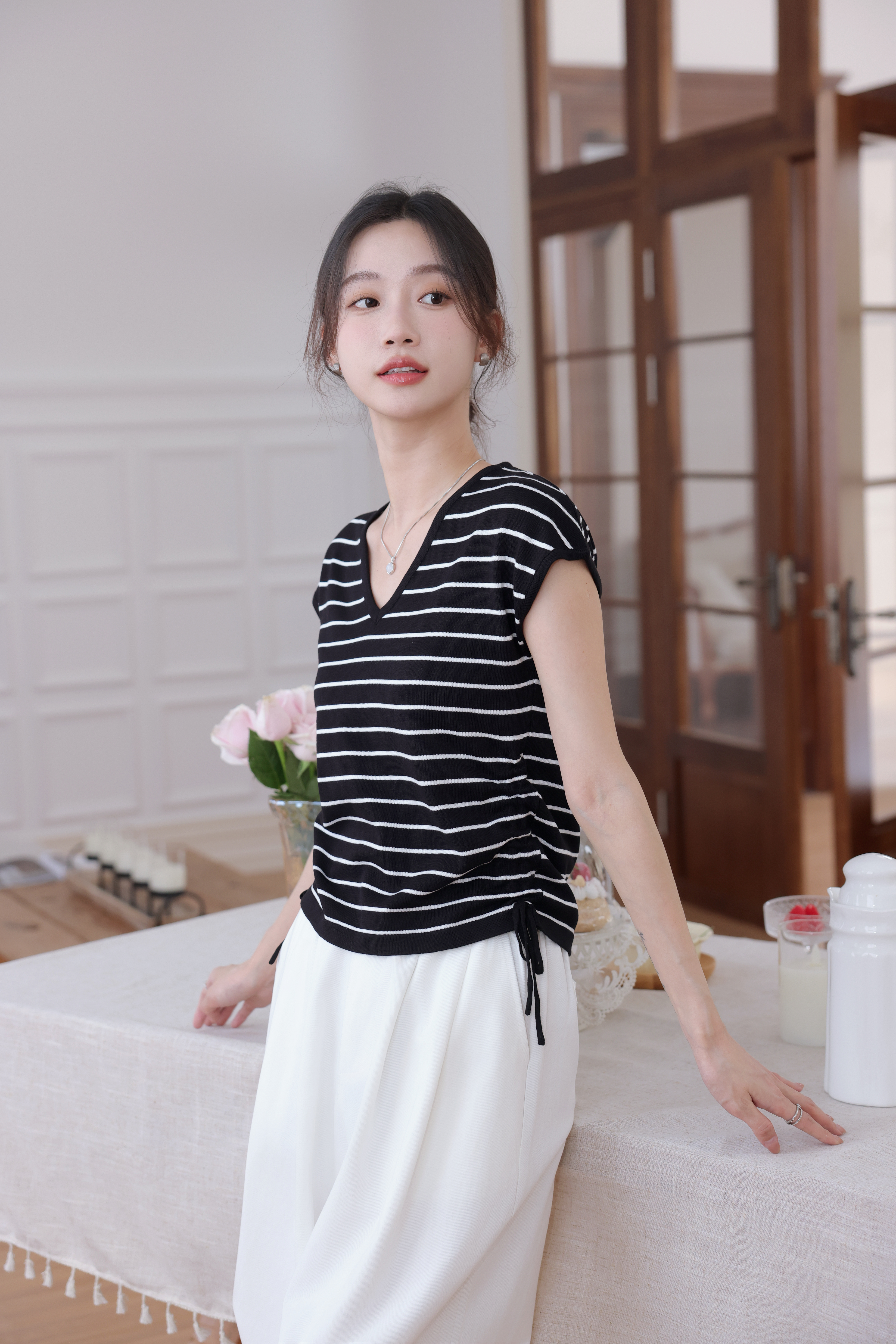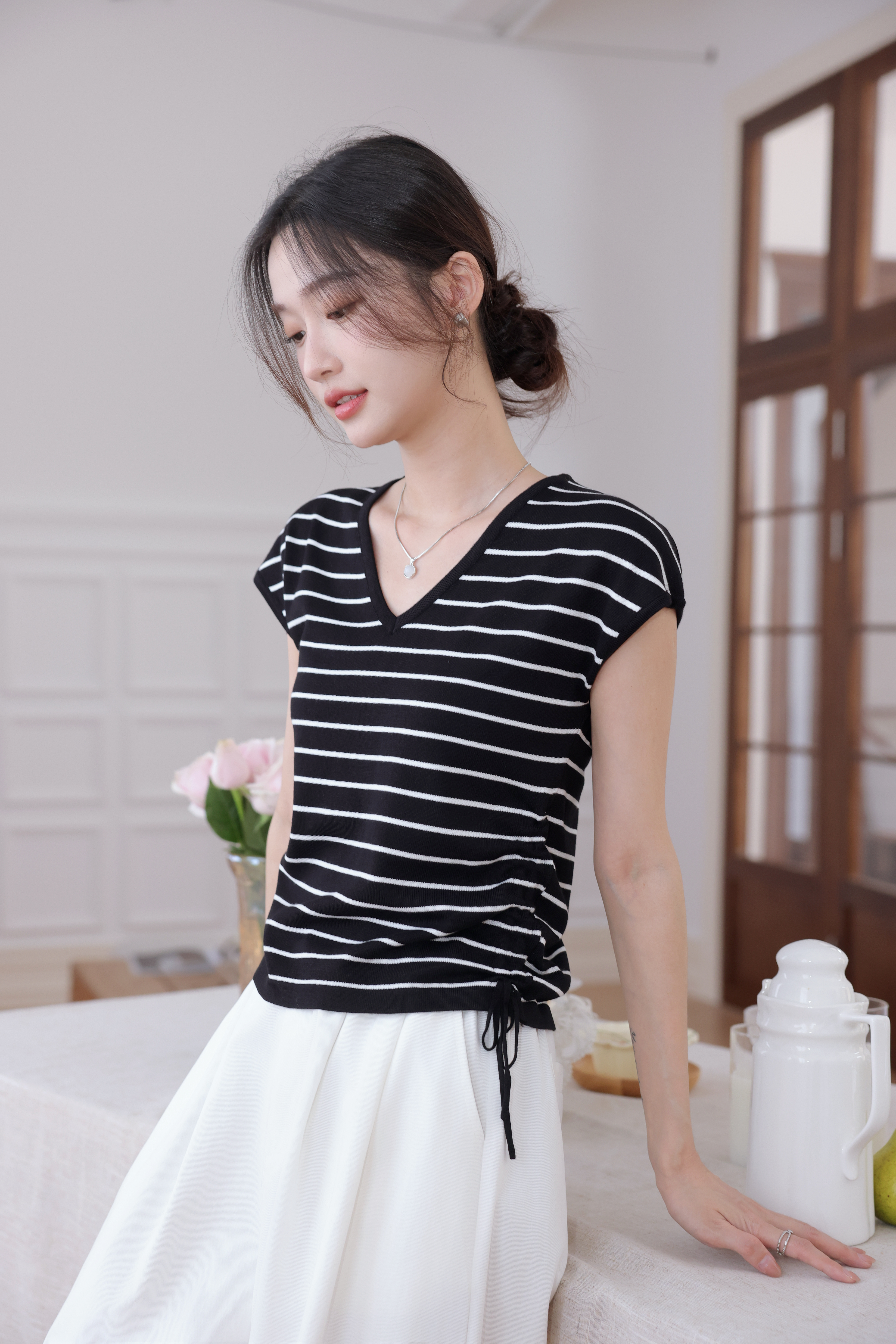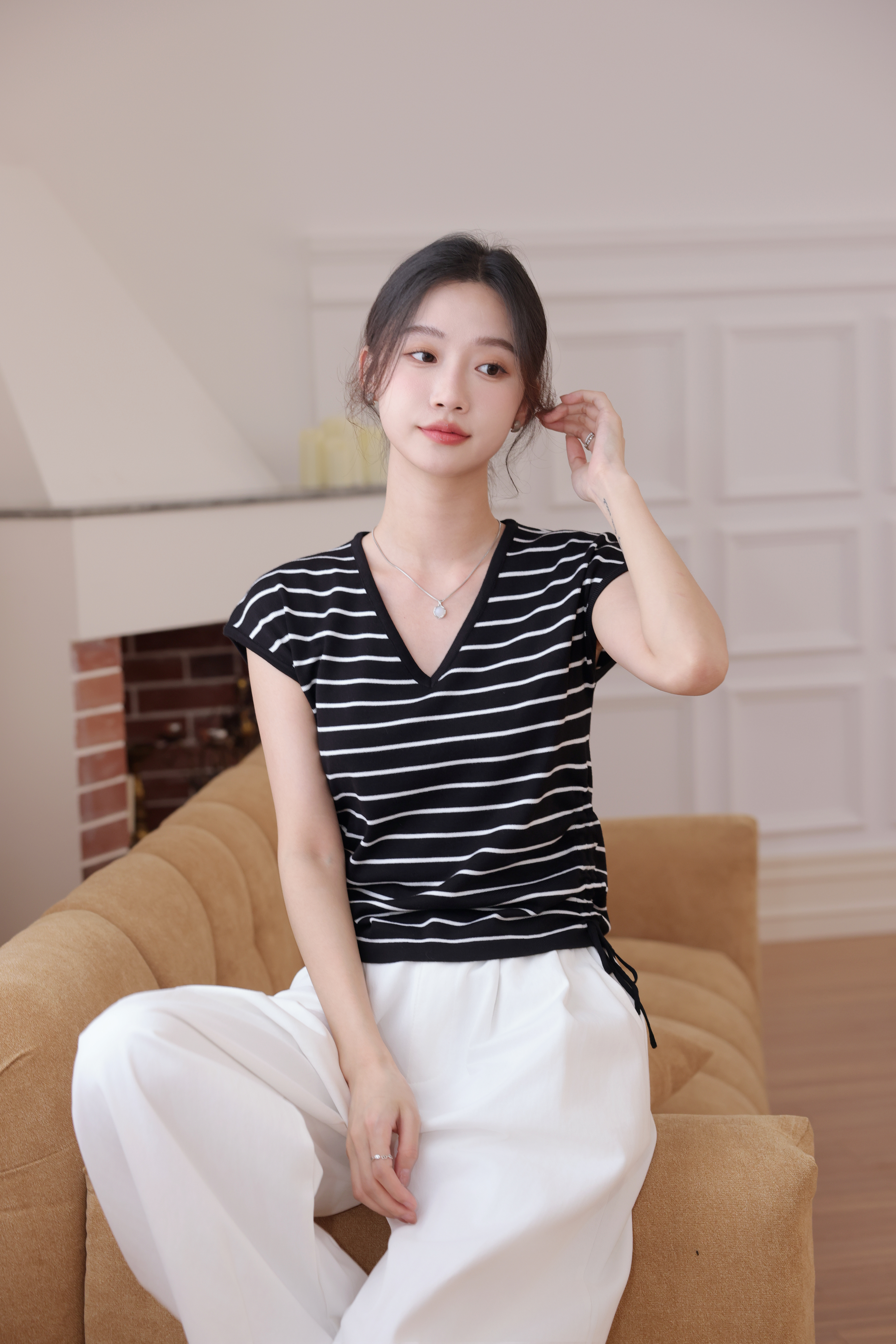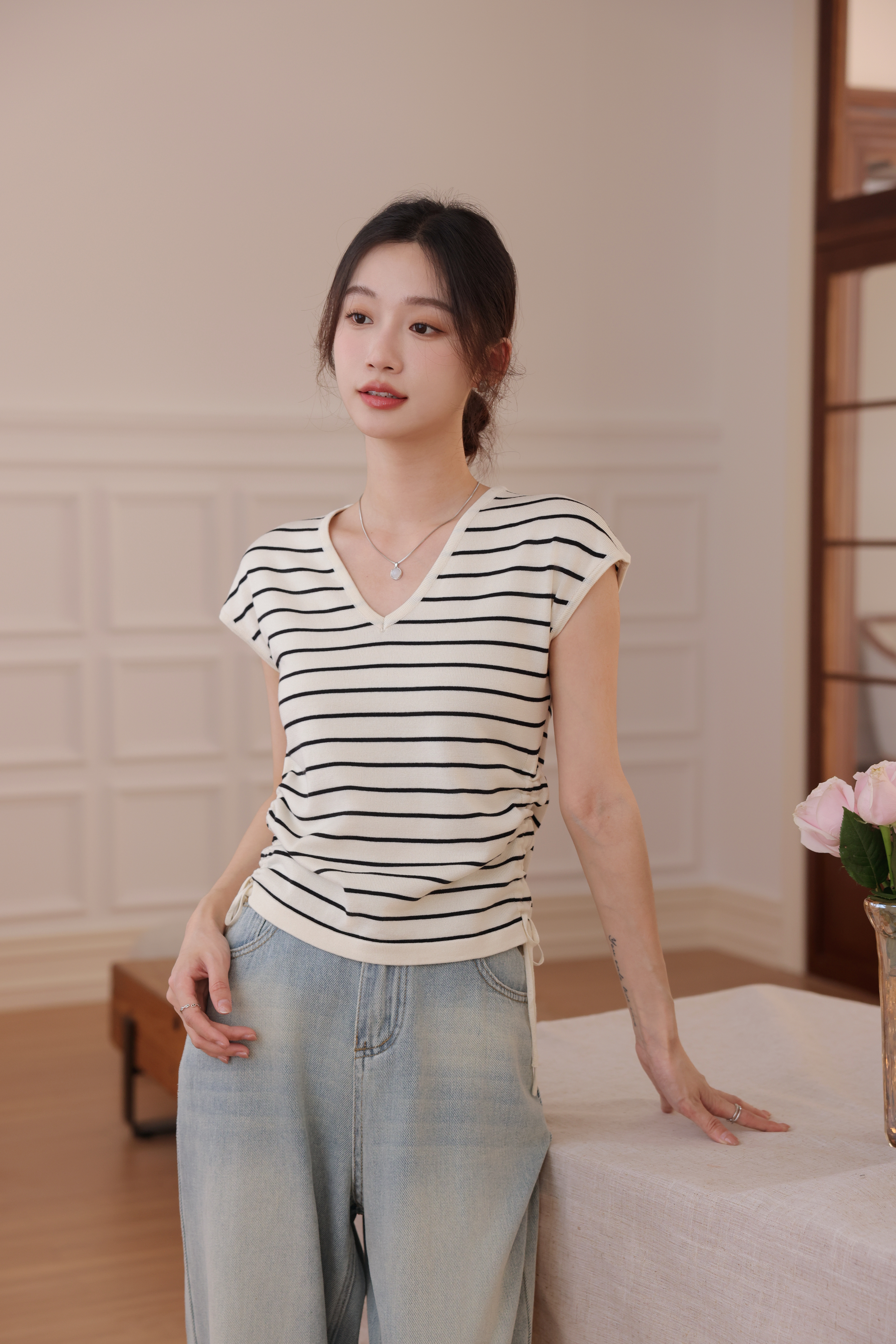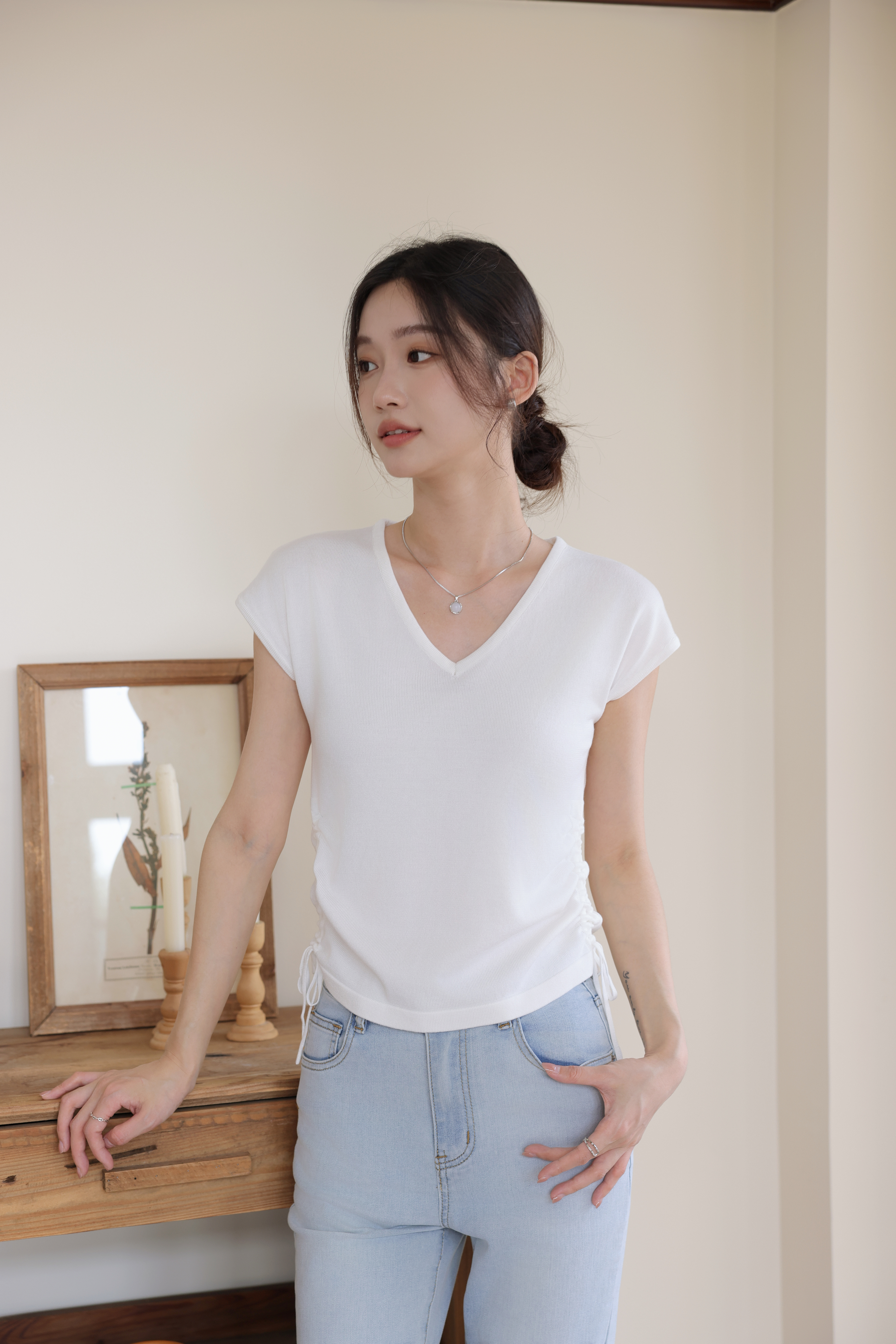 【L MVIG赫本冰丝T恤】2024夏季流行百搭款❗V领抽绳,遮肚子拉长腰线~~穿出天鹅颈!凉感冰丝面料🍃🍃这个夏天再也不热了!!!