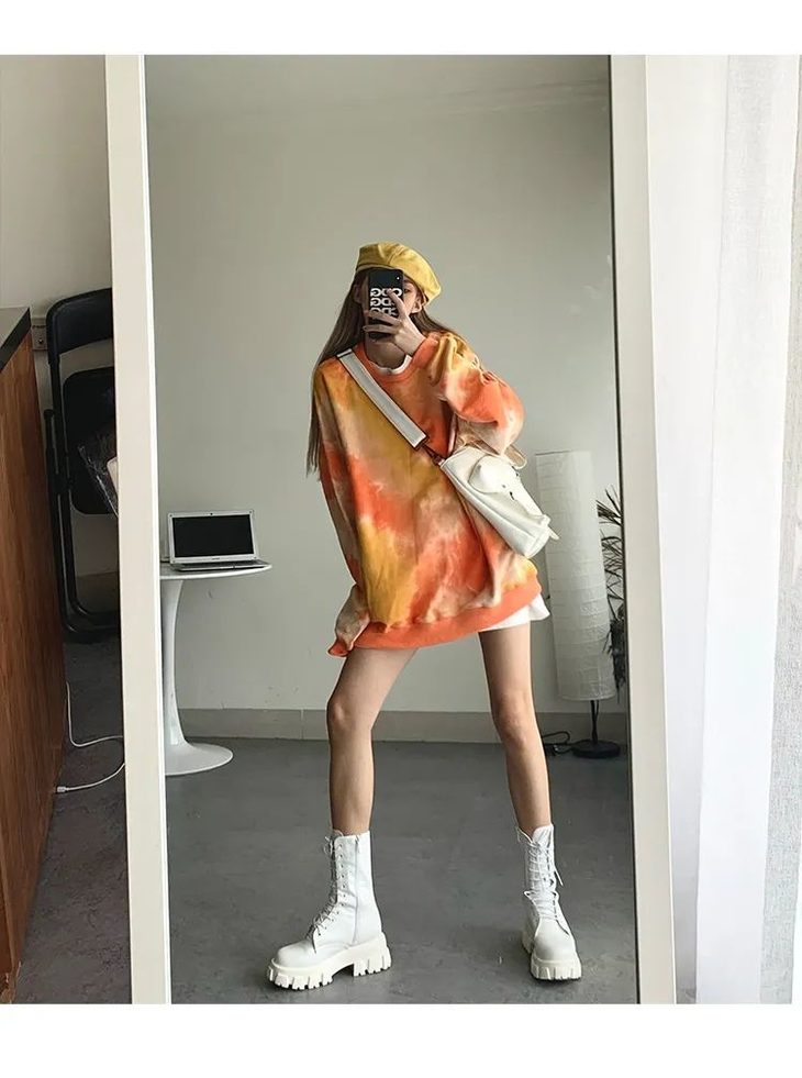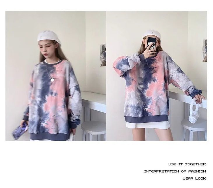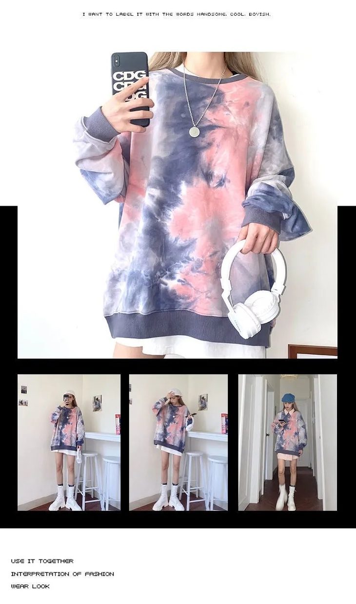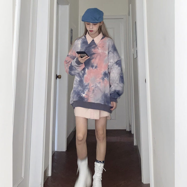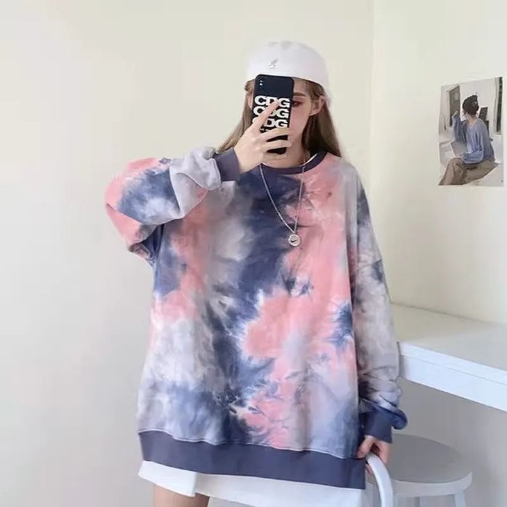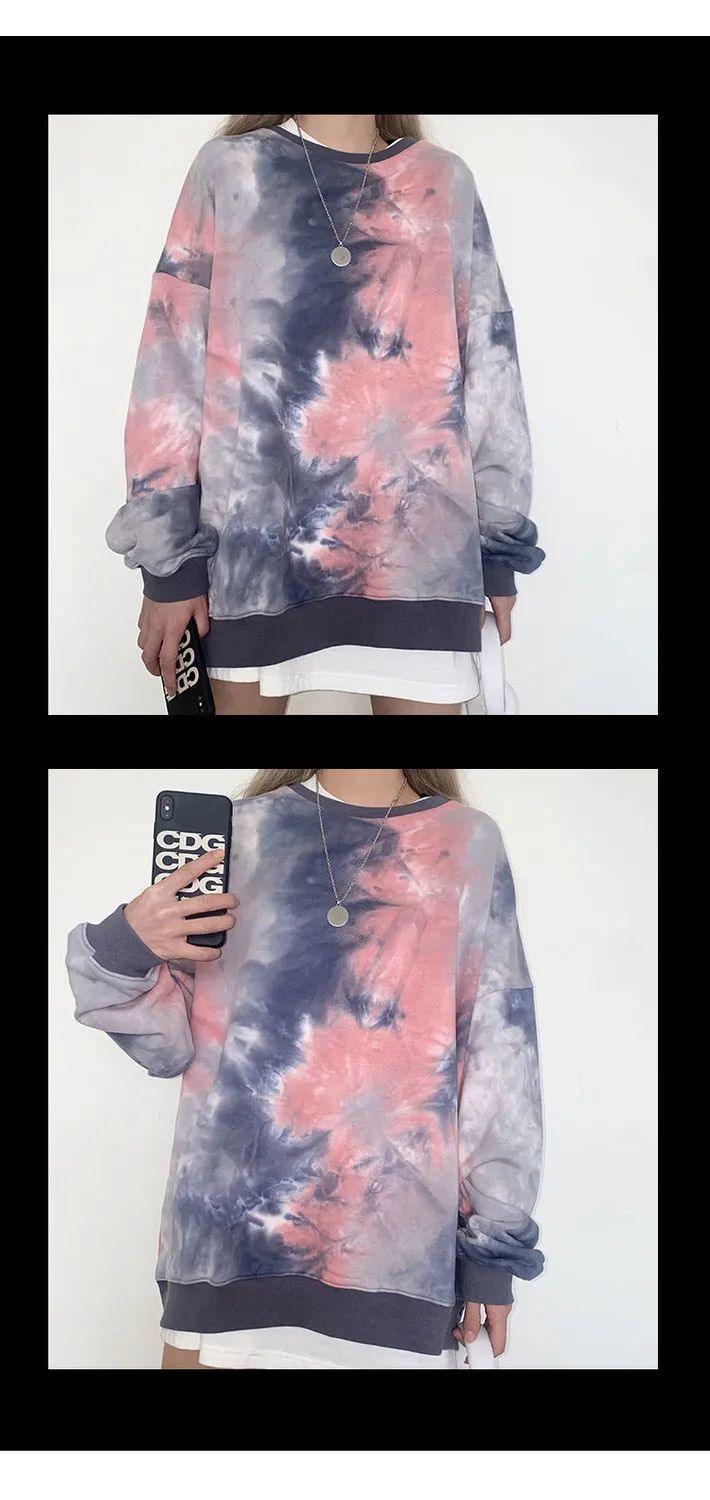 网红同款高街风扎染卫衣女中长款2021早秋新款宽松显瘦长袖上衣潮