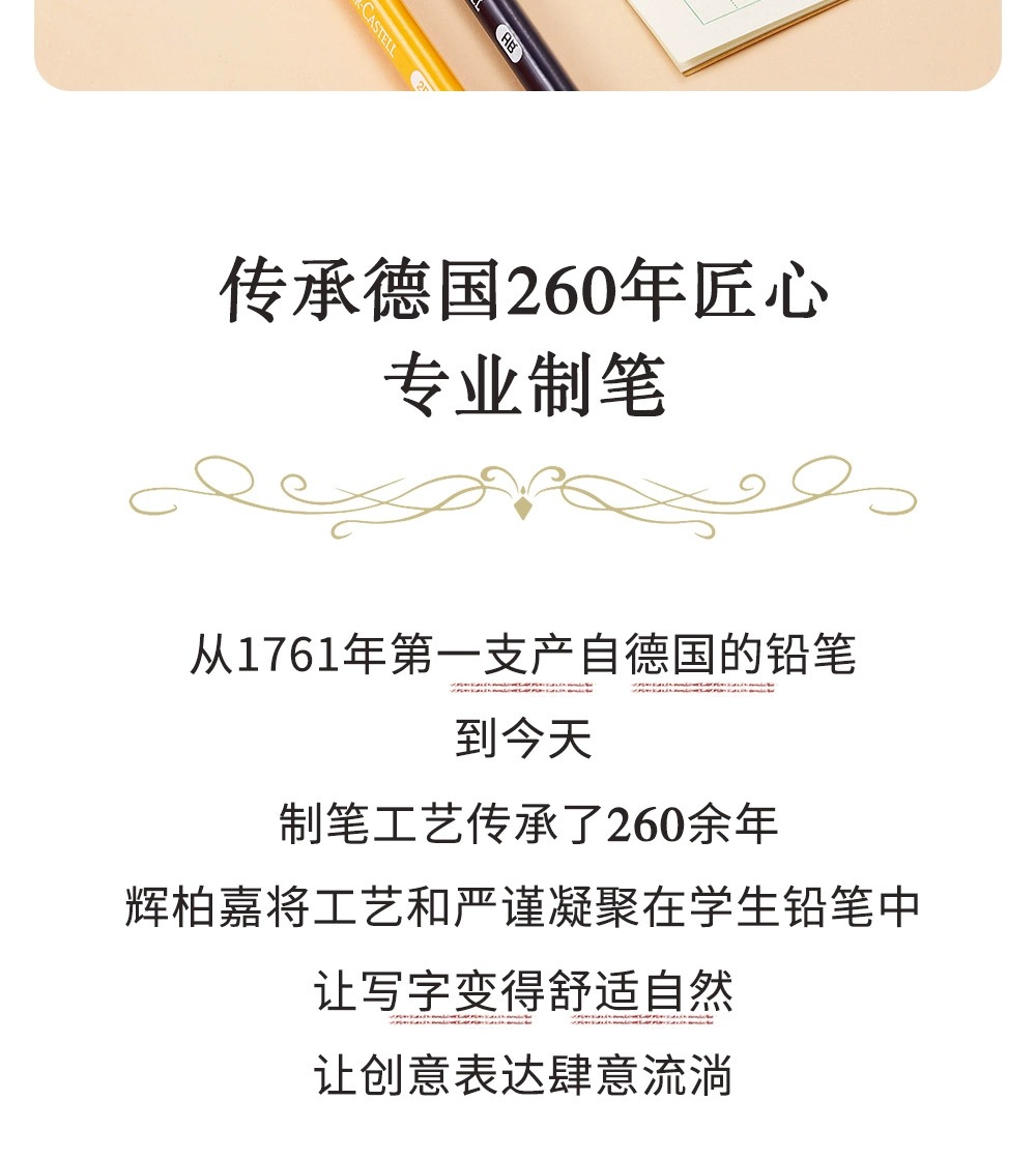 - 德国辉柏嘉,始创于1761年的家族品牌,历经259年岁月洗礼的制笔权威,一直致力于提供高品质书写及绘画艺术创作工具的专业制造商。