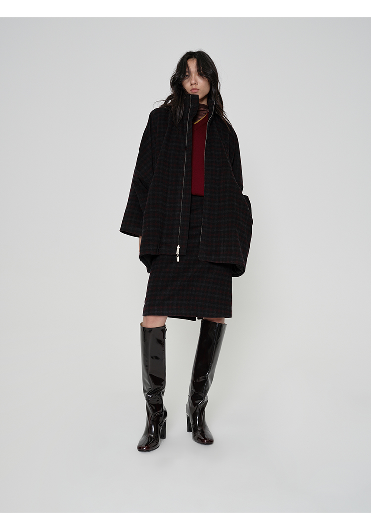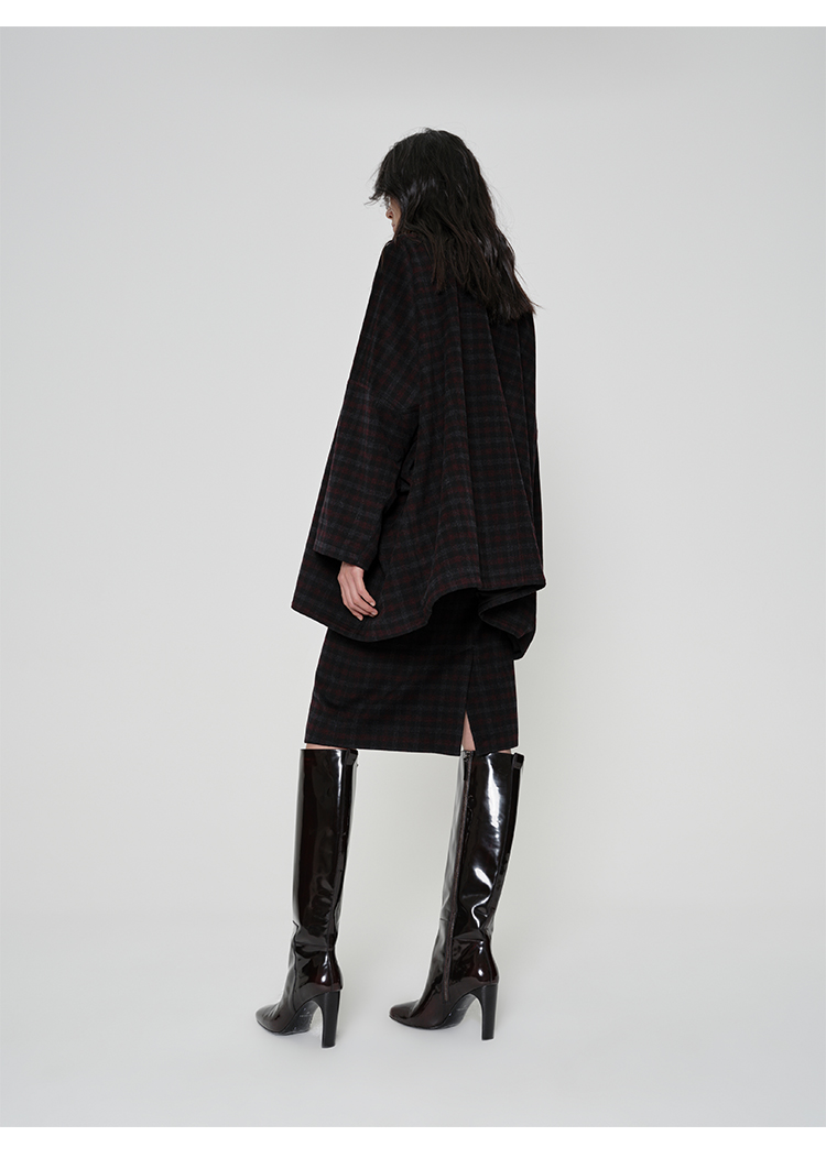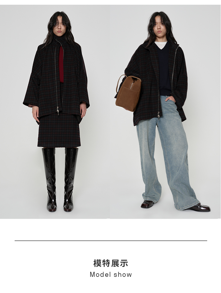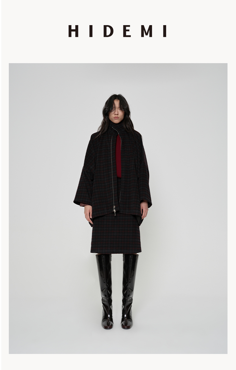 HIDEMI 甄选色织格纹羊毛拉链伞状极简廓形设计感大衣外套