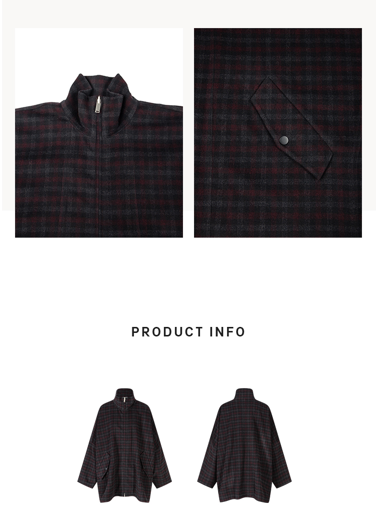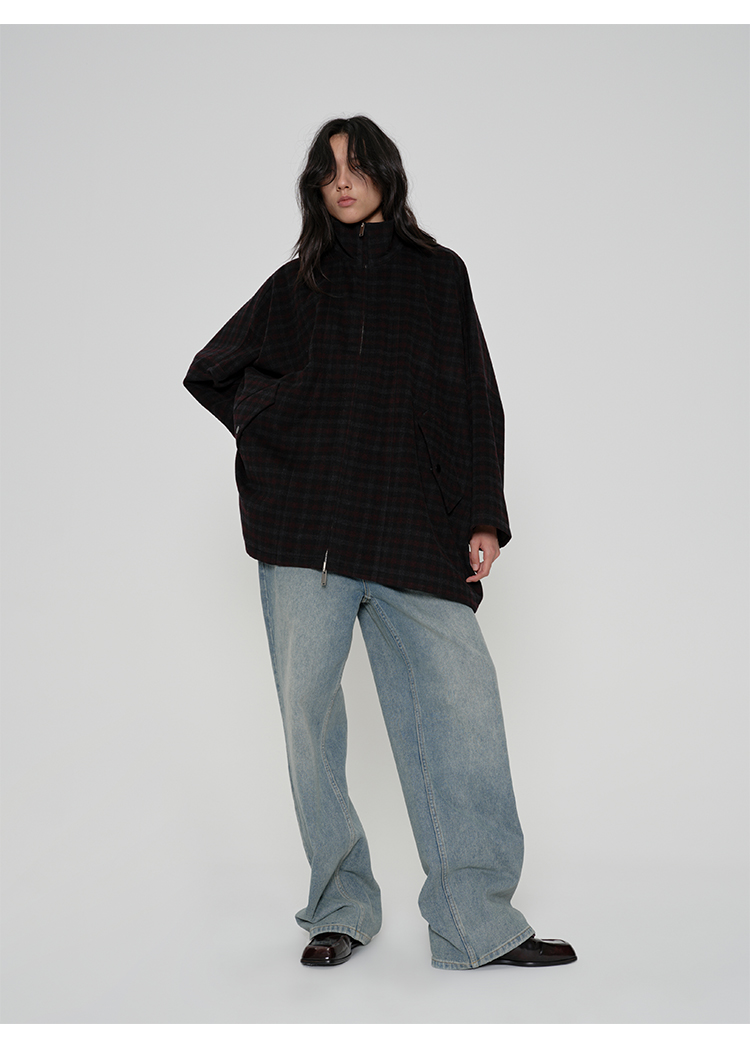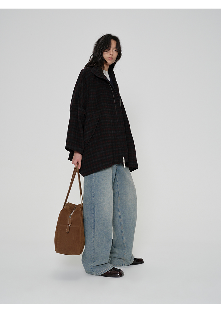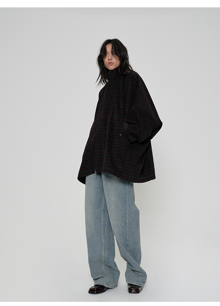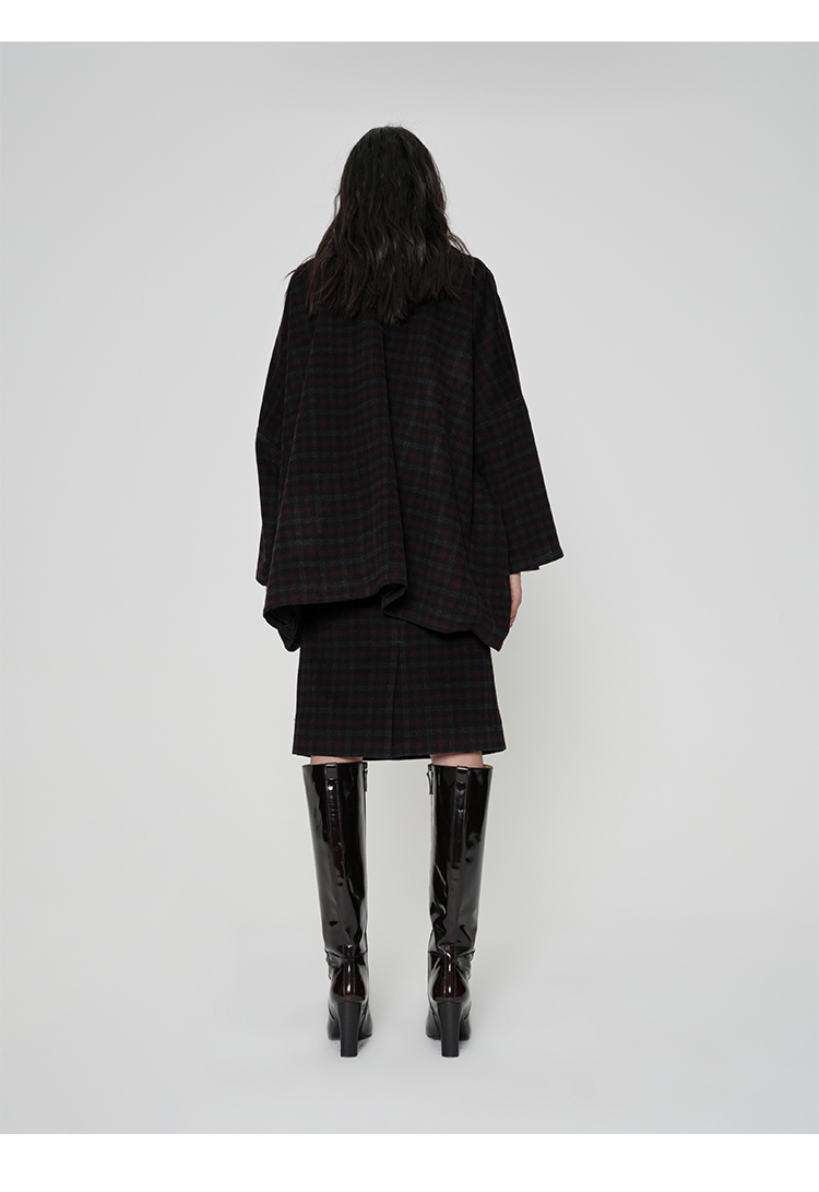 HIDEMI 甄选色织格纹羊毛拉链伞状极简廓形设计感大衣外套
