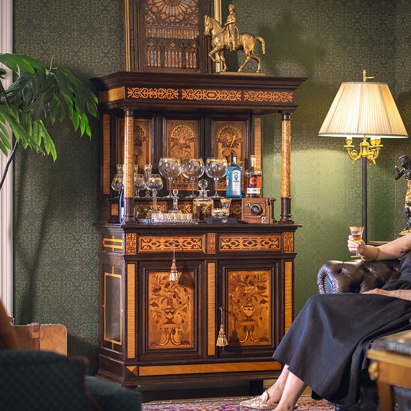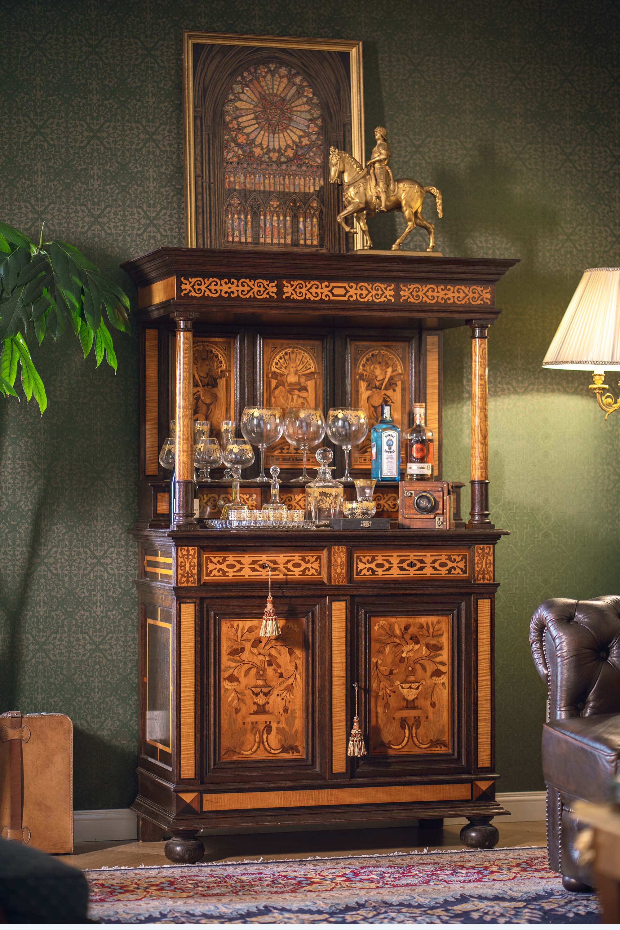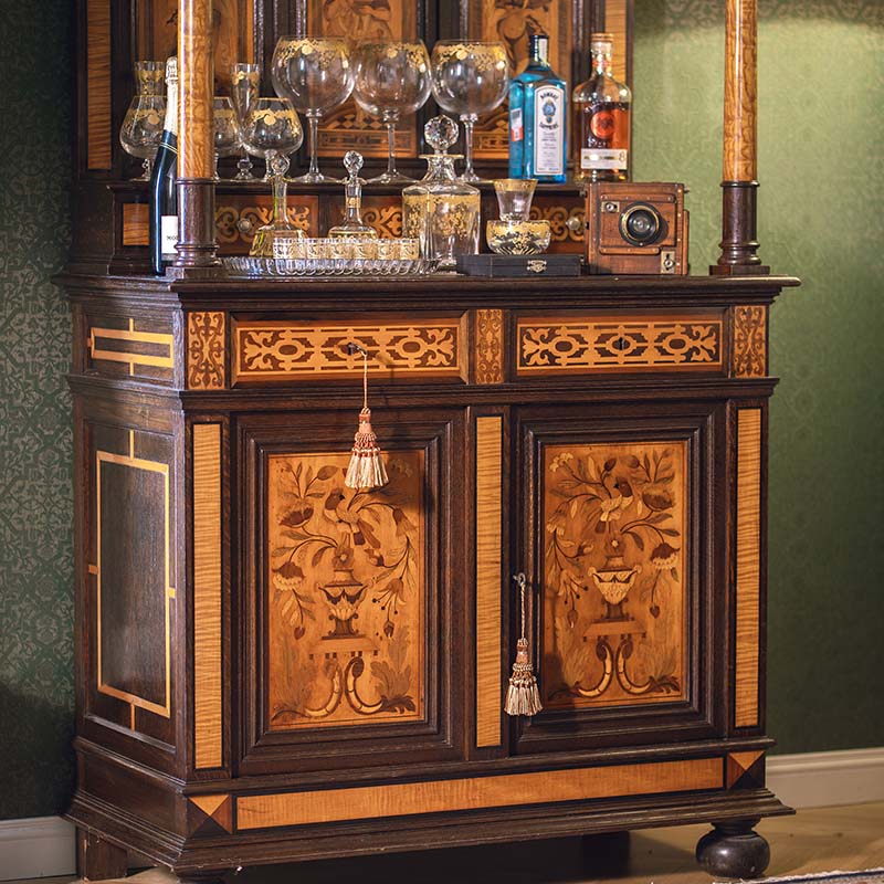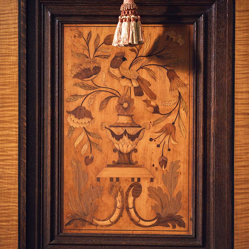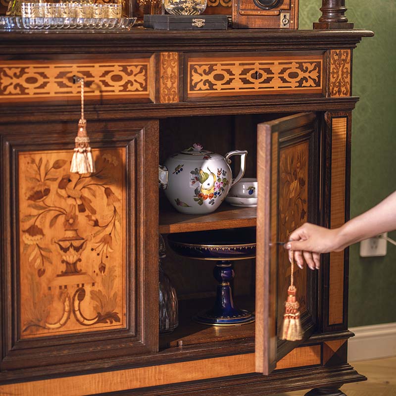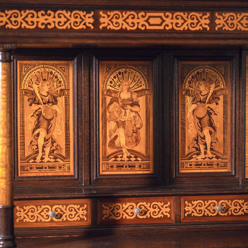 1890年代法国出品路易十六风格实木精雕装饰美惠三女神及古器花卉主题细木镶嵌边柜
