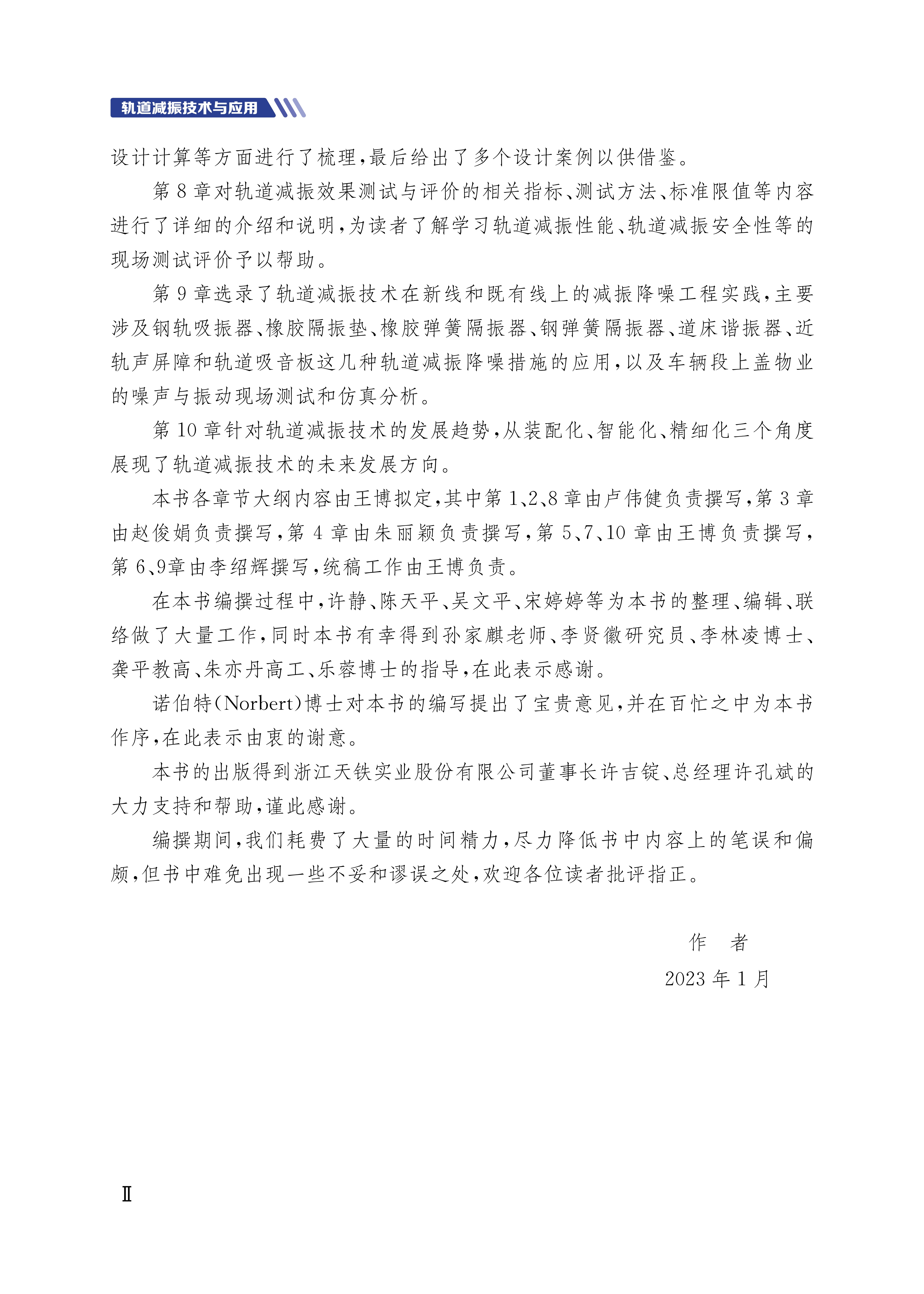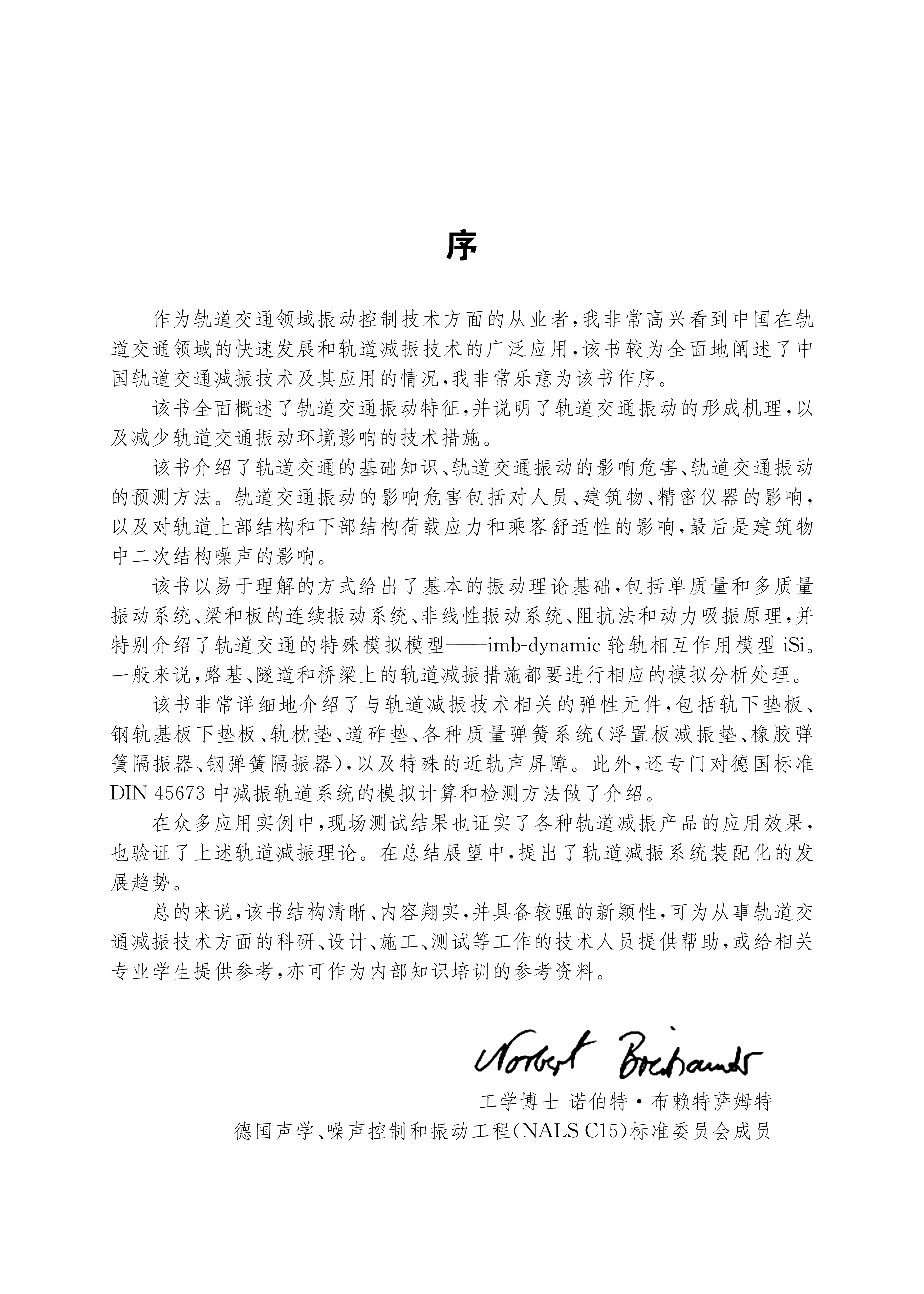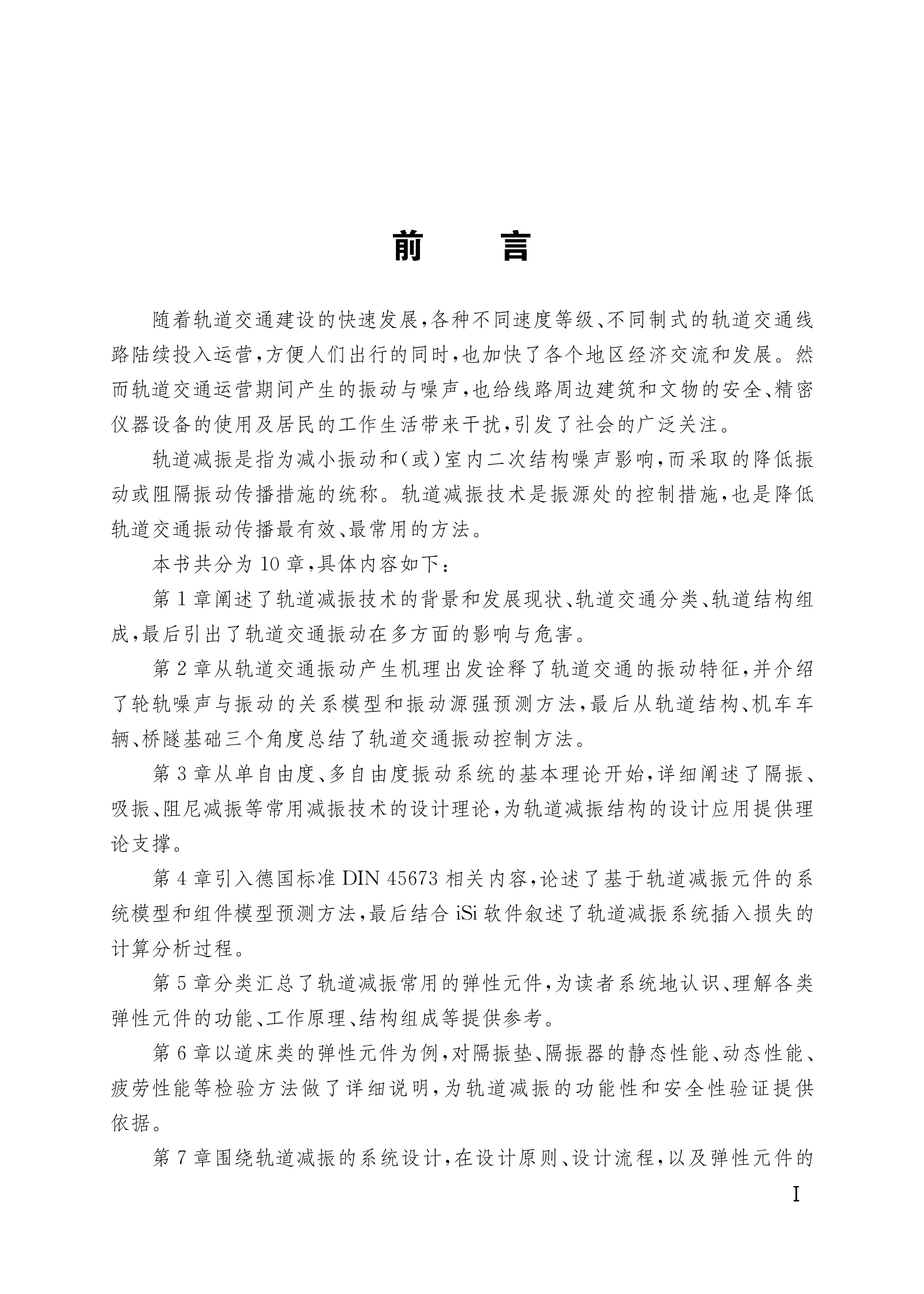 全书共分10章,分别为绪论、轨道交通的振动特征及控制方法、轨道减振理论基础、常用的轨道结构弹性元件、工程方法、轨道减振系统设计、弹性元件测试、测试与评价、应用案例、展望。