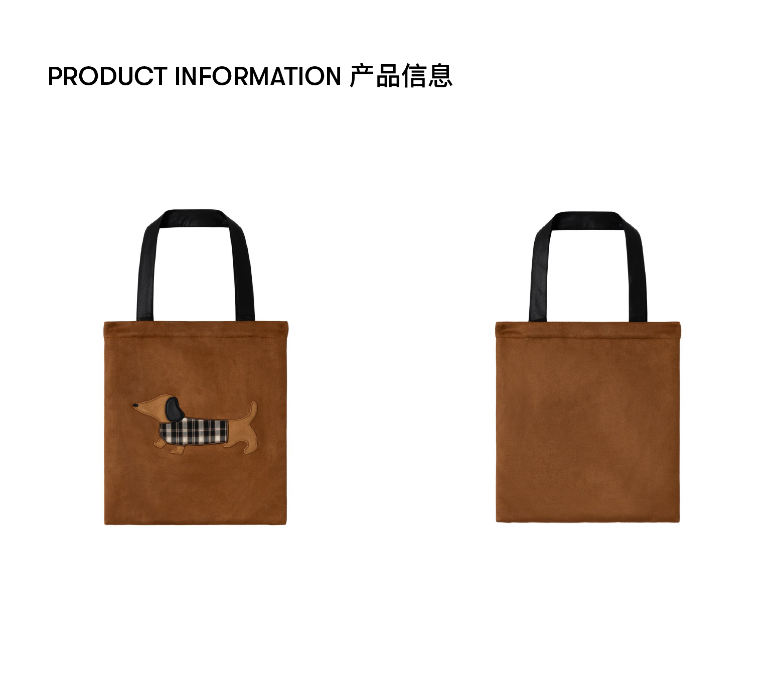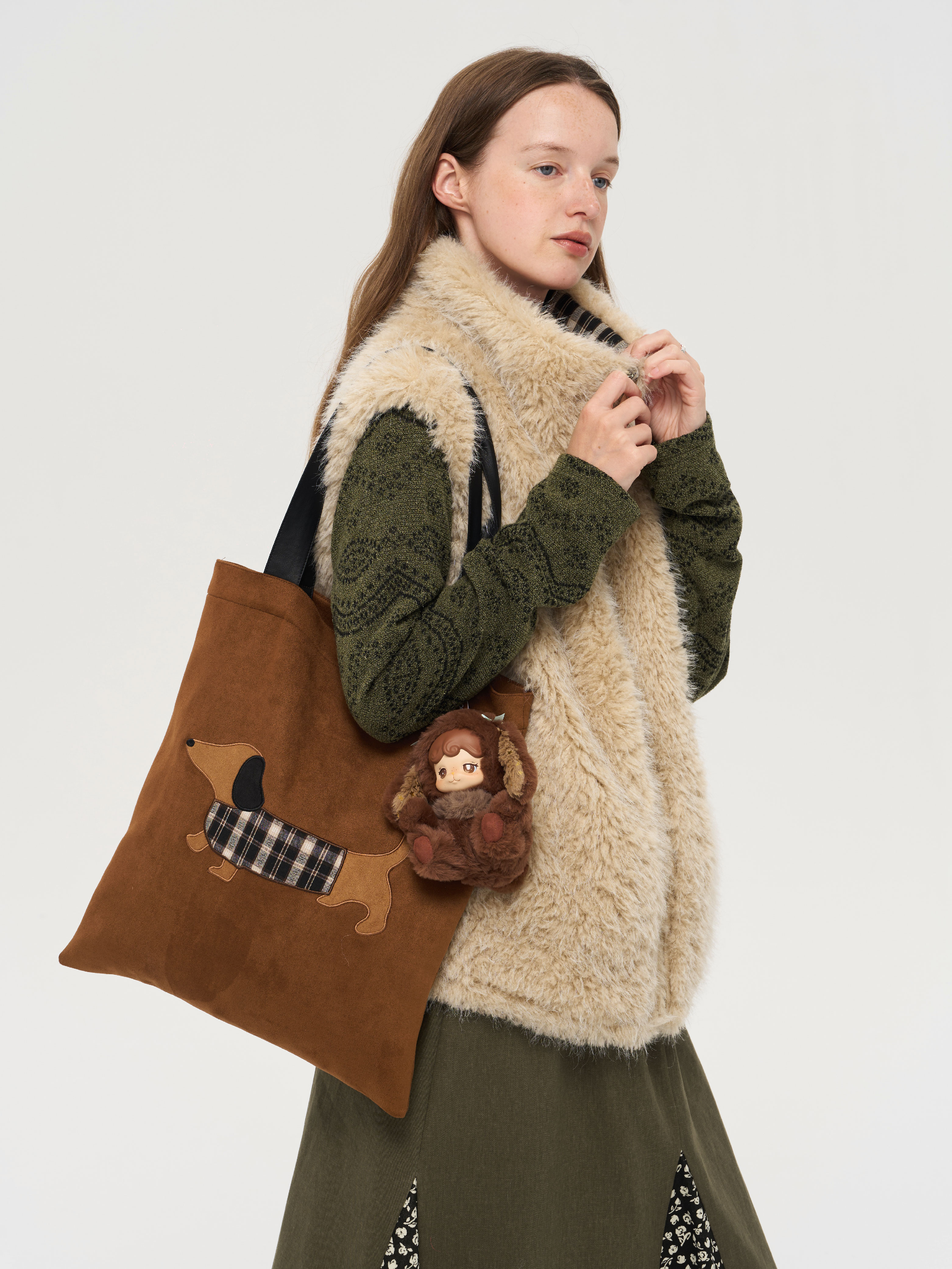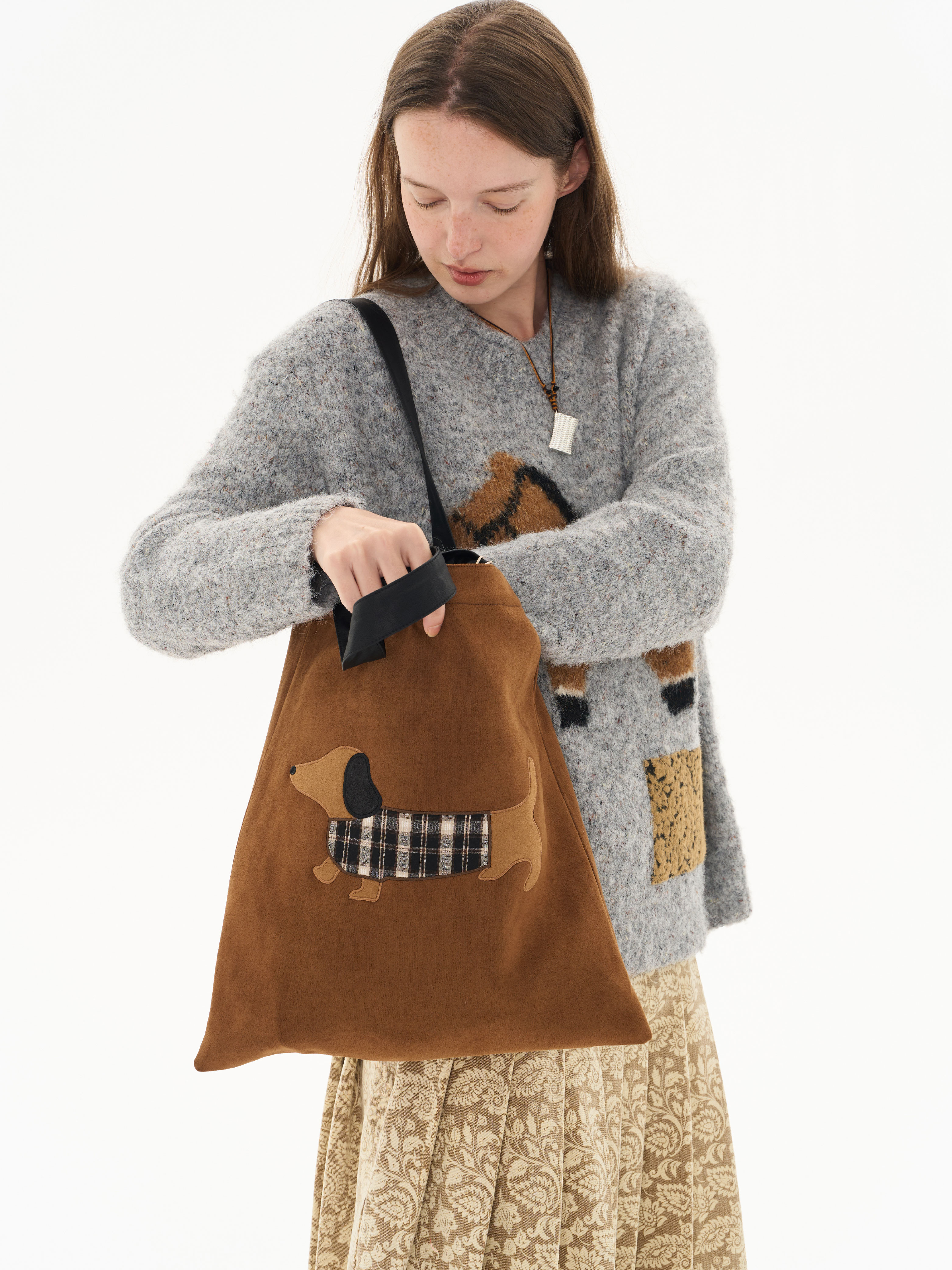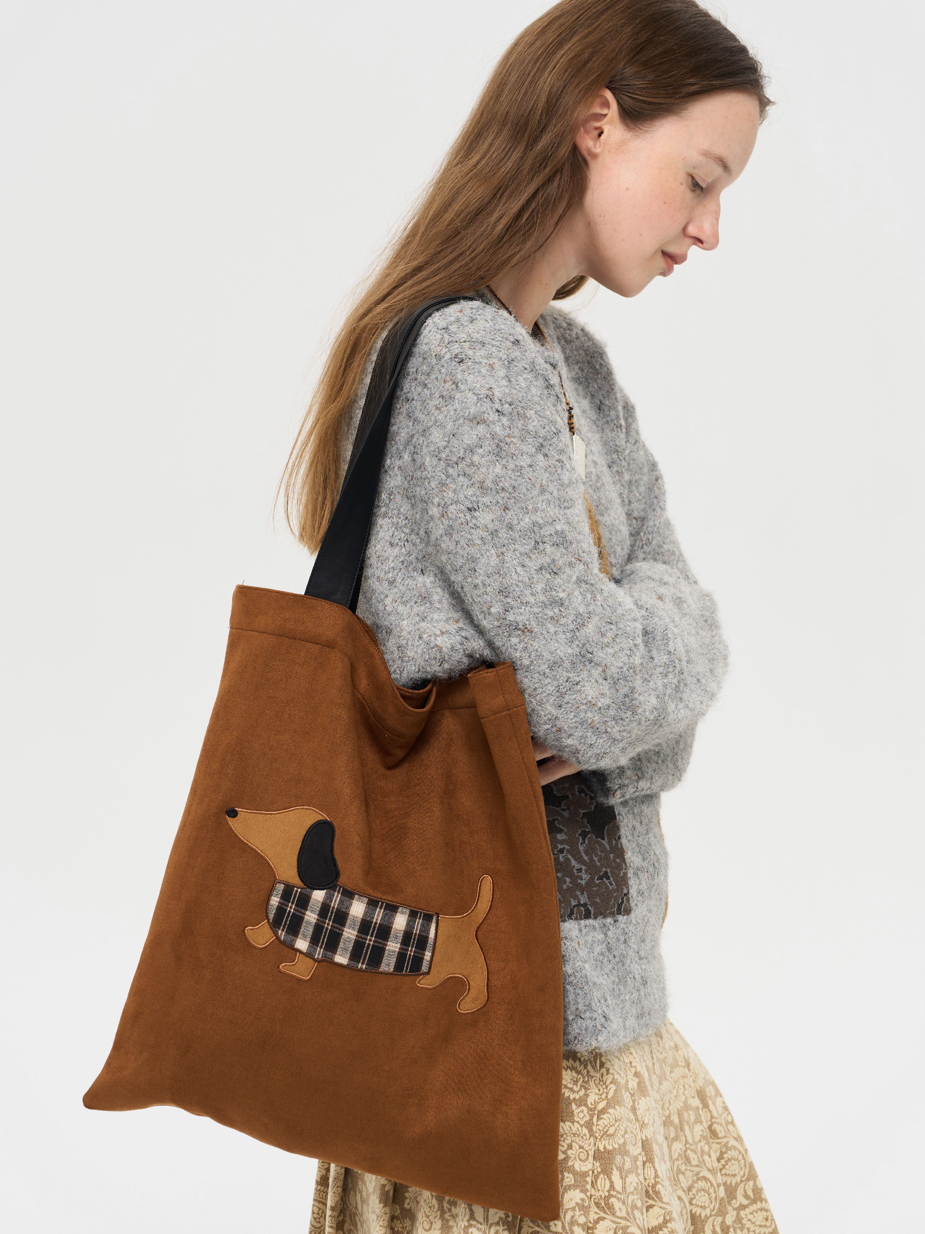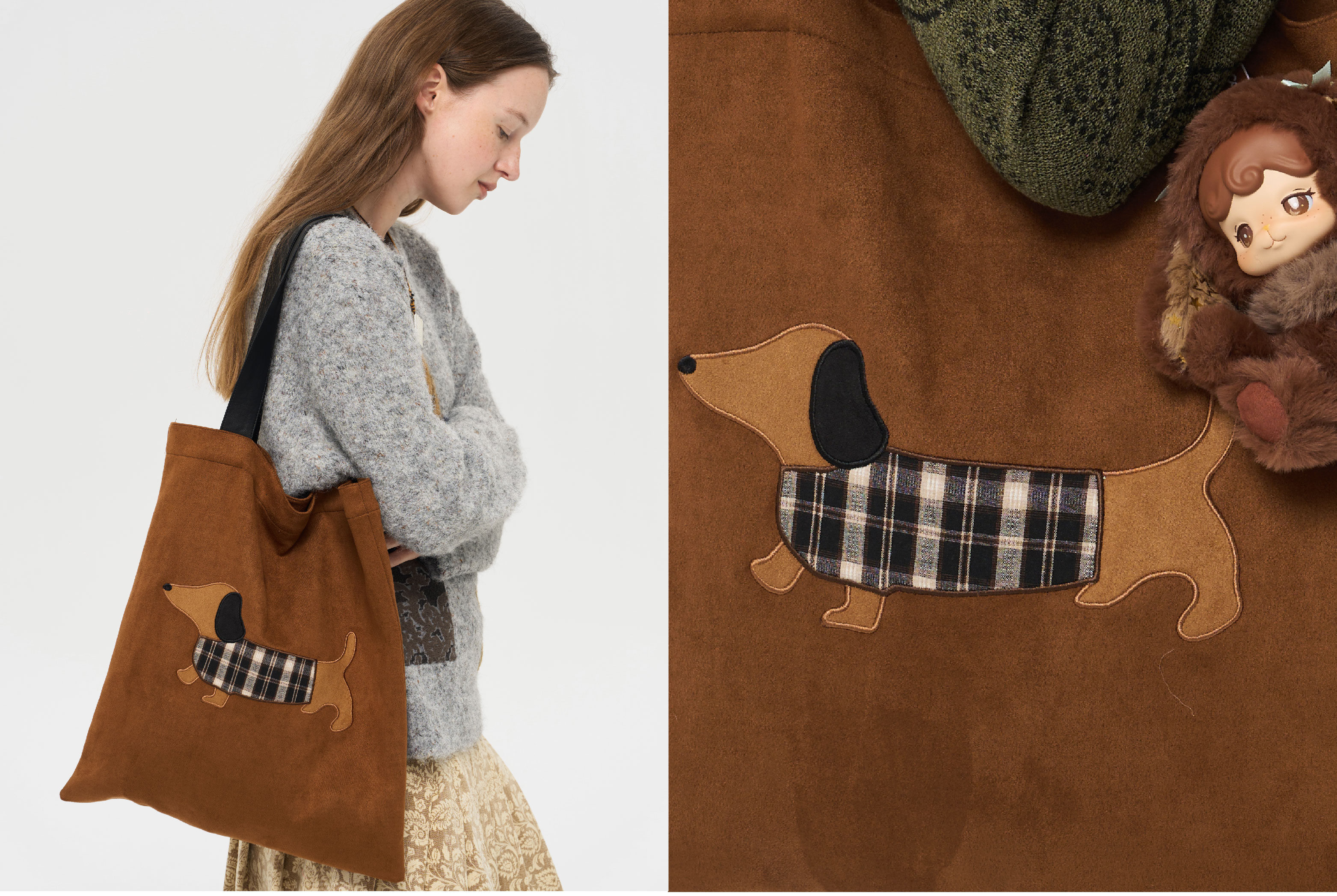local tag/lt25awk54/穿格纹外套的小狗 暖棕麂皮重工贴布绣托特