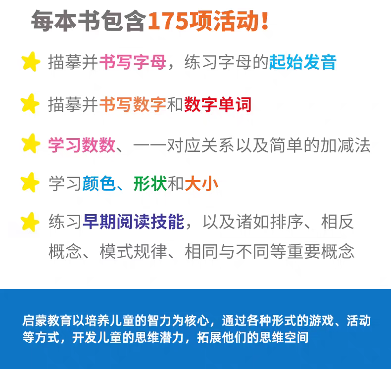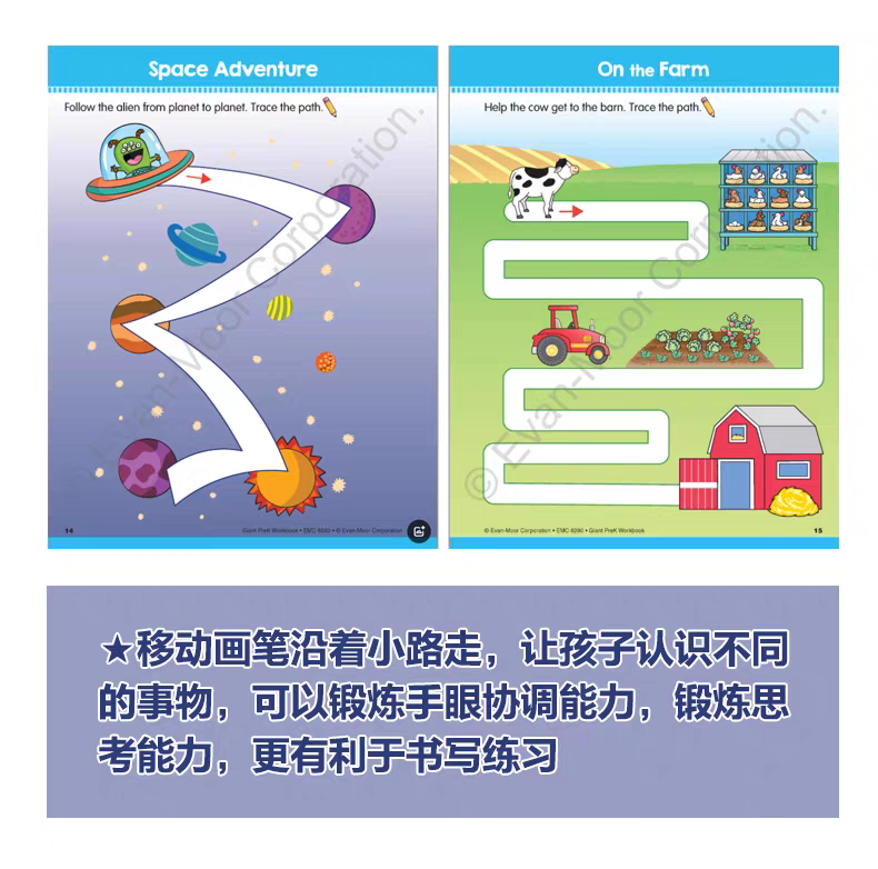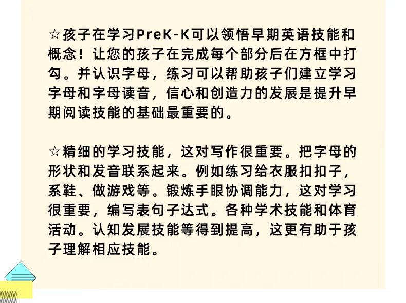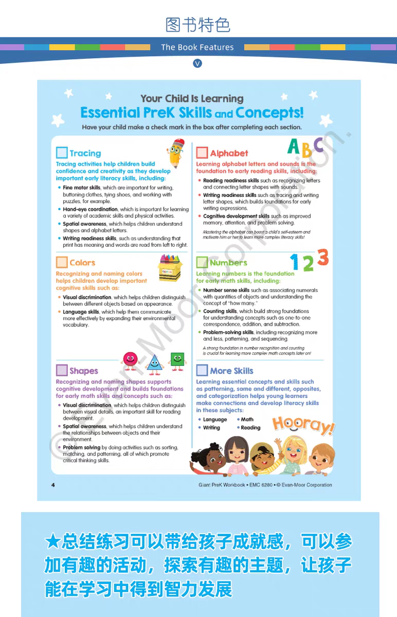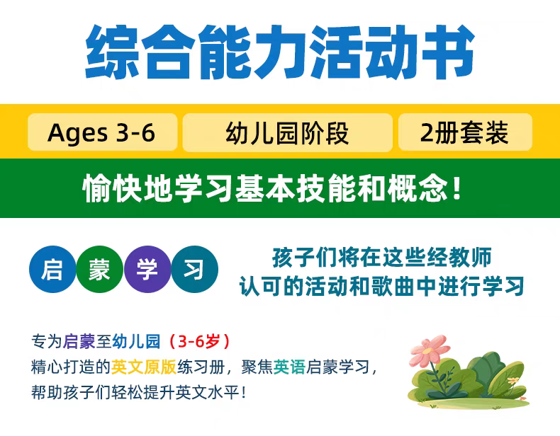 这本练习册配有精美的插图,内容适合孩子的年龄,并融合了趣味性和教育性挑战,非常适合帮助幼儿园的孩子建立自信、练习关键技能,并让他们在学习中感受到乐趣——无论是在家、外出还是在学校假期。