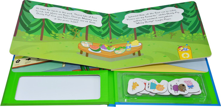 8个角色磁铁偶:小猪佩琪、弟弟乔治、猪爸爸、猪妈妈、恐龙等等,5大场景:博物馆、公园野餐、海边、派对和晚安时间。在左页会描述情况并有线索让小朋友可以从磁铁中找出场景中需要的角色并放上去,右页会称赞小朋友完成的很棒,让小朋友更有动力玩下去。小朋友们可以跟着剧本走,也可以自编自导喔!指头动动,头脑动动的过程中,口语表达和想像力也跟着提升喔!