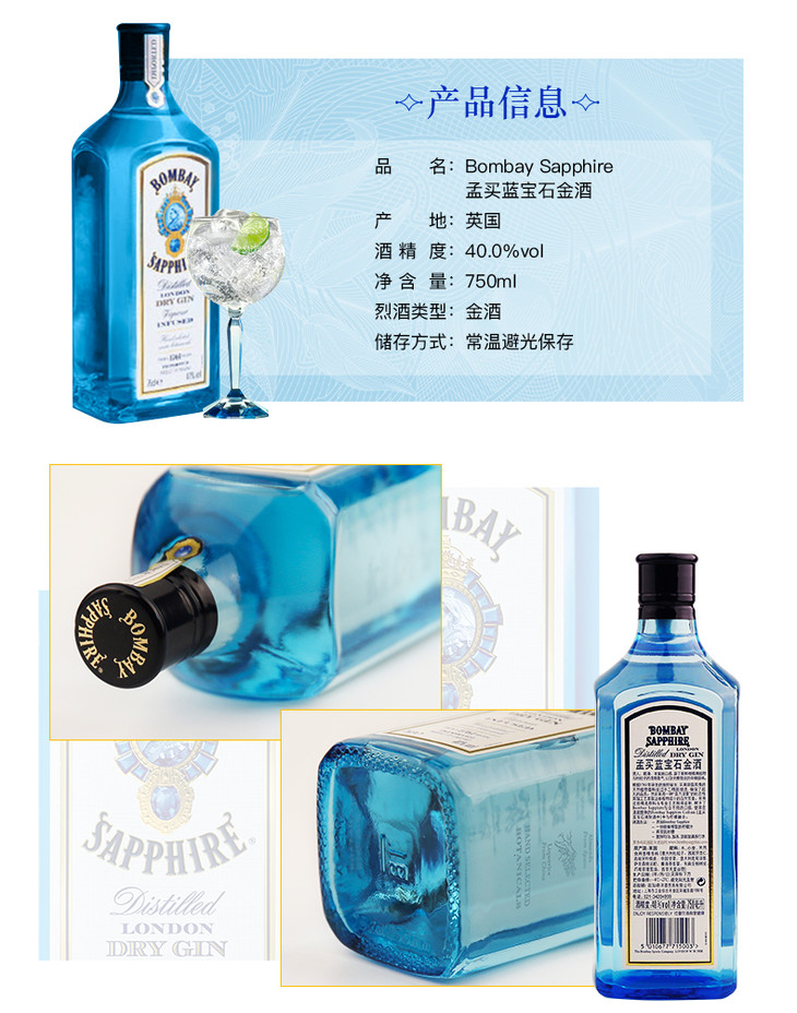 【单瓶】孟买蓝宝石金酒 40%vol 750ml