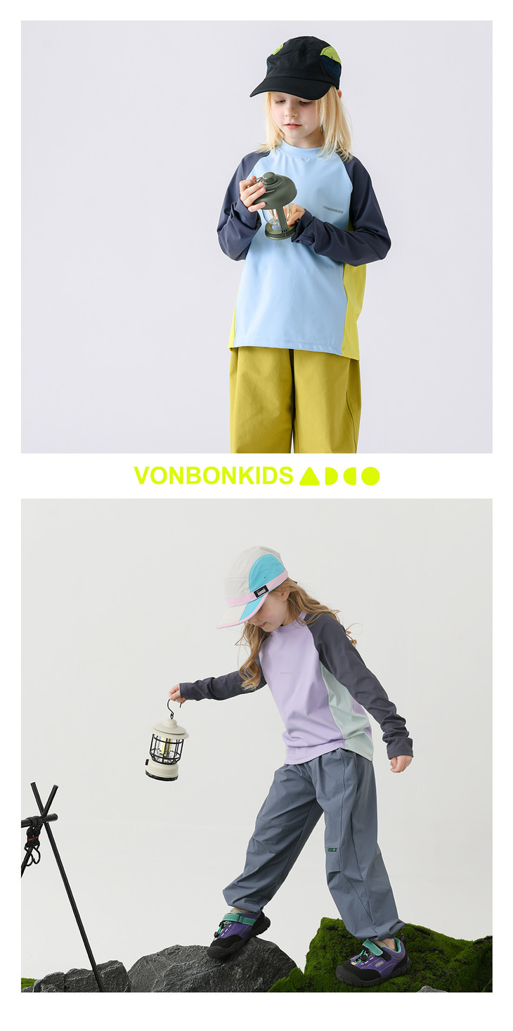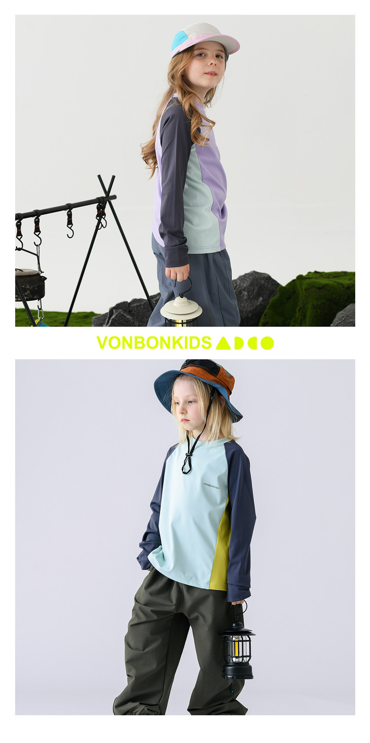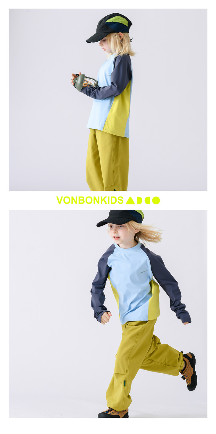 这款山系小凉皮上衣的拼接撞色设计,是它的一大亮点: 视觉层次:打破了纯色的单调感,让整体造型更有层次和立体感。 山系氛围:每个颜色的组合自带户外清爽感,侧边的拼色设计又增添了活力感,完美契合山系户外的潮酷调性,让孩子穿出门就是整条街最亮眼的崽。 百搭属性:搭配不挑下装,无论是同系列的黄色运动裤,还是日常的牛仔裤、短裤,都能轻松适配,一件就能穿出多种风格。