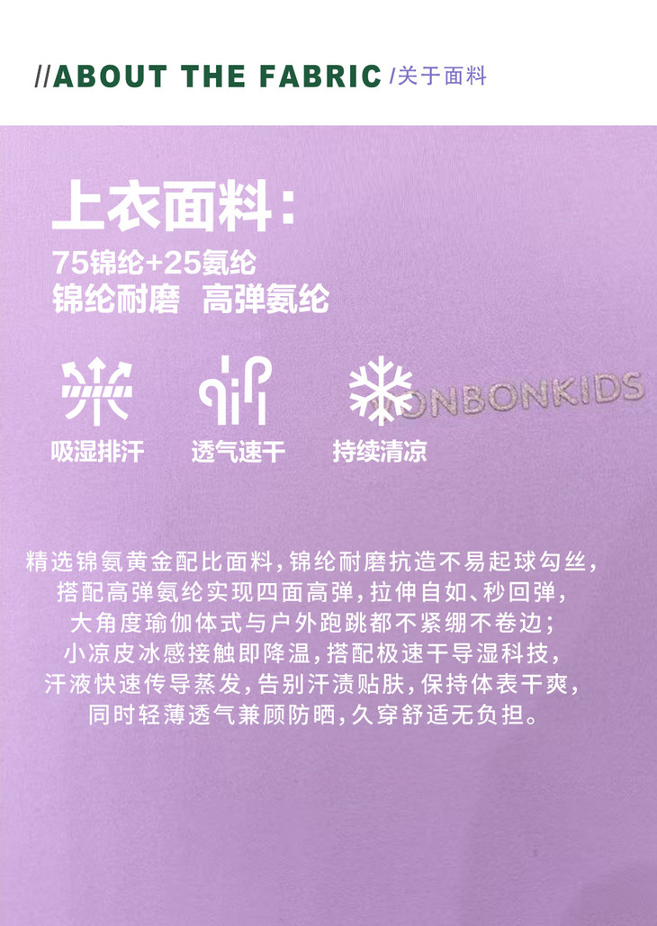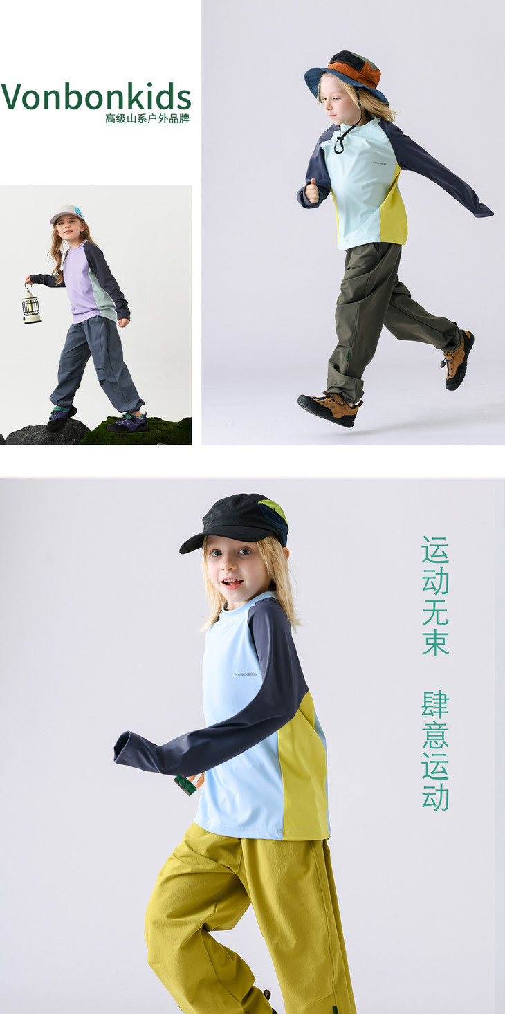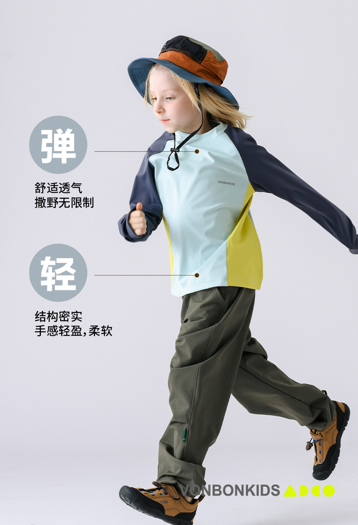 超高氨纶配比带来的超强弹力 做到了让孩子在户外运动中不被束缚 添加冰凉手感,穿着可舒服了 别看它这么软穿在身上却很有型😏