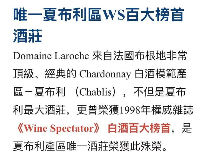 这款马克龙同款夏布利是一款非常适合夏日的勃艮第白葡萄酒,带有柑橘皮和百里香的迷人香气,再带有些许矿物质的气息。浓郁、迷人、优雅,平衡感极佳。悠长而明显的矿物质余味完美诠释了这款酒严肃而迷人的特点,非常迷人!尾韵甜美柔和。 其持久的酸度和回味,不管是搭配生蚝、大虾、扇贝、各种鱼类还是各种夏日水果,只能说是一绝!