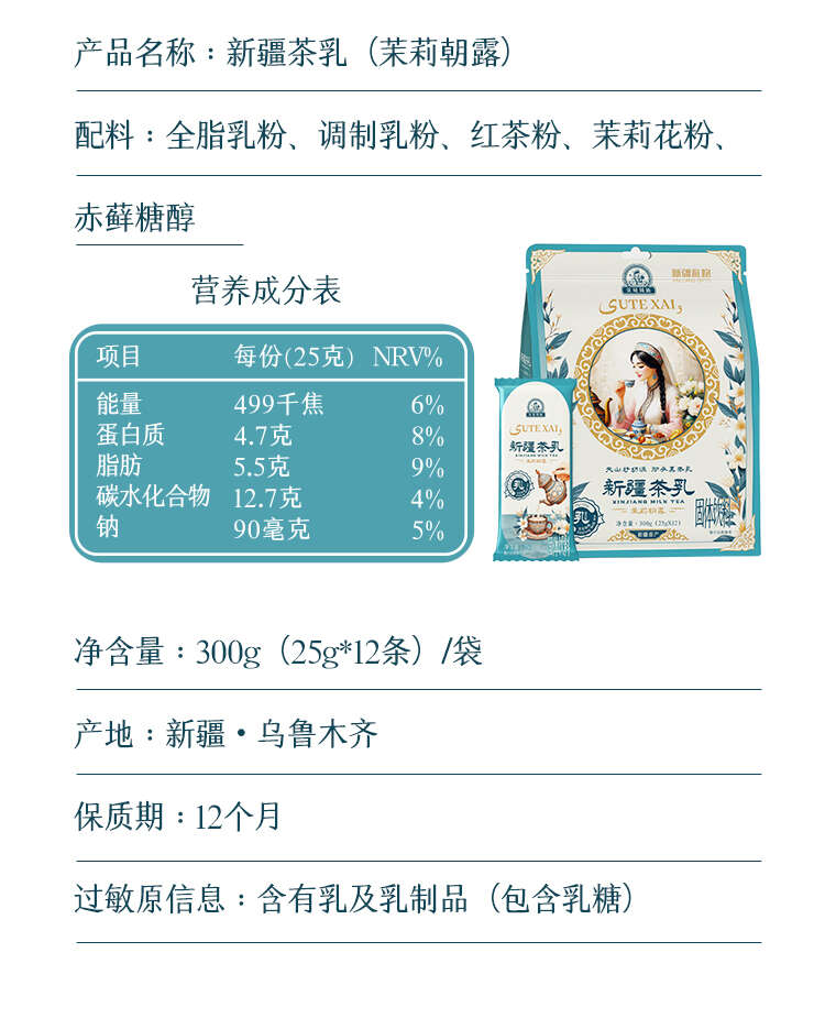 新疆茶乳(茉莉朝露):全脂乳粉、调制乳粉、红茶粉、茉莉花粉、赤藓糖醇