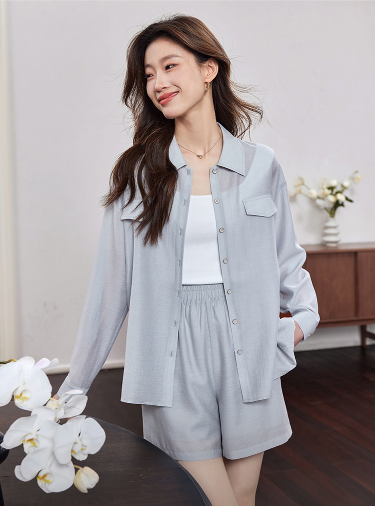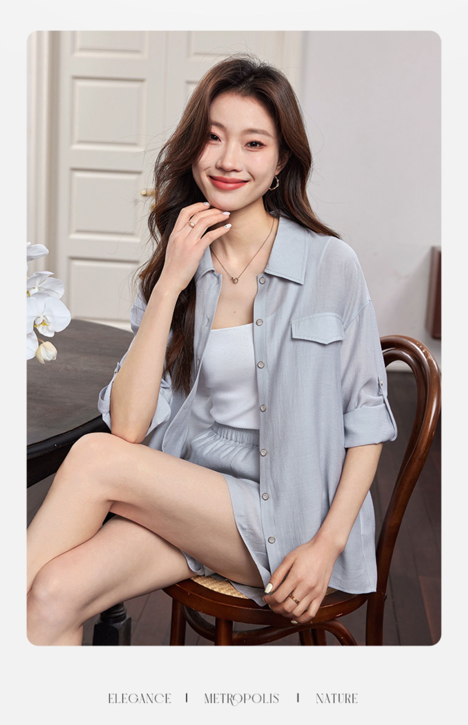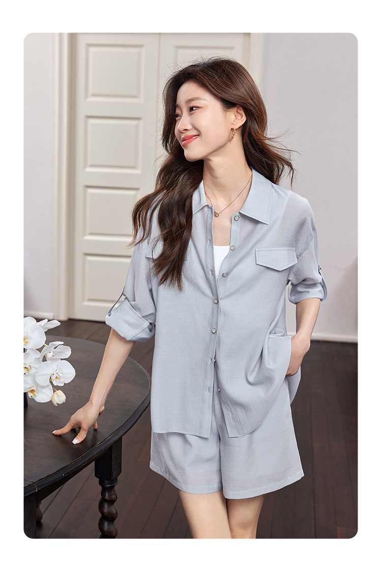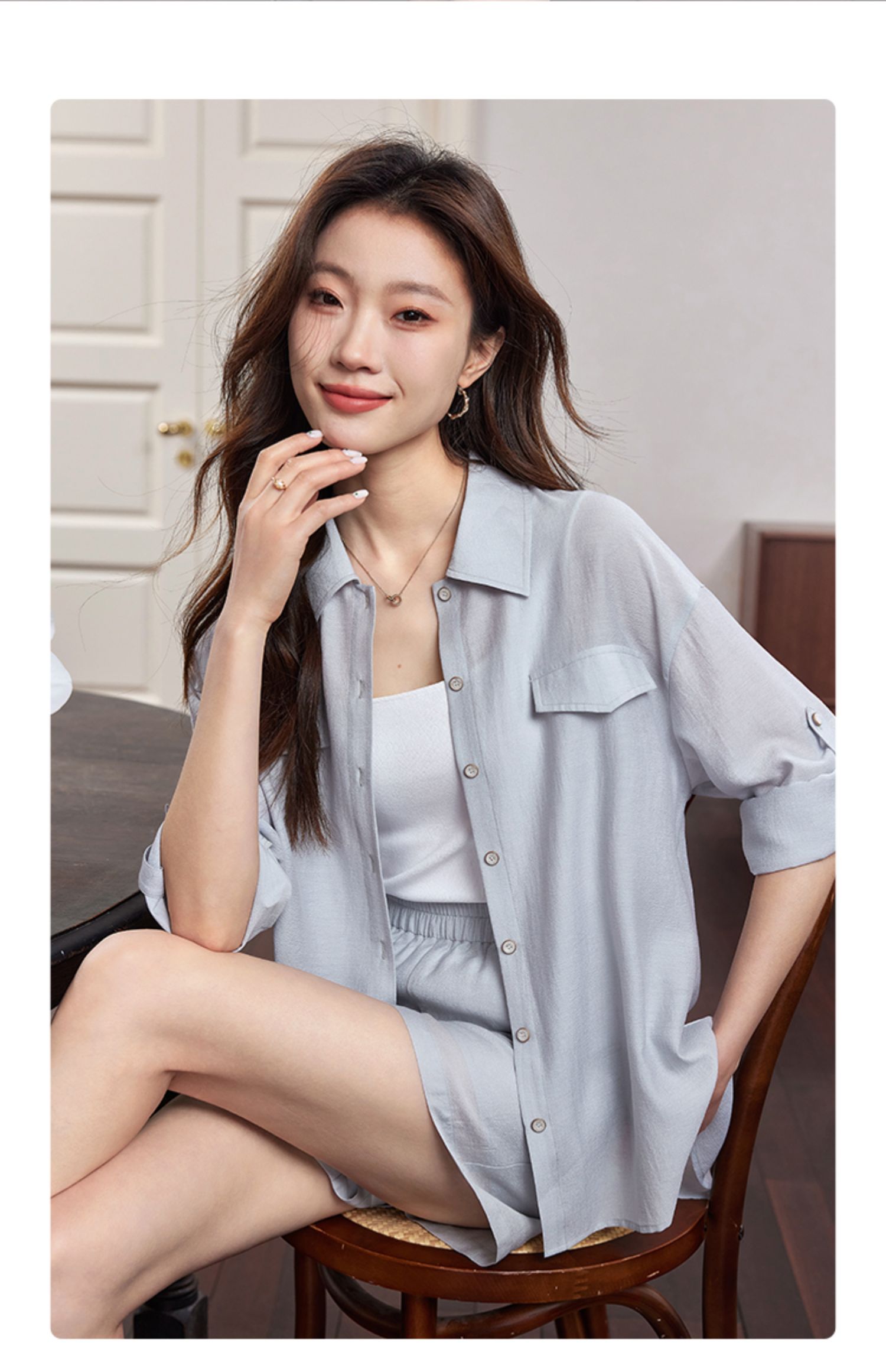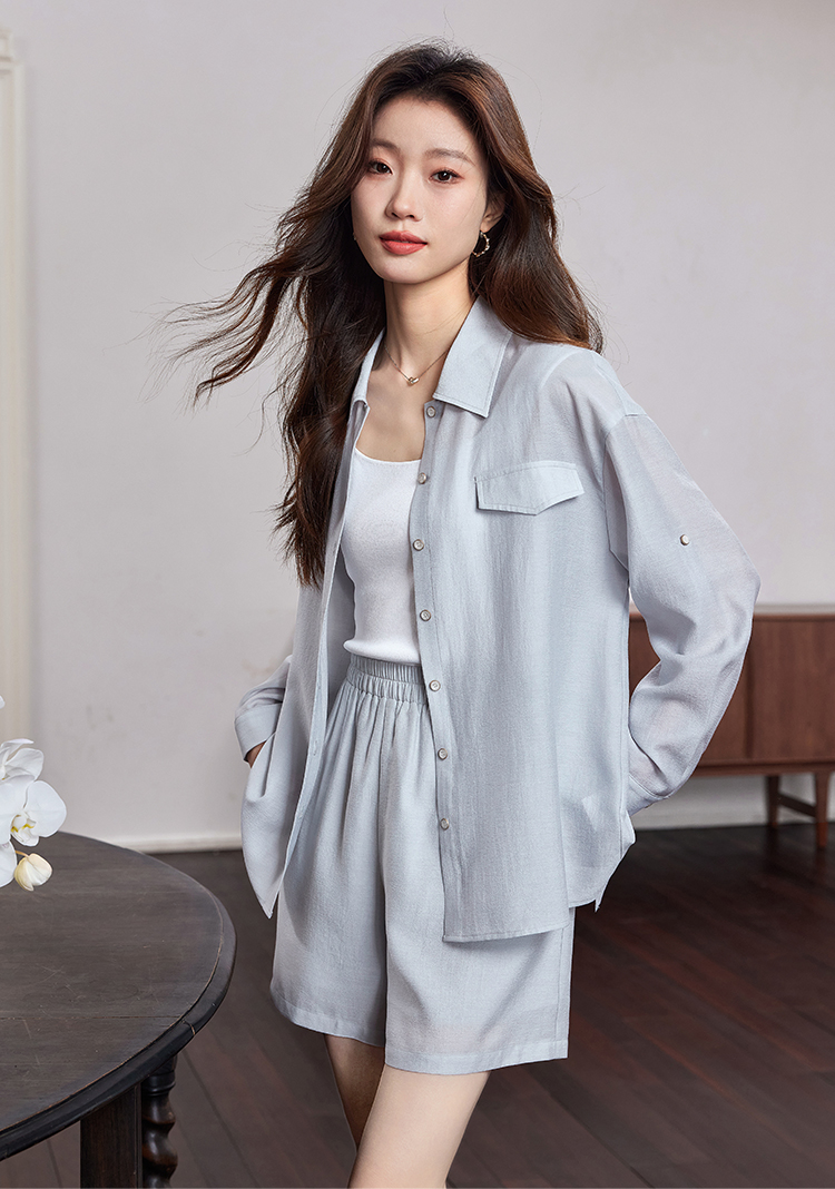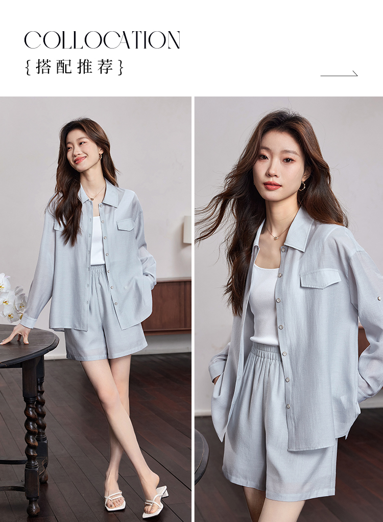 【专属特价】熙世界夏装搭配一整套女醋酸防晒衬衫外套休闲阔腿短裤两件套装