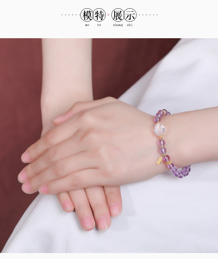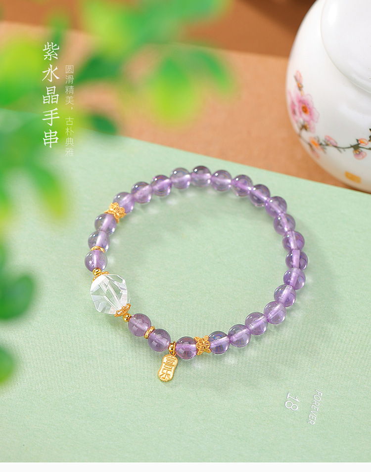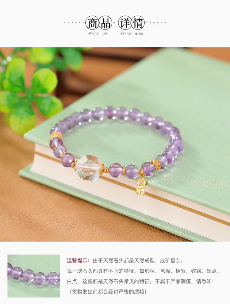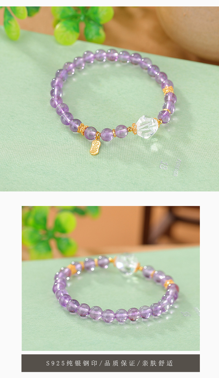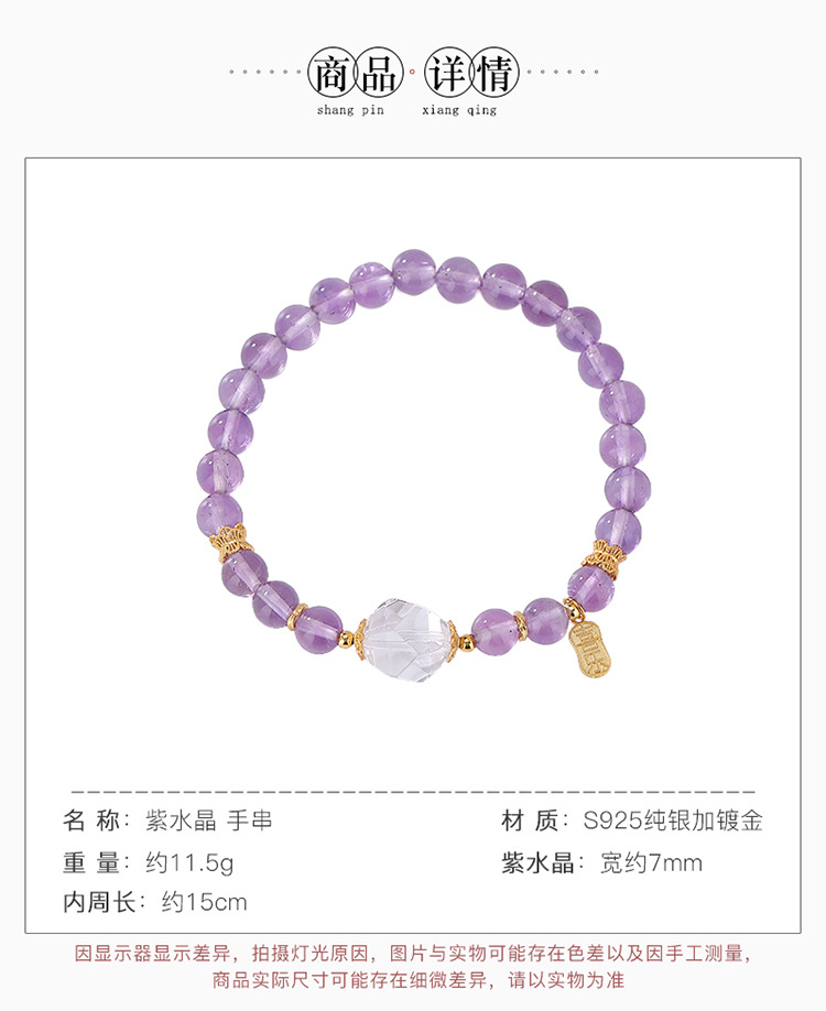 【喜乐安康】S925银镀金紫水晶白水晶福牌圆珠手链【CW-SL11732-8】