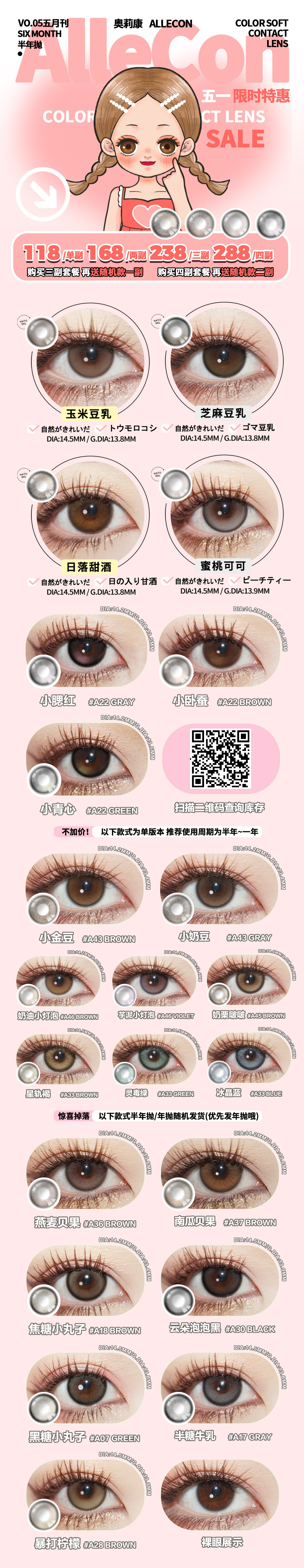 AlleCon年抛&半年抛活动·0-1000度(有525/575)·玉米豆乳&芝麻豆乳&日落甜酒&蜜桃可可&小腮红&小卧蚕&小青心&小金豆&小奶豆&奶油小灯泡&奶栗啵啵&燕麦贝果&南瓜贝果&焦糖小丸子