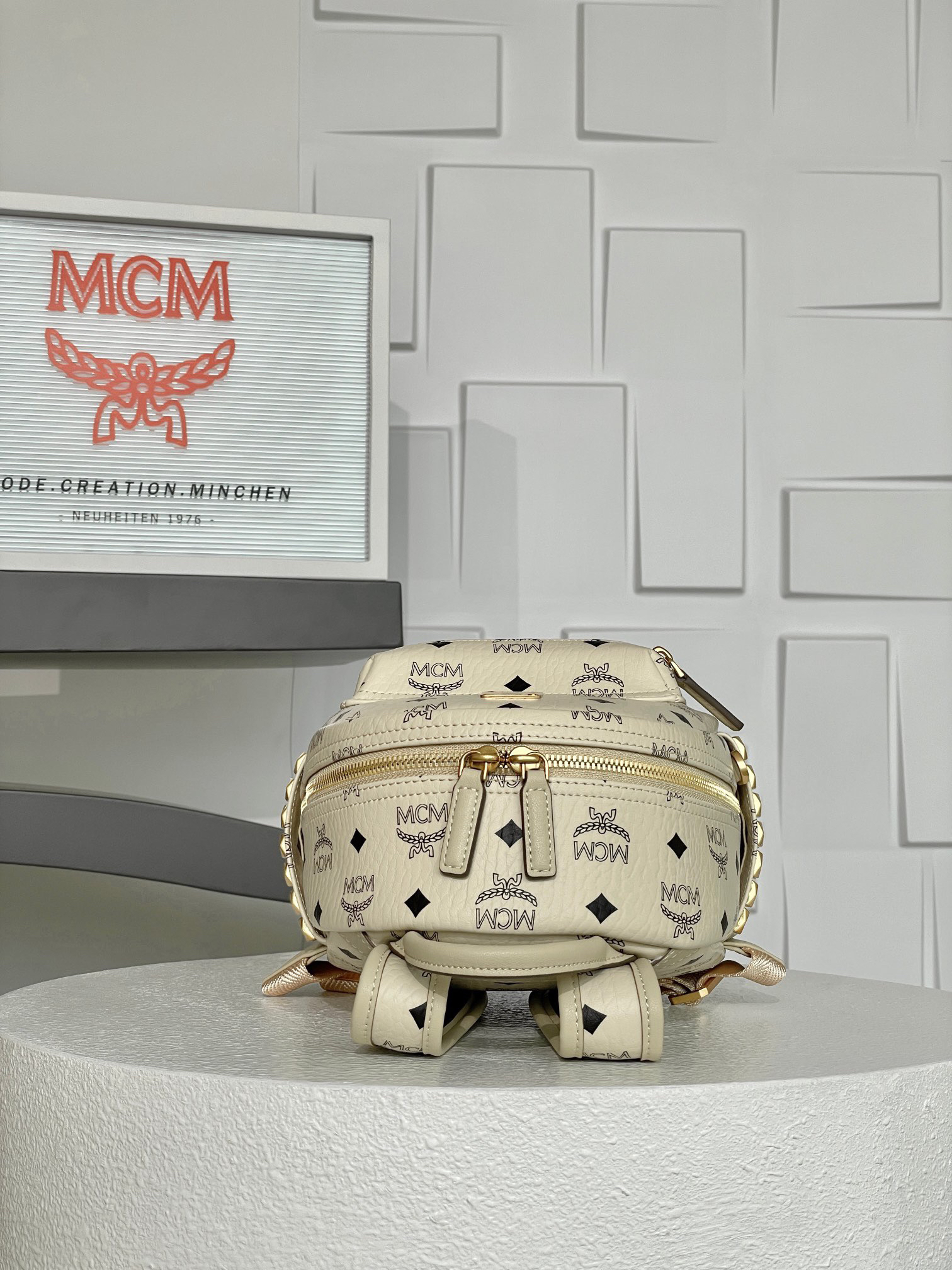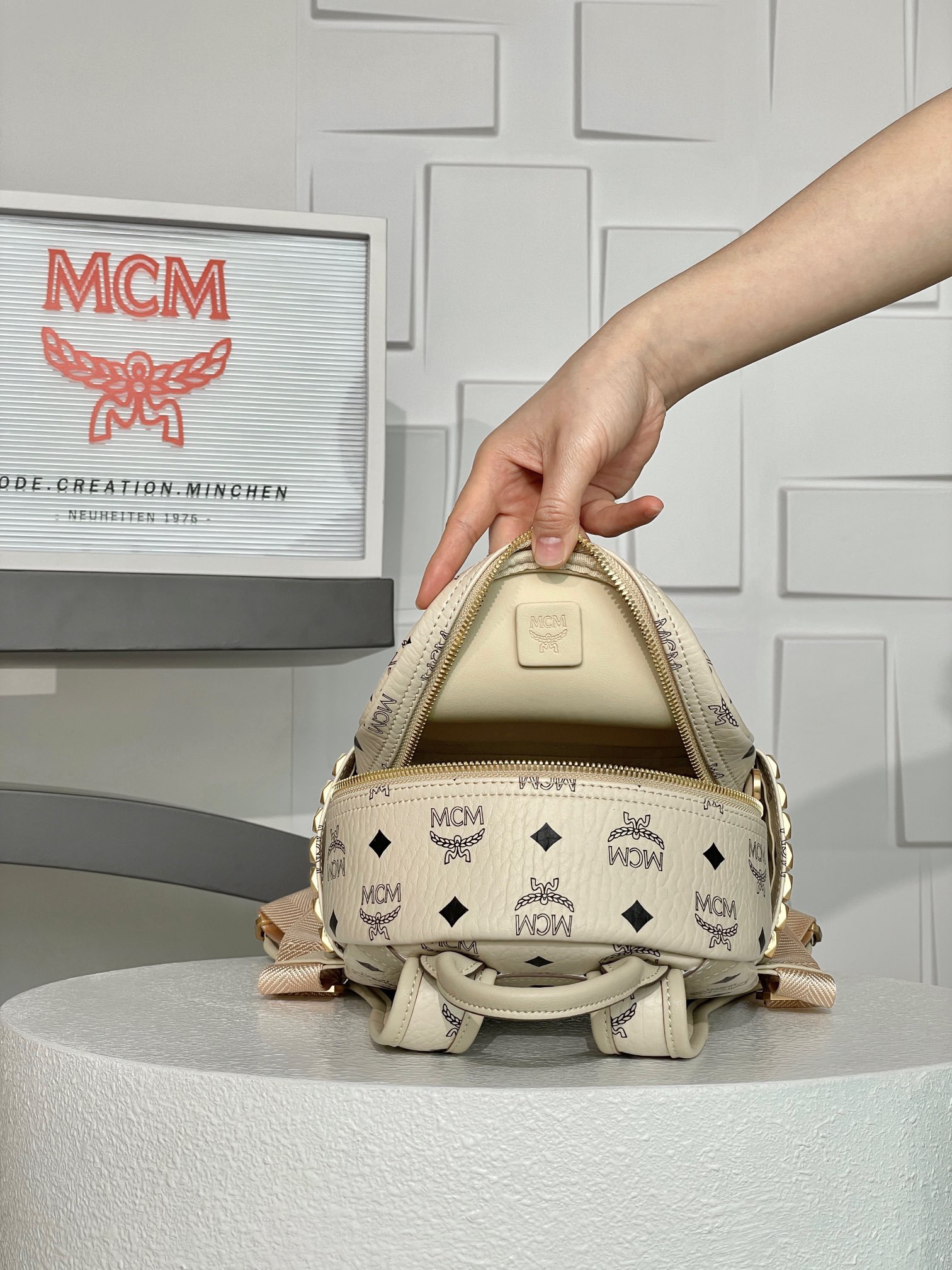 秋冬特惠💰900 原单MCM 原厂皮 新款米白色Mini铆钉双肩背包MMK6SVE37CO001 新品米白色 米白满印 这款新配色双肩背包
