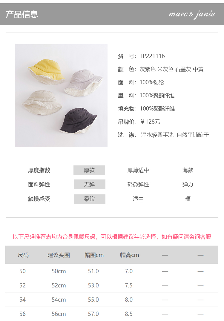 马克珍妮秋冬新款 男女童加绒渔夫帽 儿童渔夫帽221116