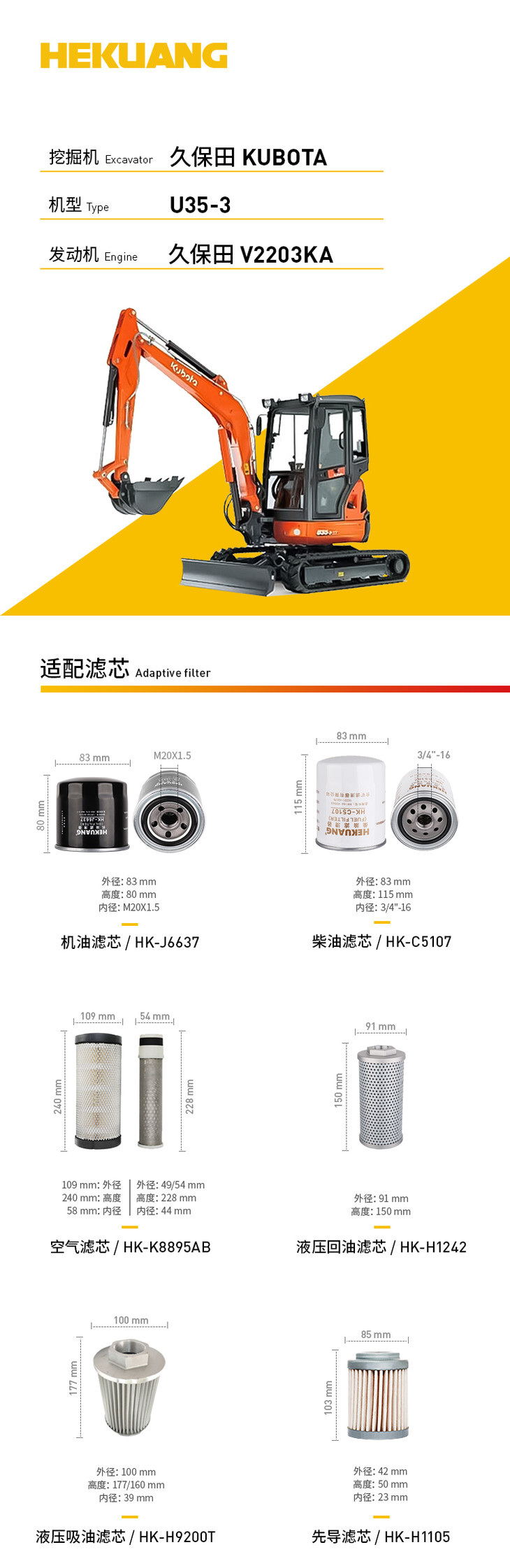 久保田U35-3(久保田V2203KA)挖掘机滤芯 机油柴油空气滤芯 液压油吸油回油滤芯