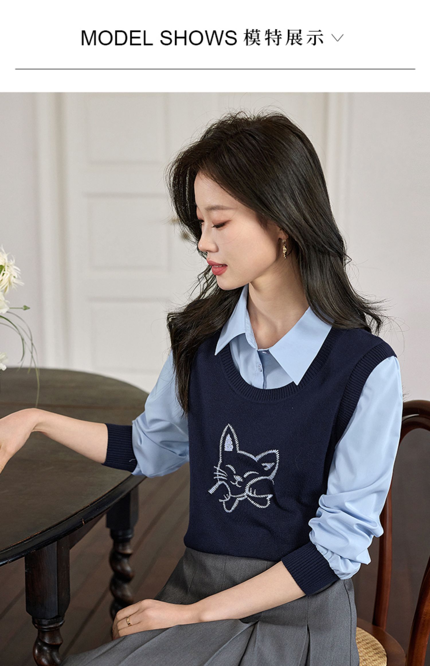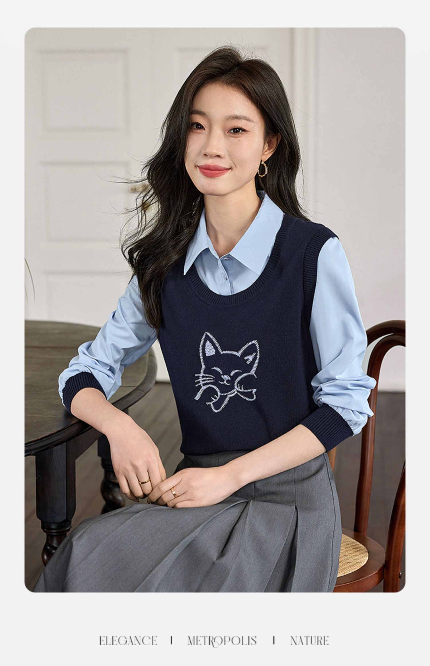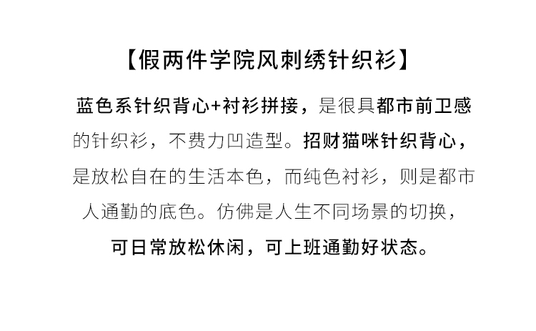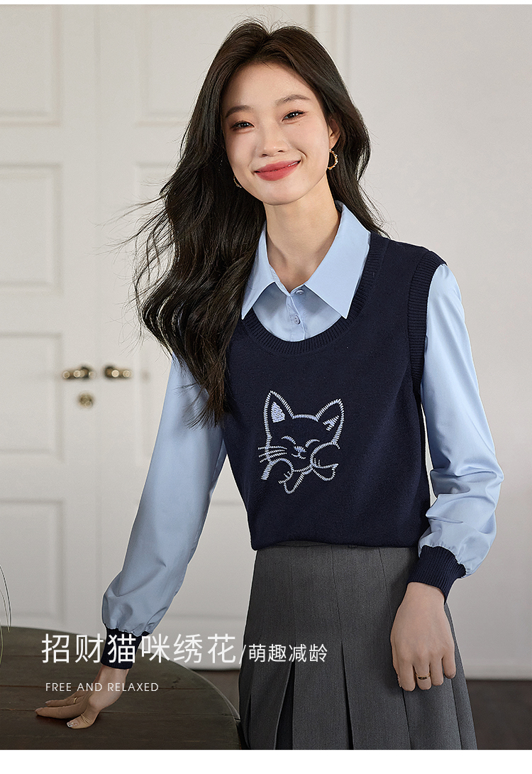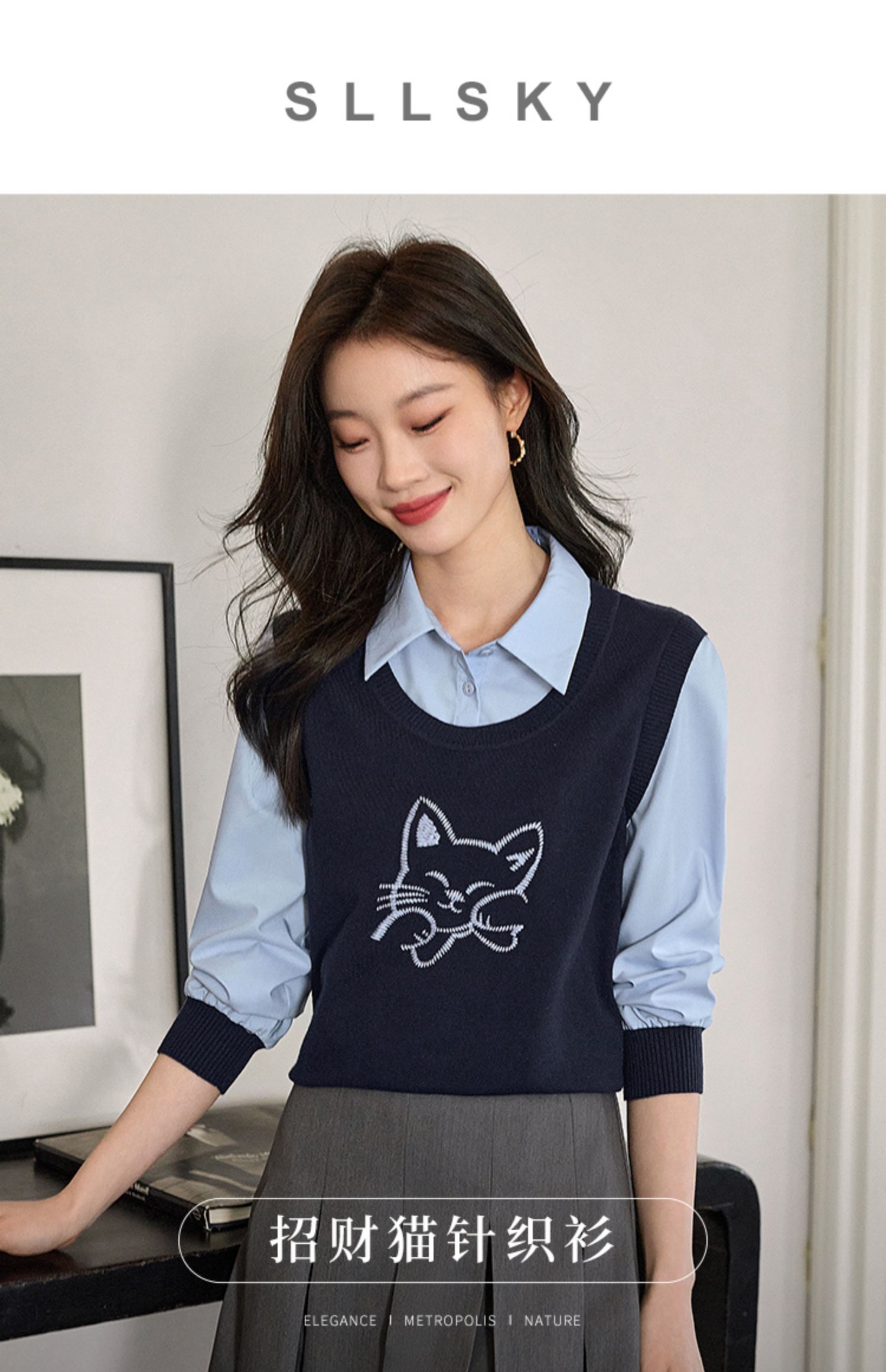 【1件72折】熙世界假两件学院风长袖POLO衬衫领猫咪刺绣针织衫女2025春新款