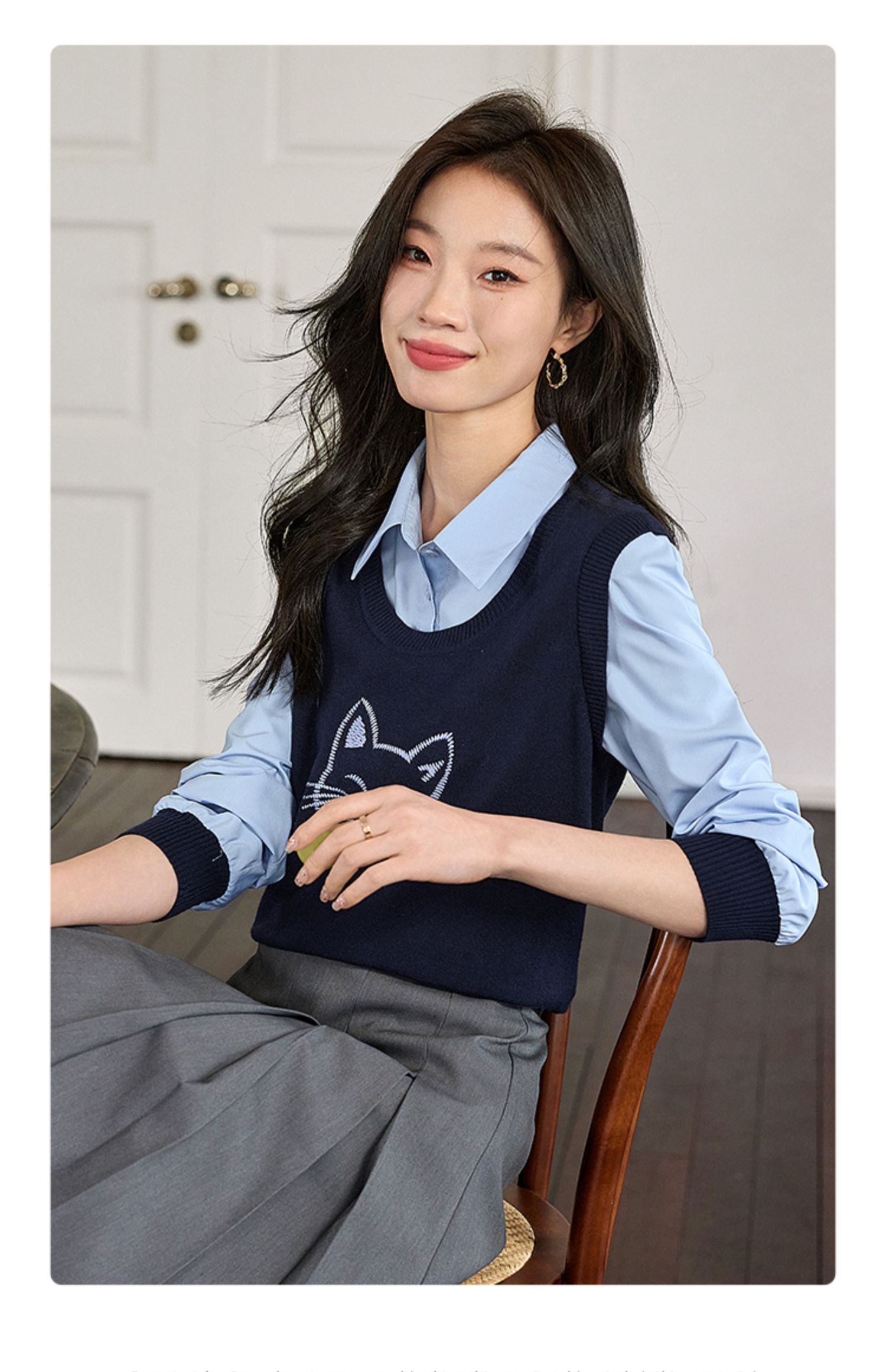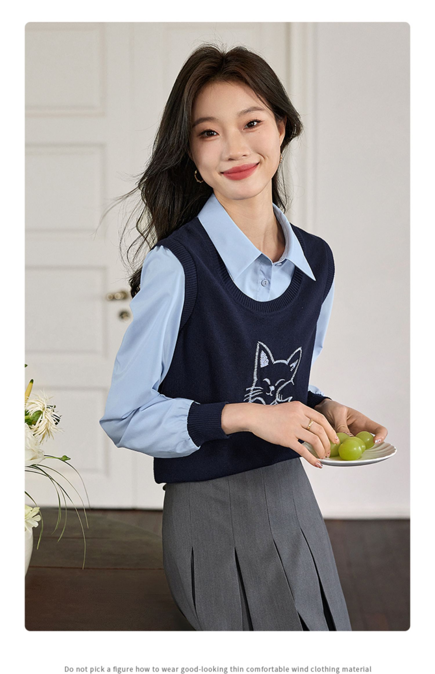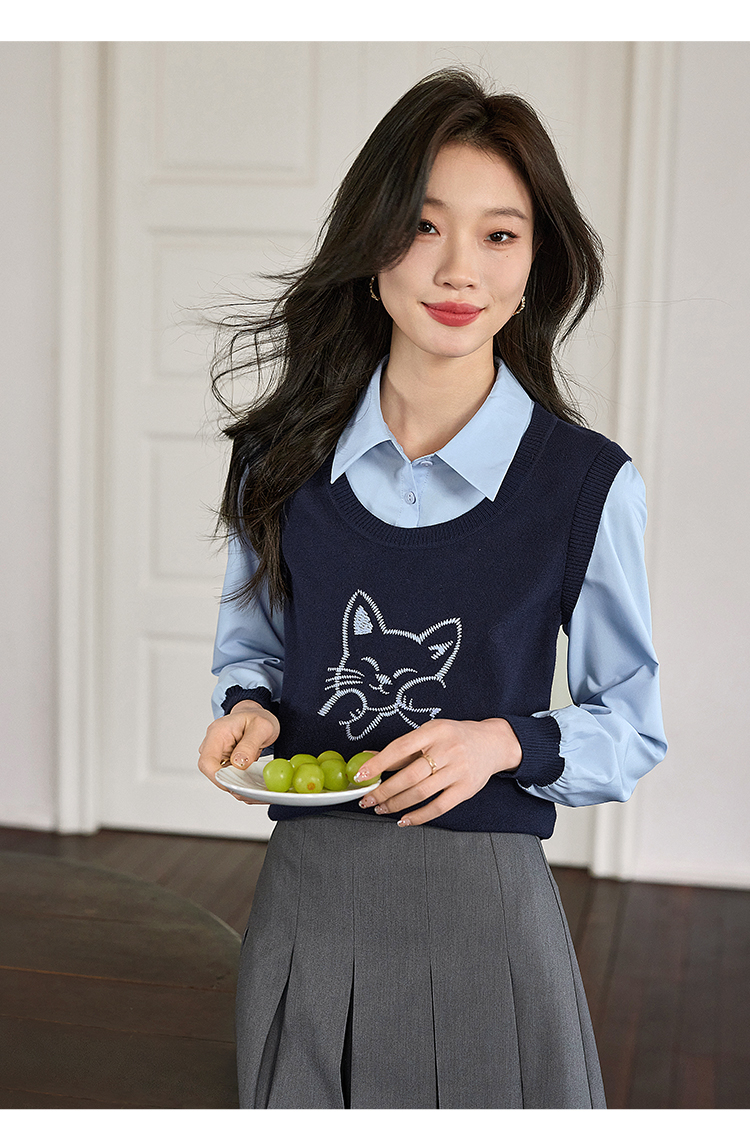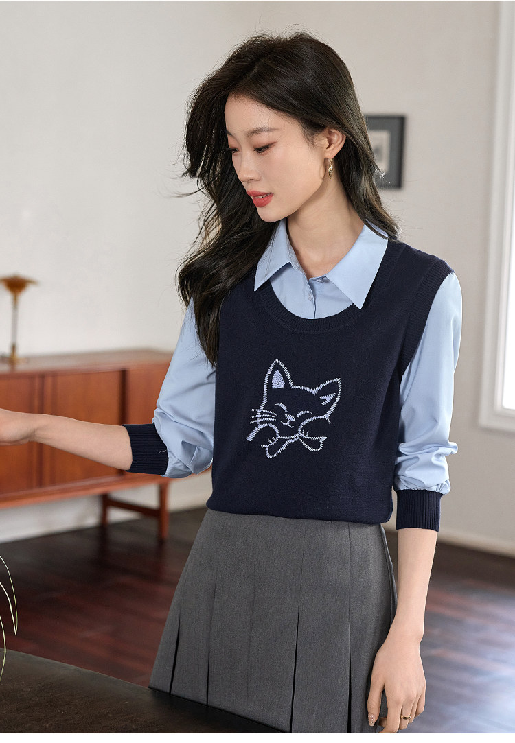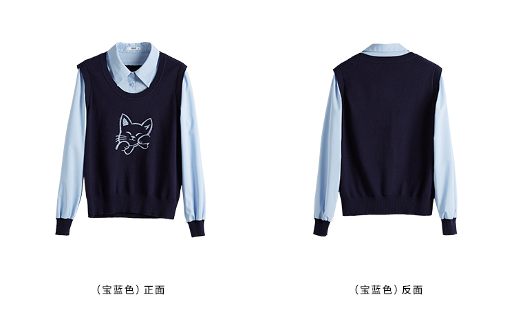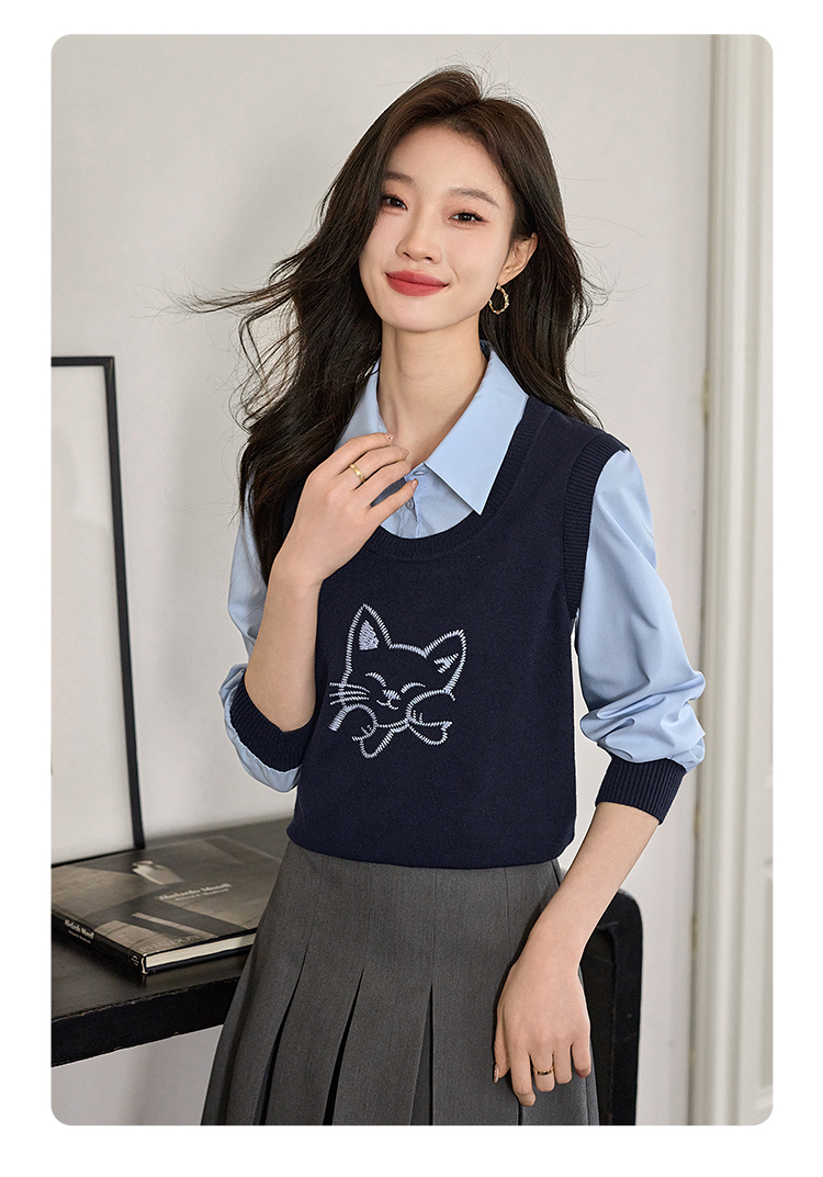 【1件72折】熙世界假两件学院风长袖POLO衬衫领猫咪刺绣针织衫女2025春新款