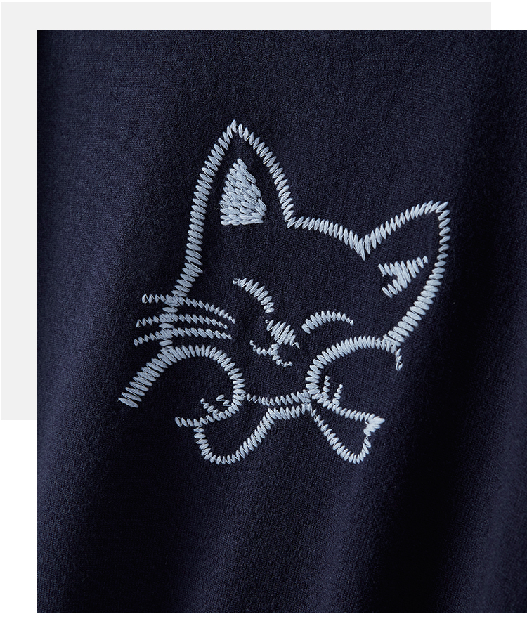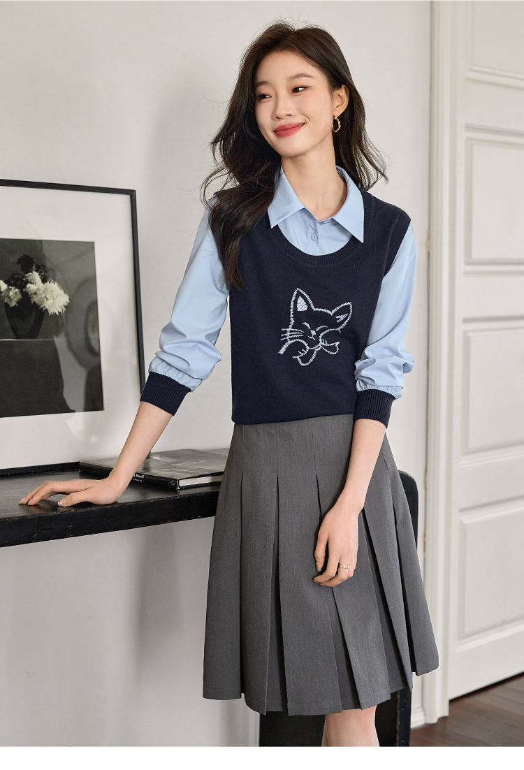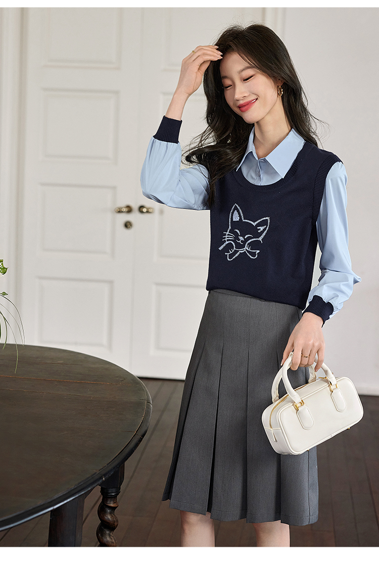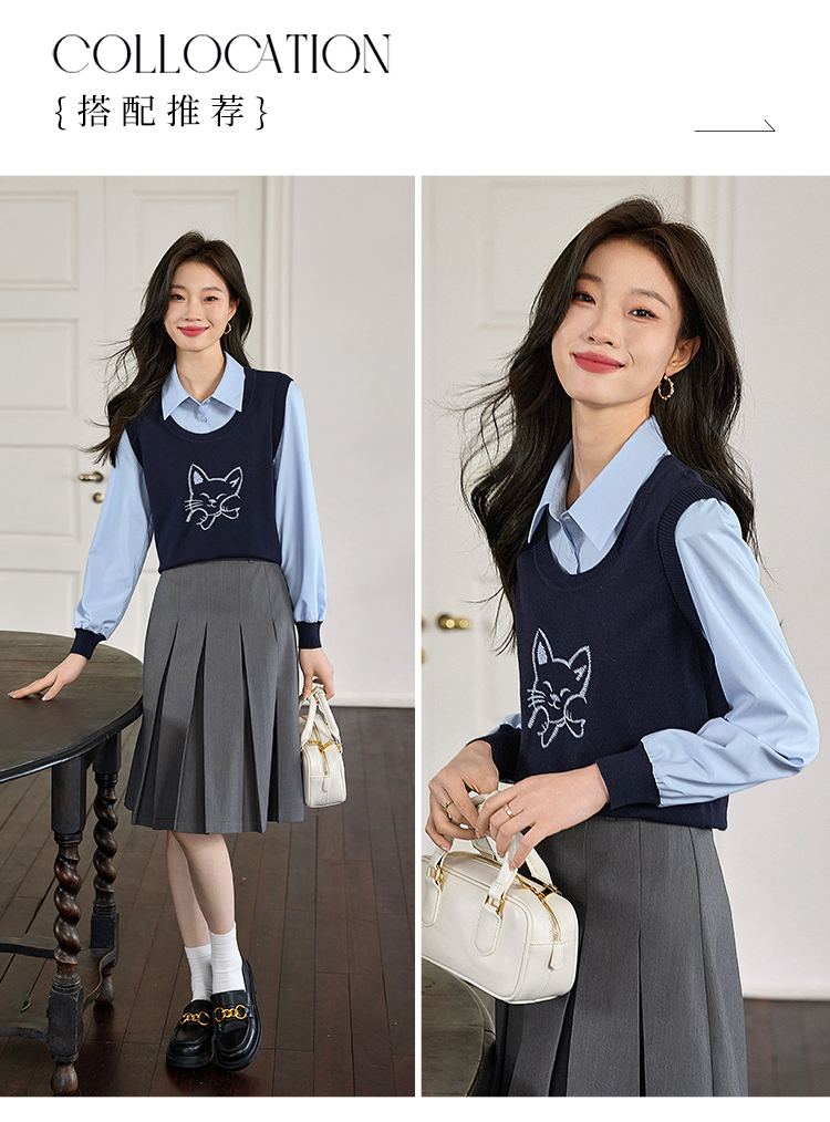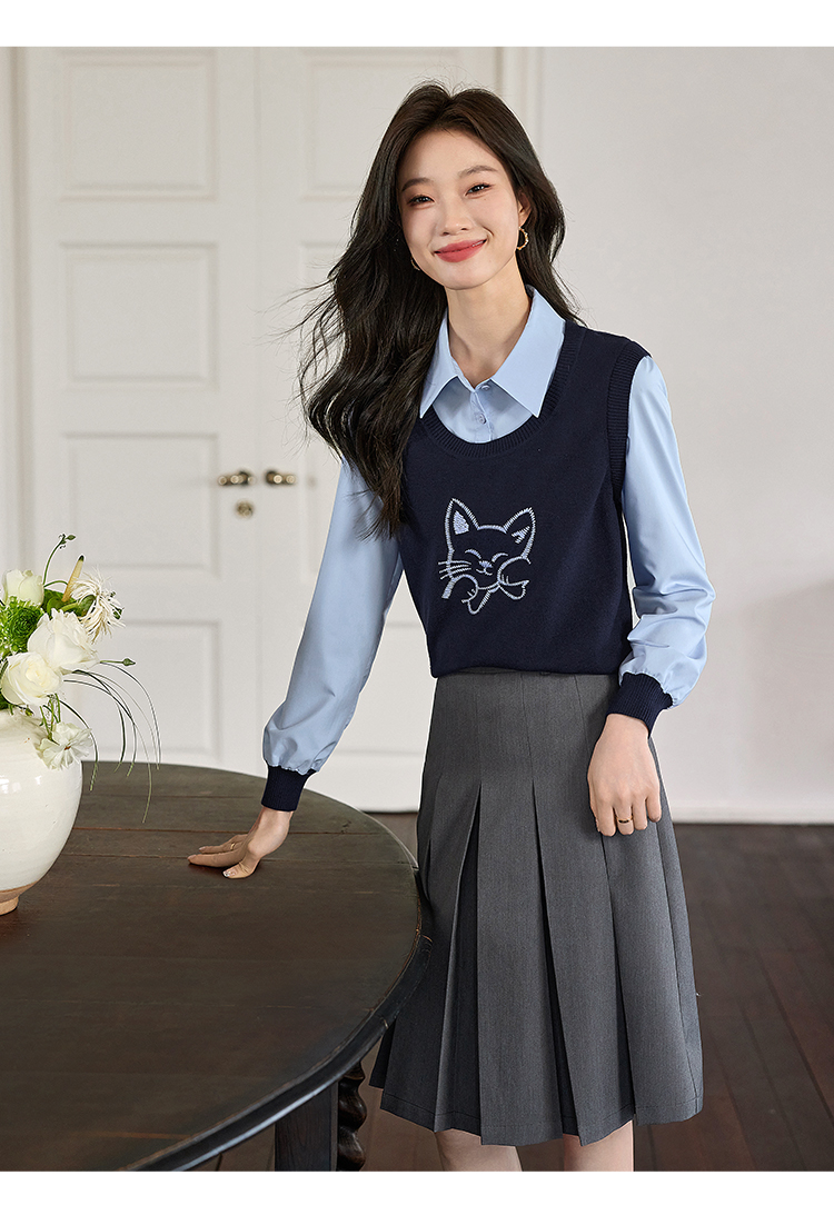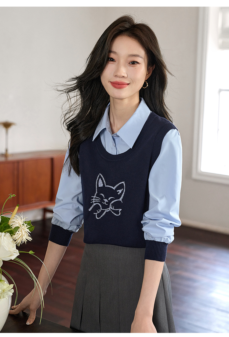 【1件72折】熙世界假两件学院风长袖POLO衬衫领猫咪刺绣针织衫女2025春新款