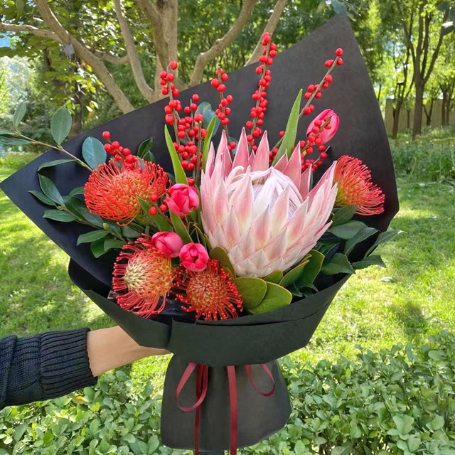 精选花材:南非粉帝王1支,红色针垫,红色郁金香,北美冬青等搭配
