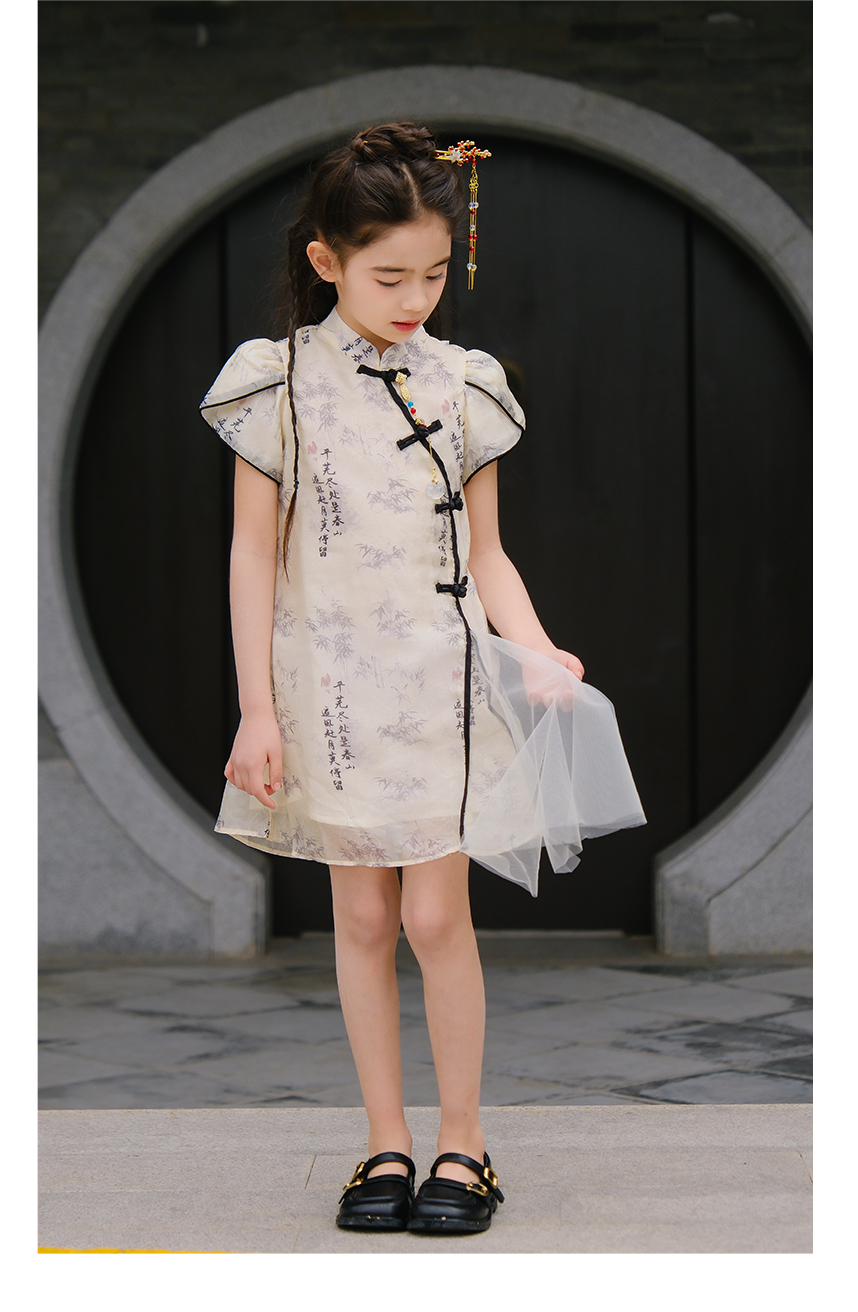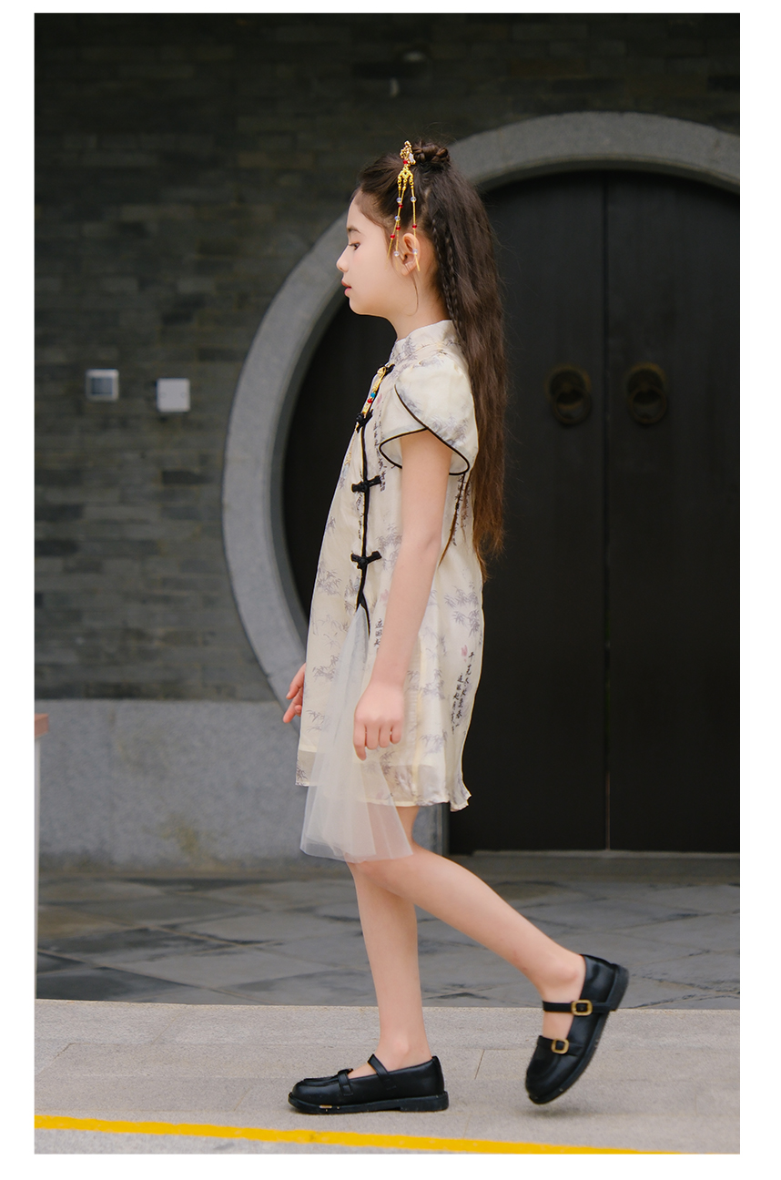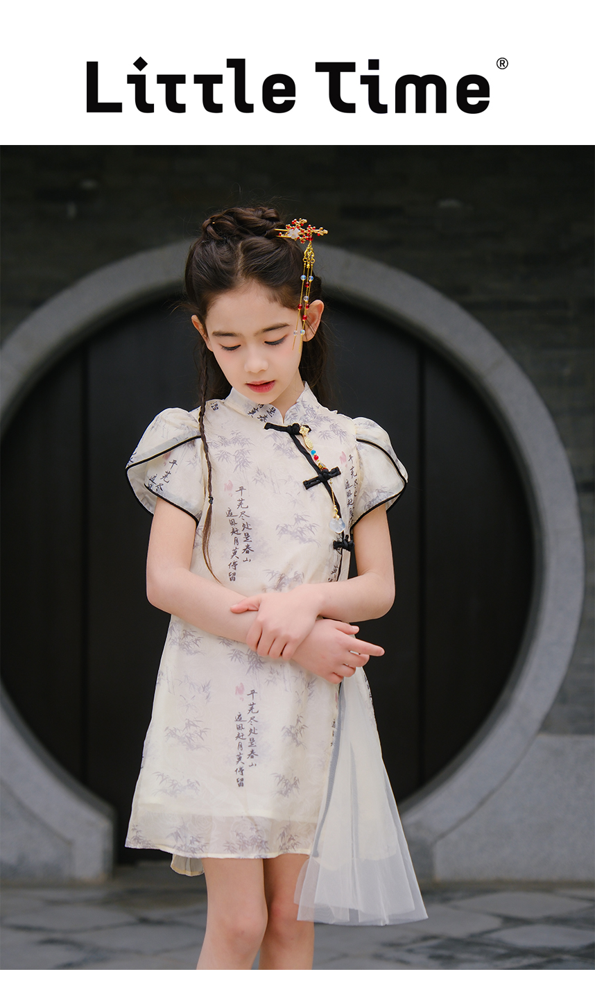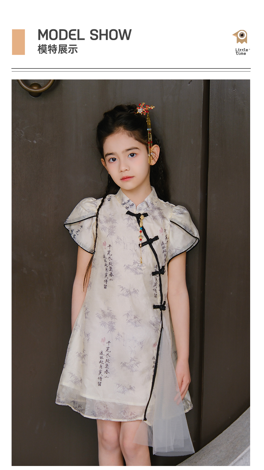 littletime女童中国风水墨旗袍短袖2024春夏新中式小女孩连衣裙